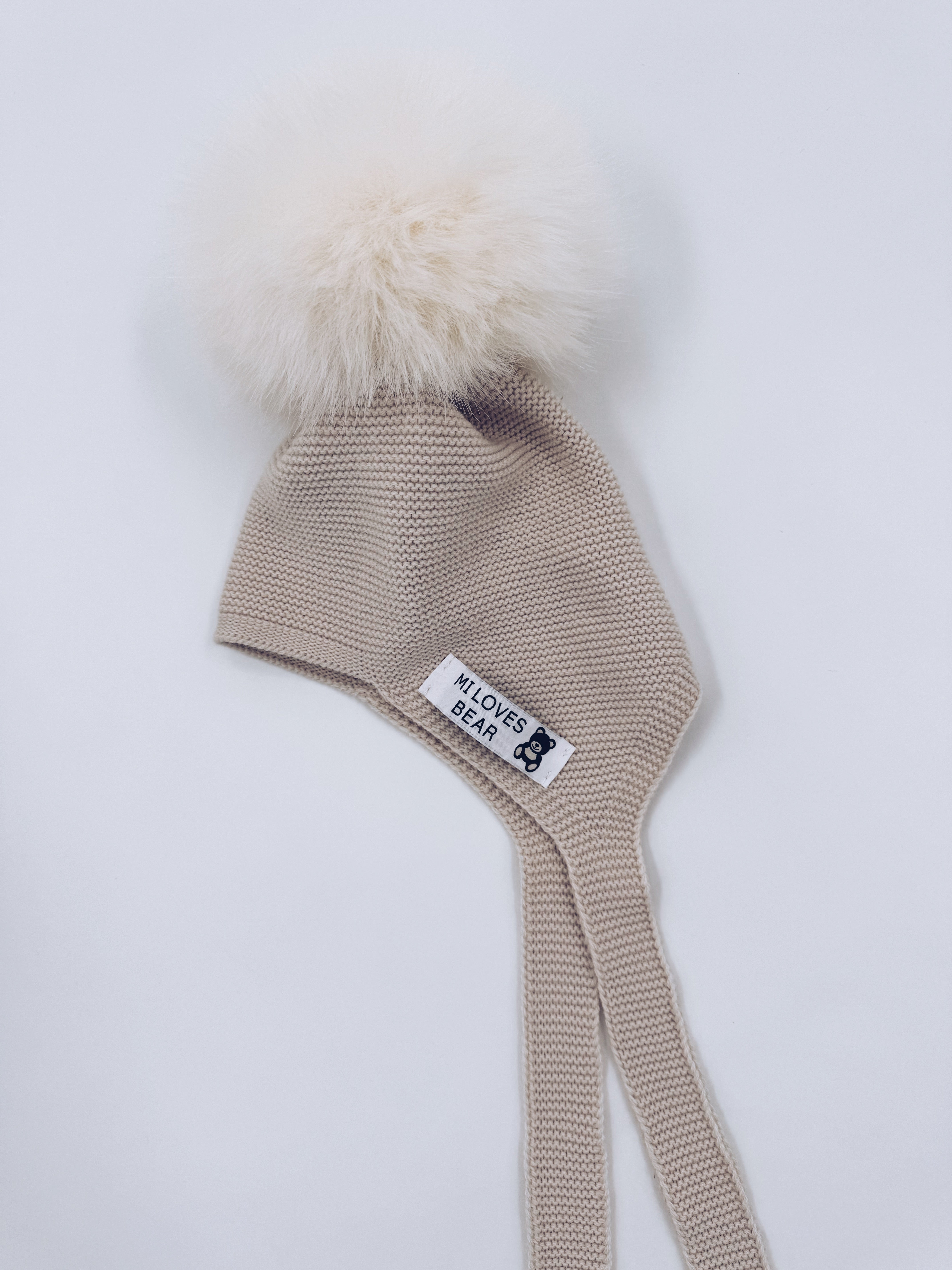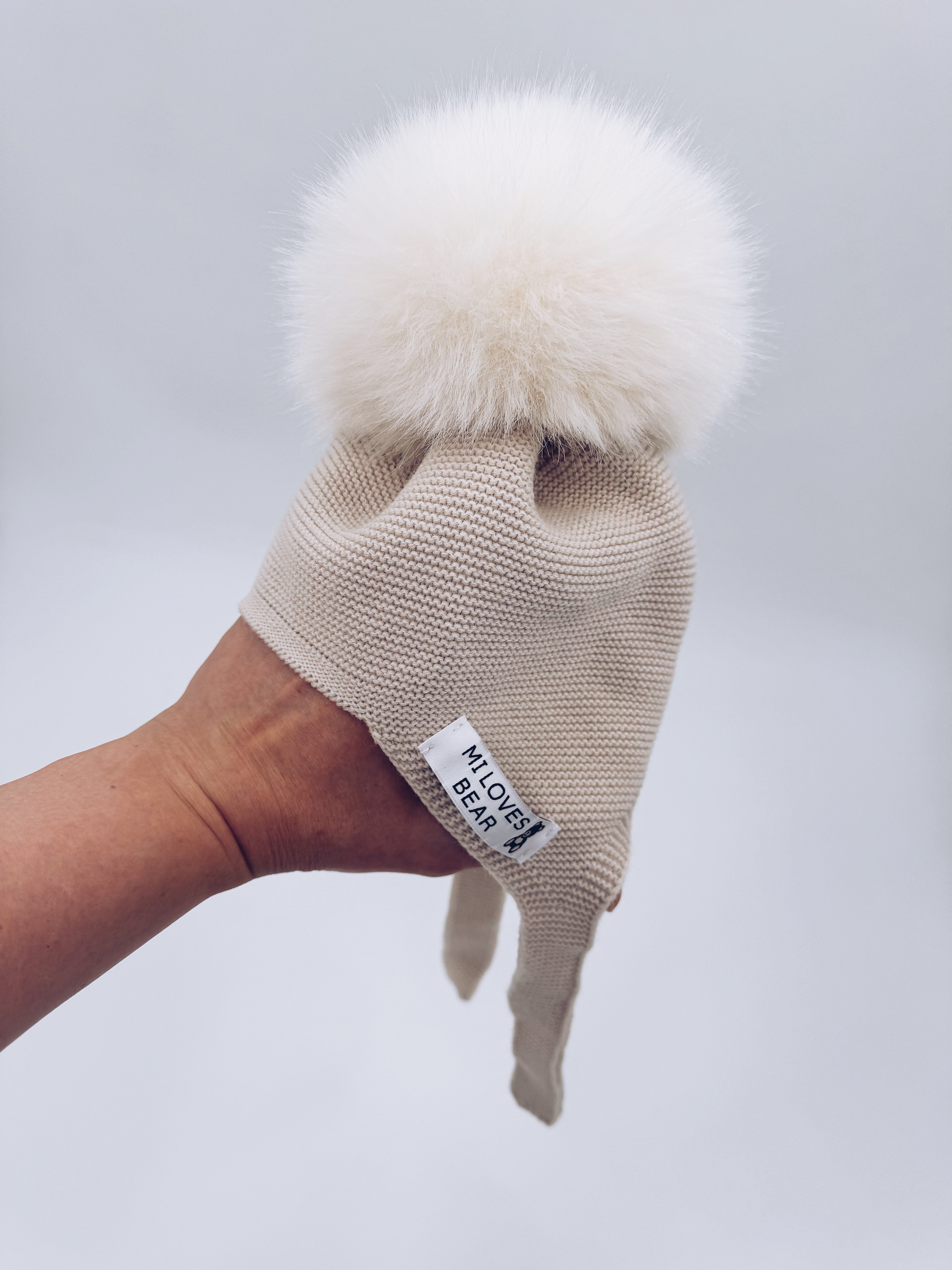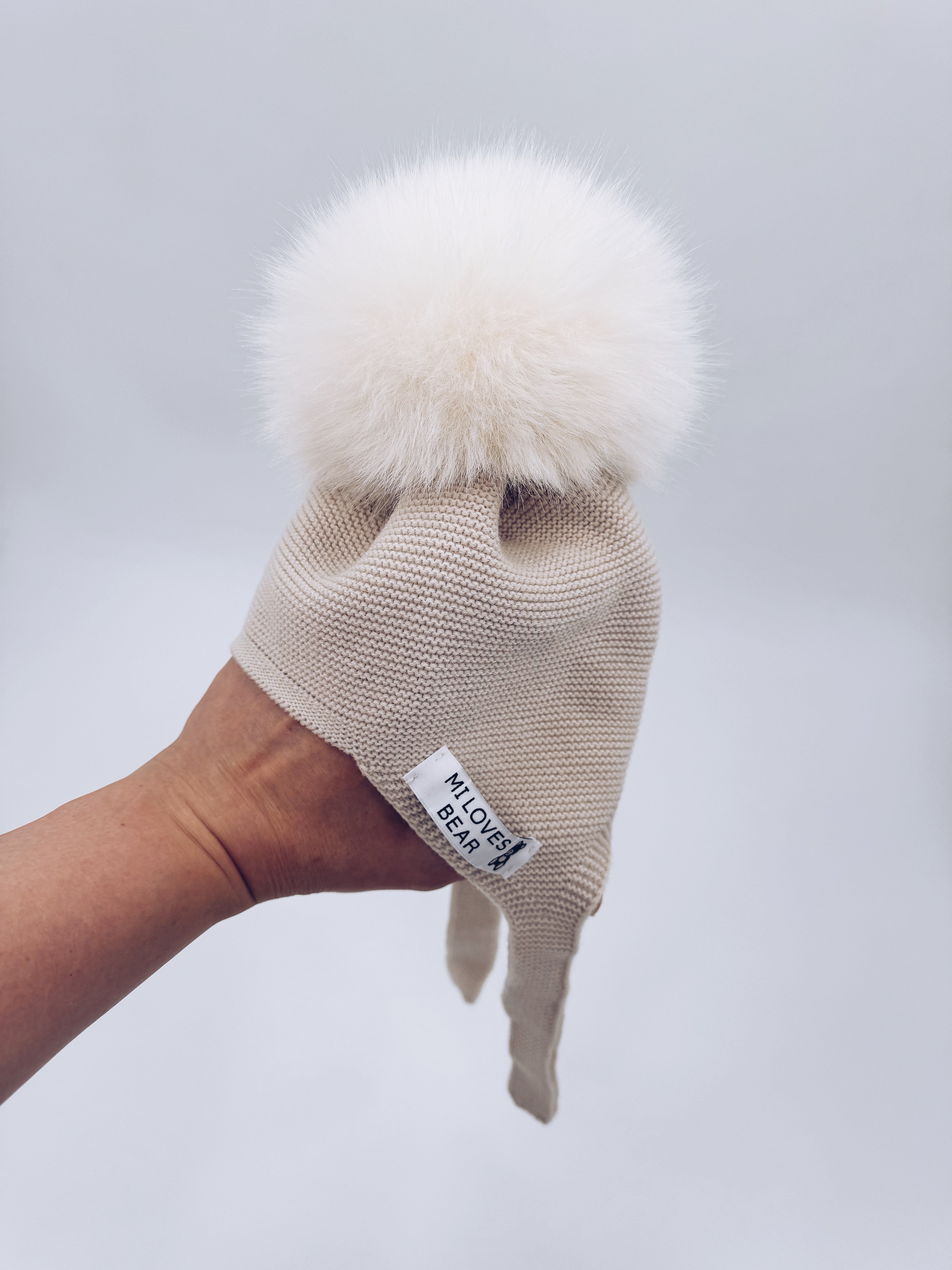 MI LOVES BEAR Luxurious knitted Pompom hat with Synthetic fur pompom in Light Cream