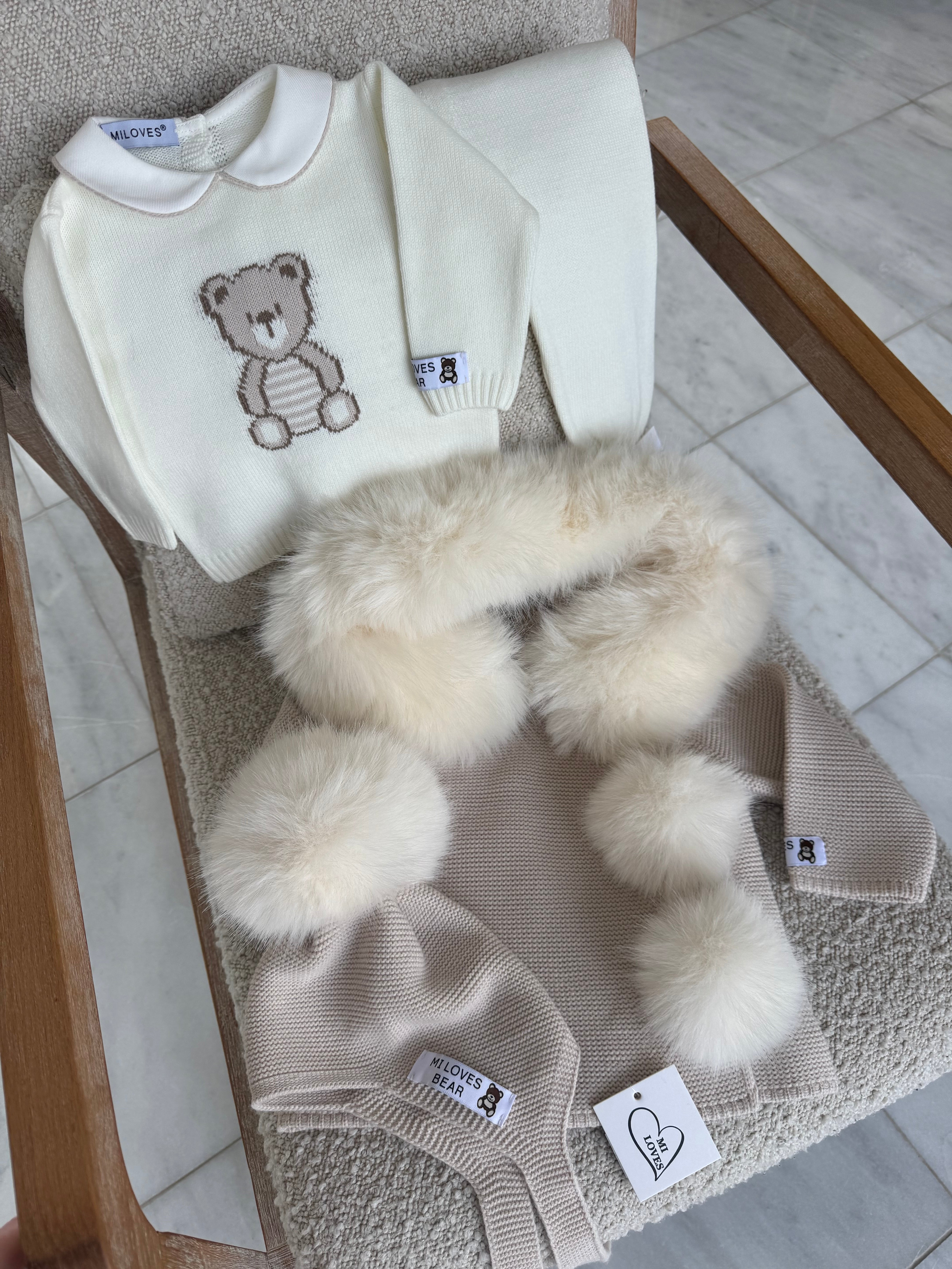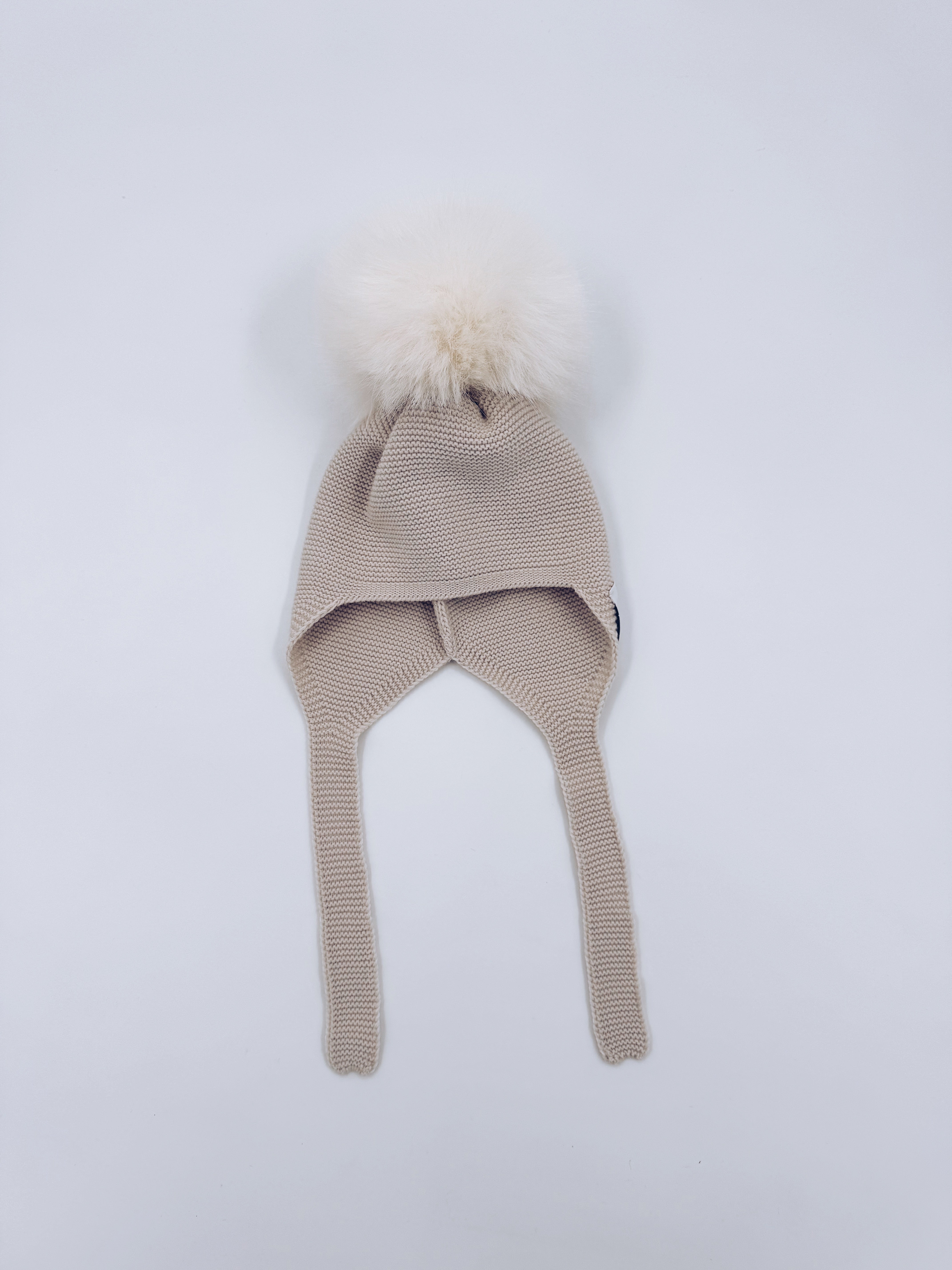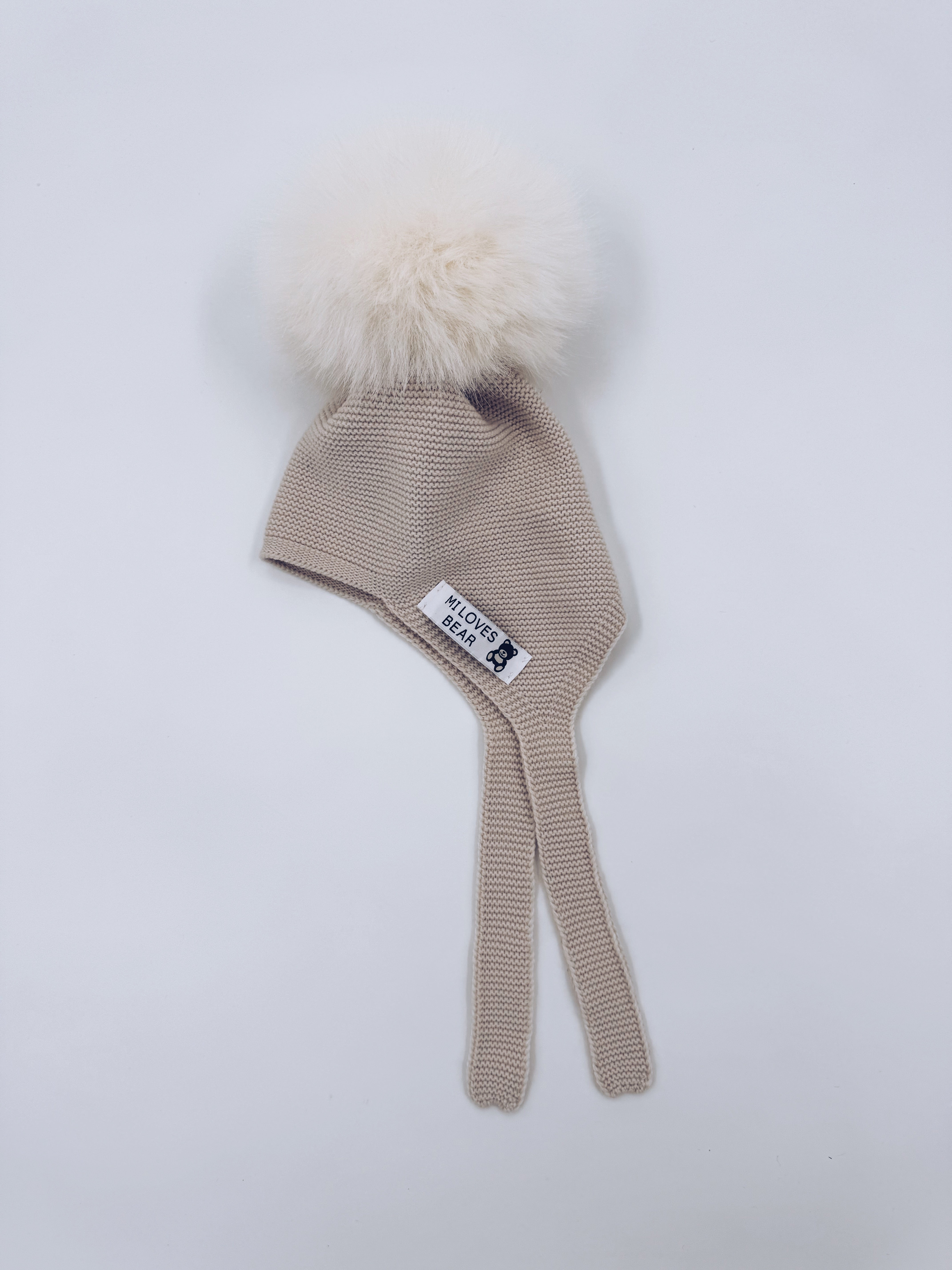 MI LOVES BEAR Luxurious knitted Pompom hat with Synthetic fur pompom in Light Cream