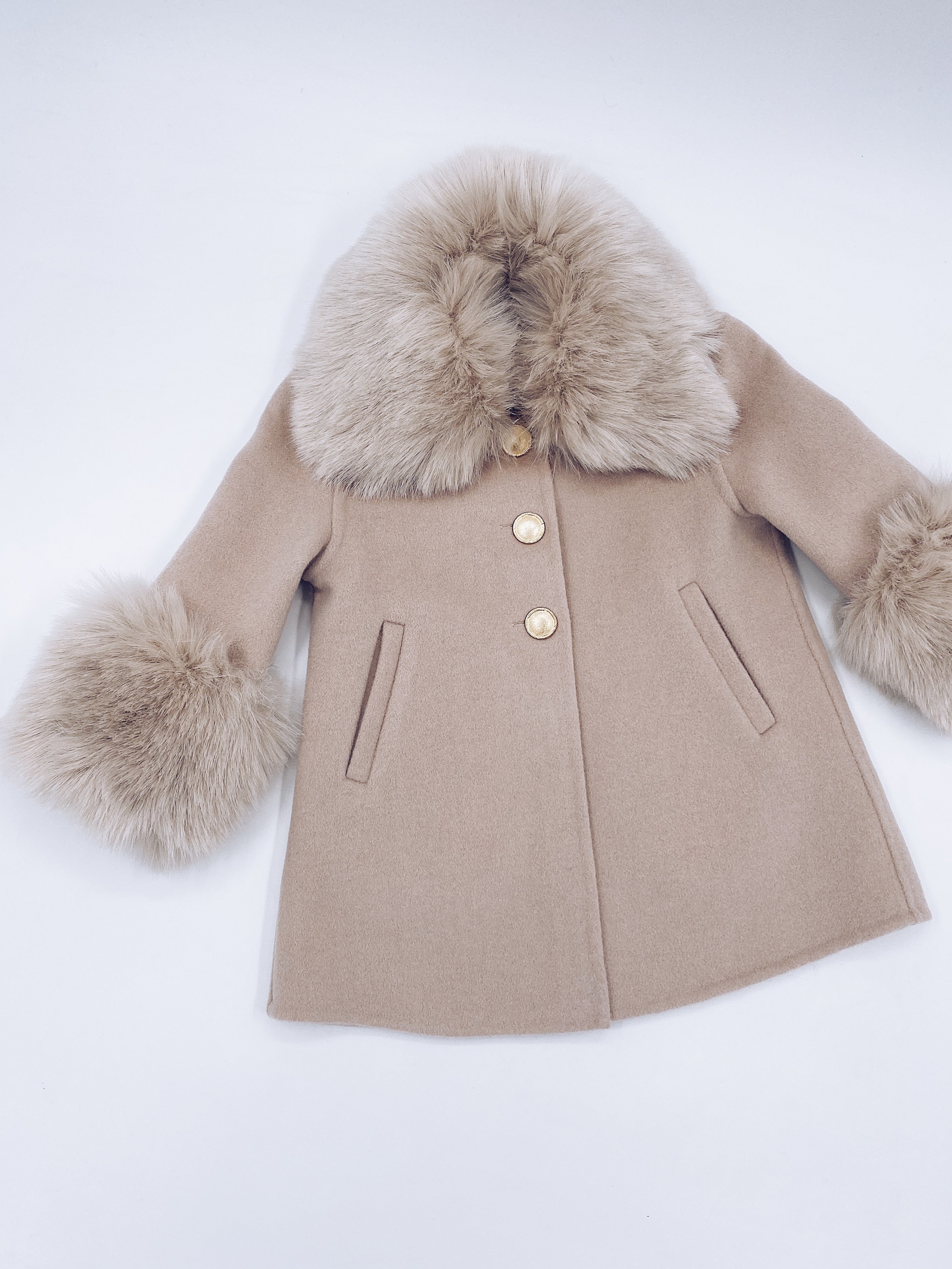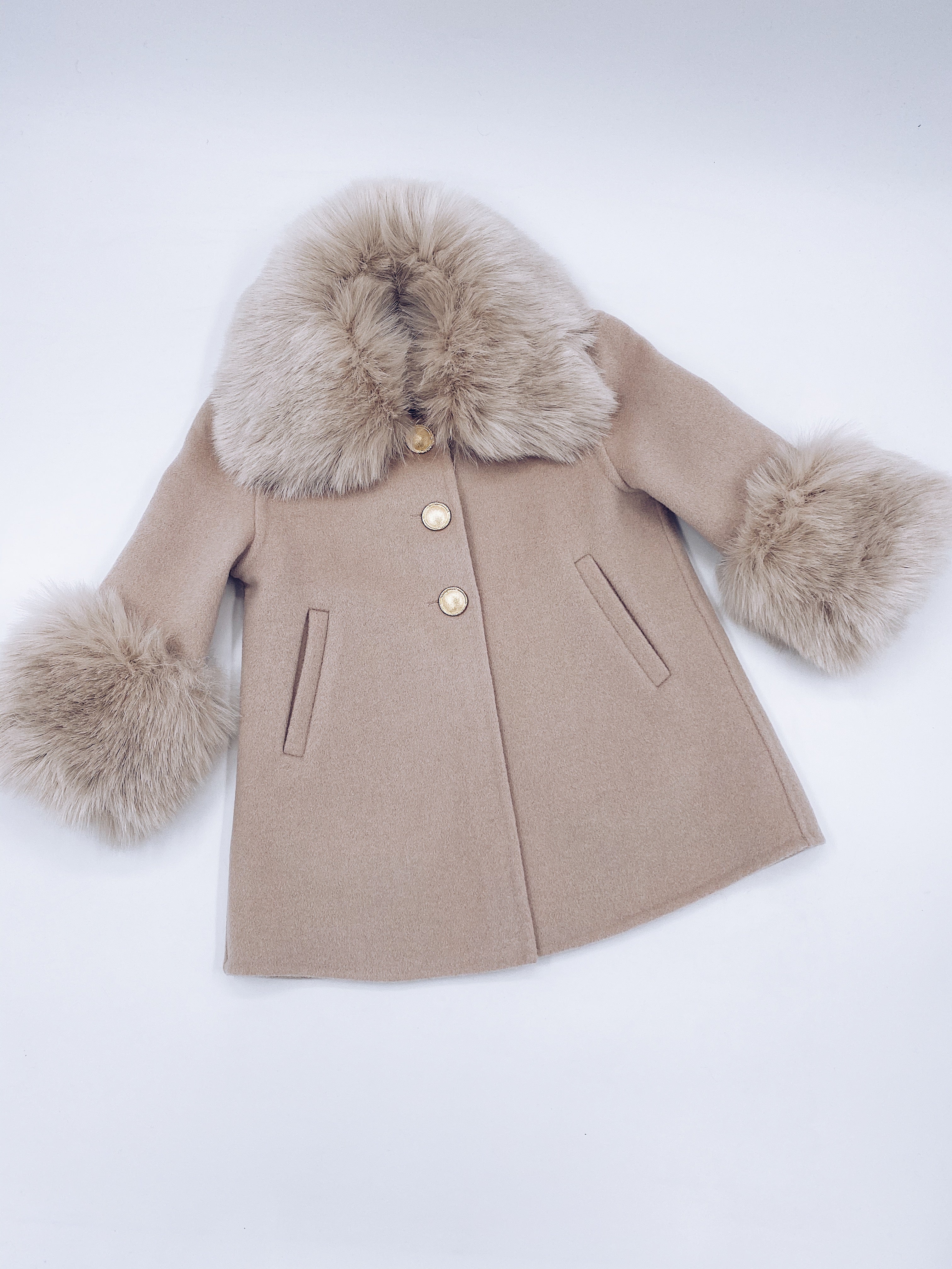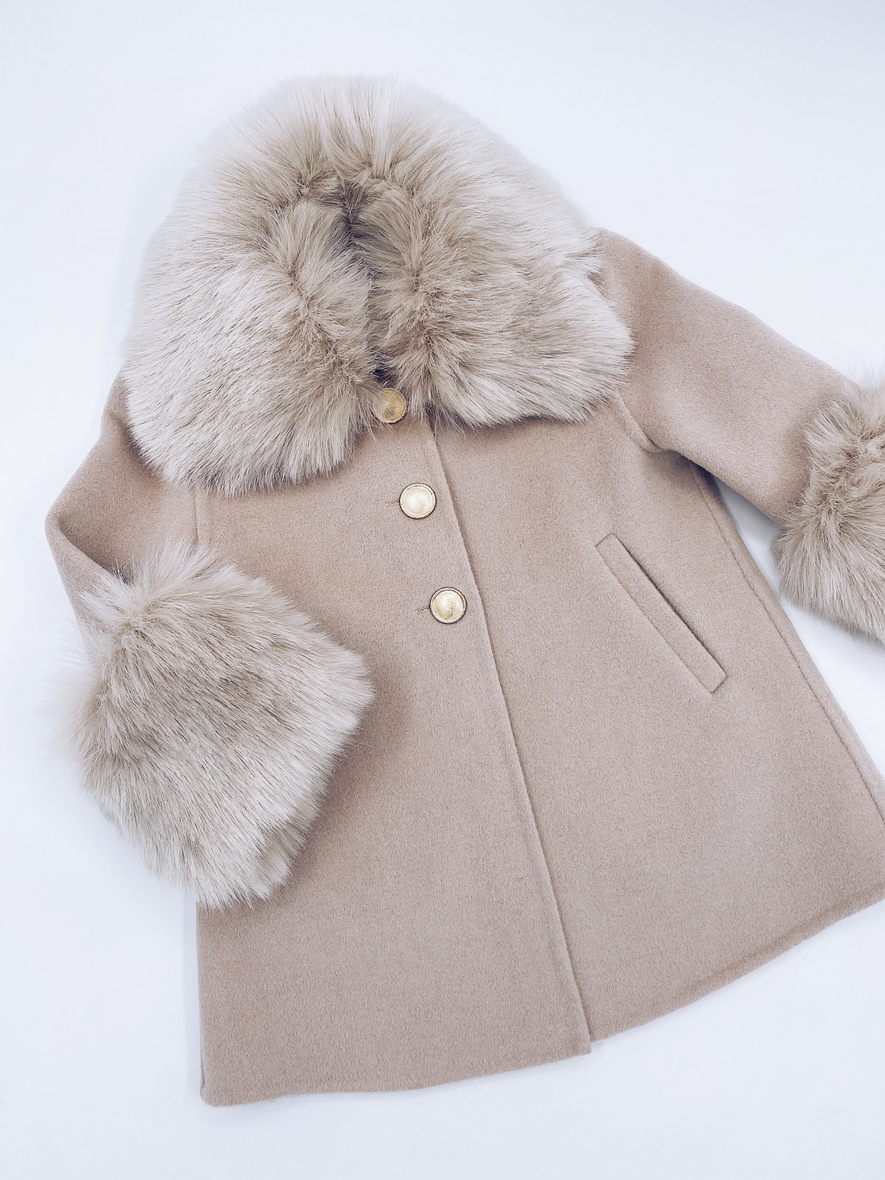 MI LOVES SIGNATURE Luxurious cashmere kids coat with Synthetic fur trim and cuffs in Beautiful Nude colour.