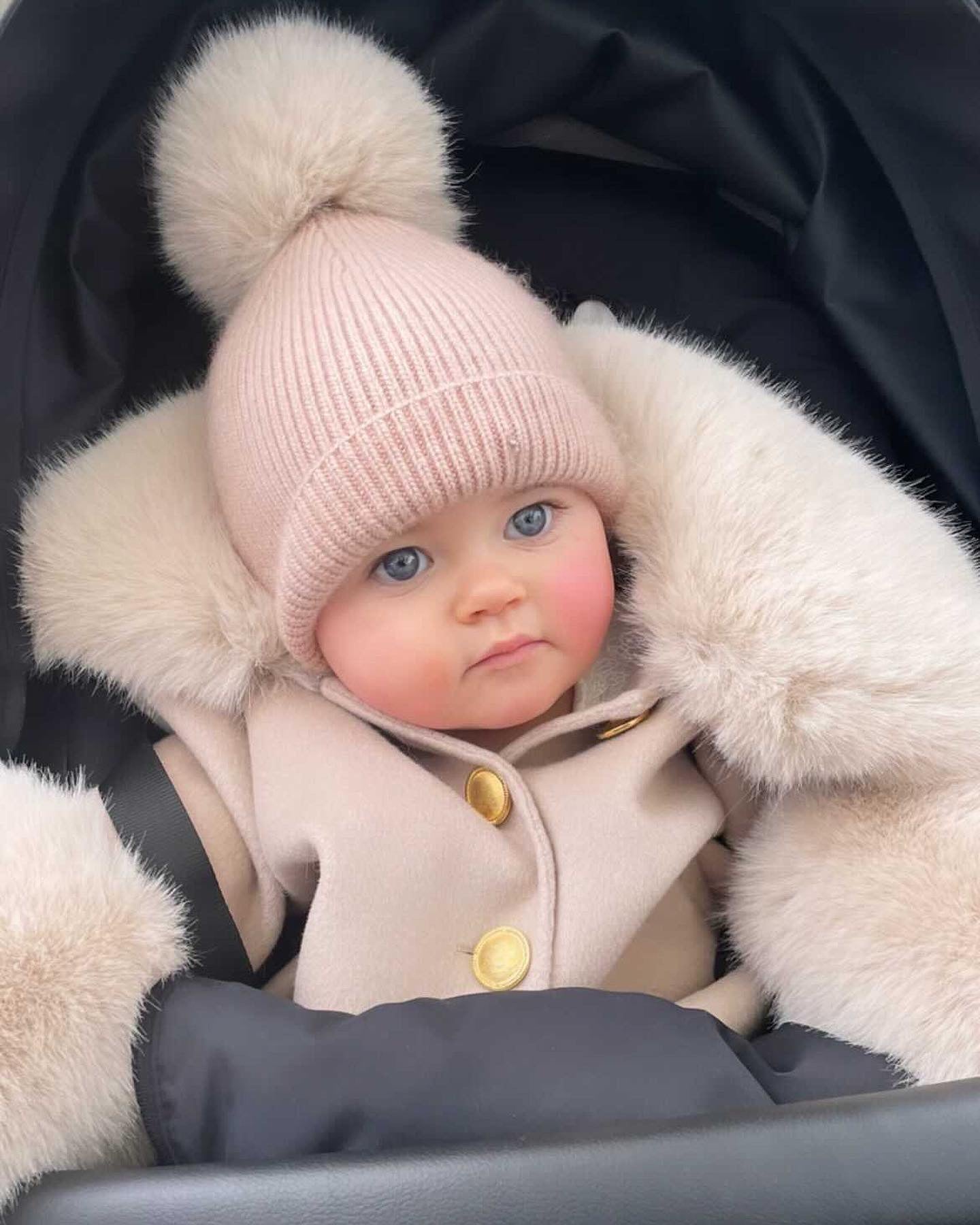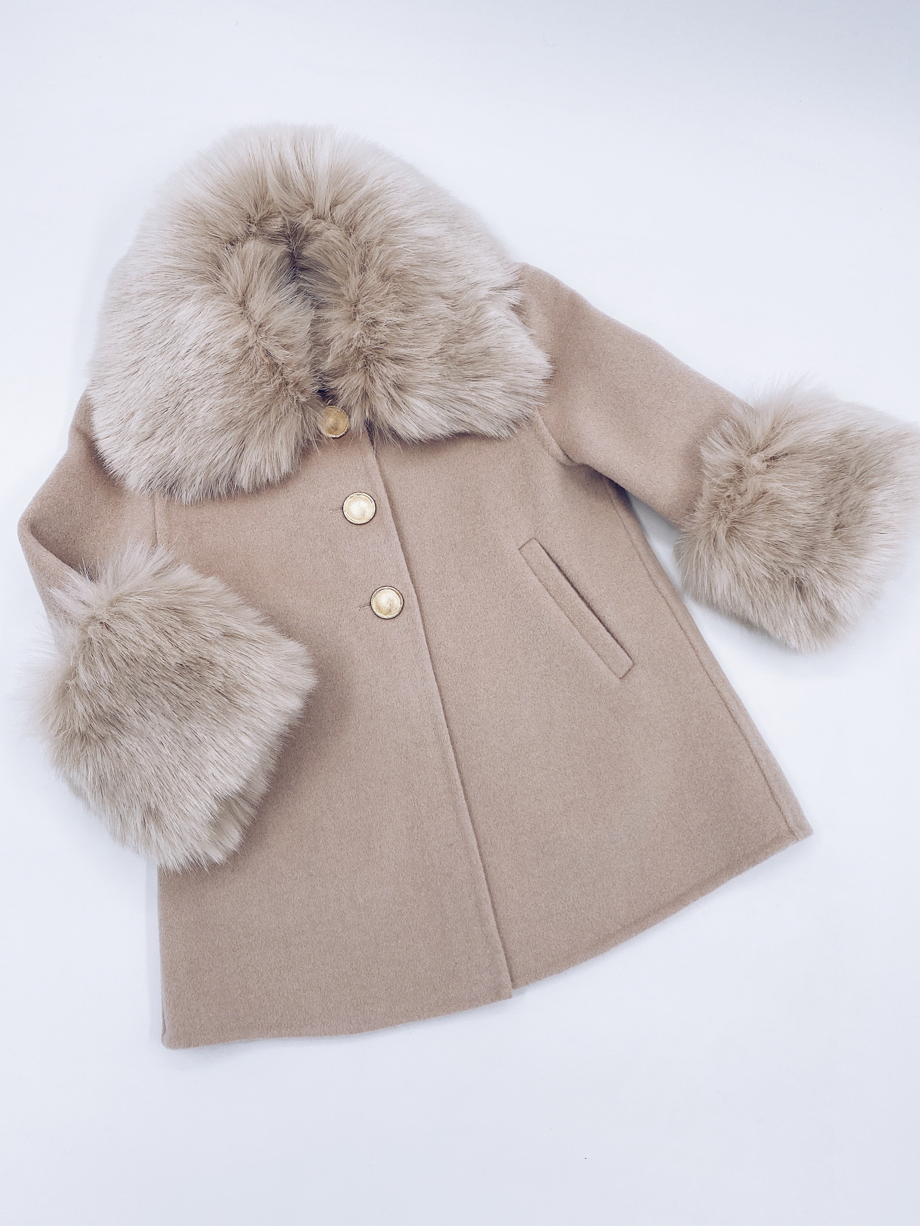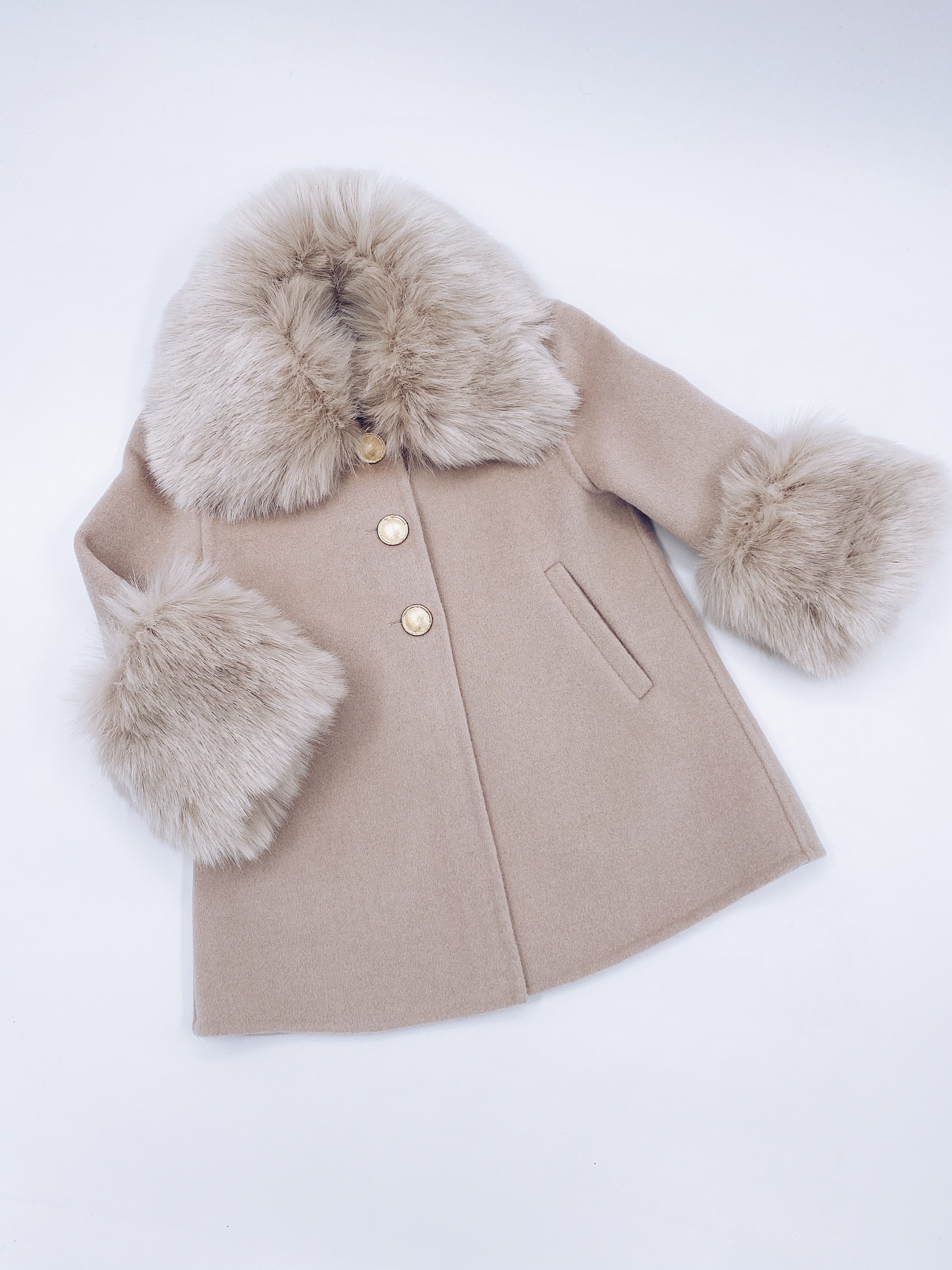 MI LOVES SIGNATURE Luxurious cashmere kids coat with Synthetic fur trim and cuffs in Beautiful Nude colour.