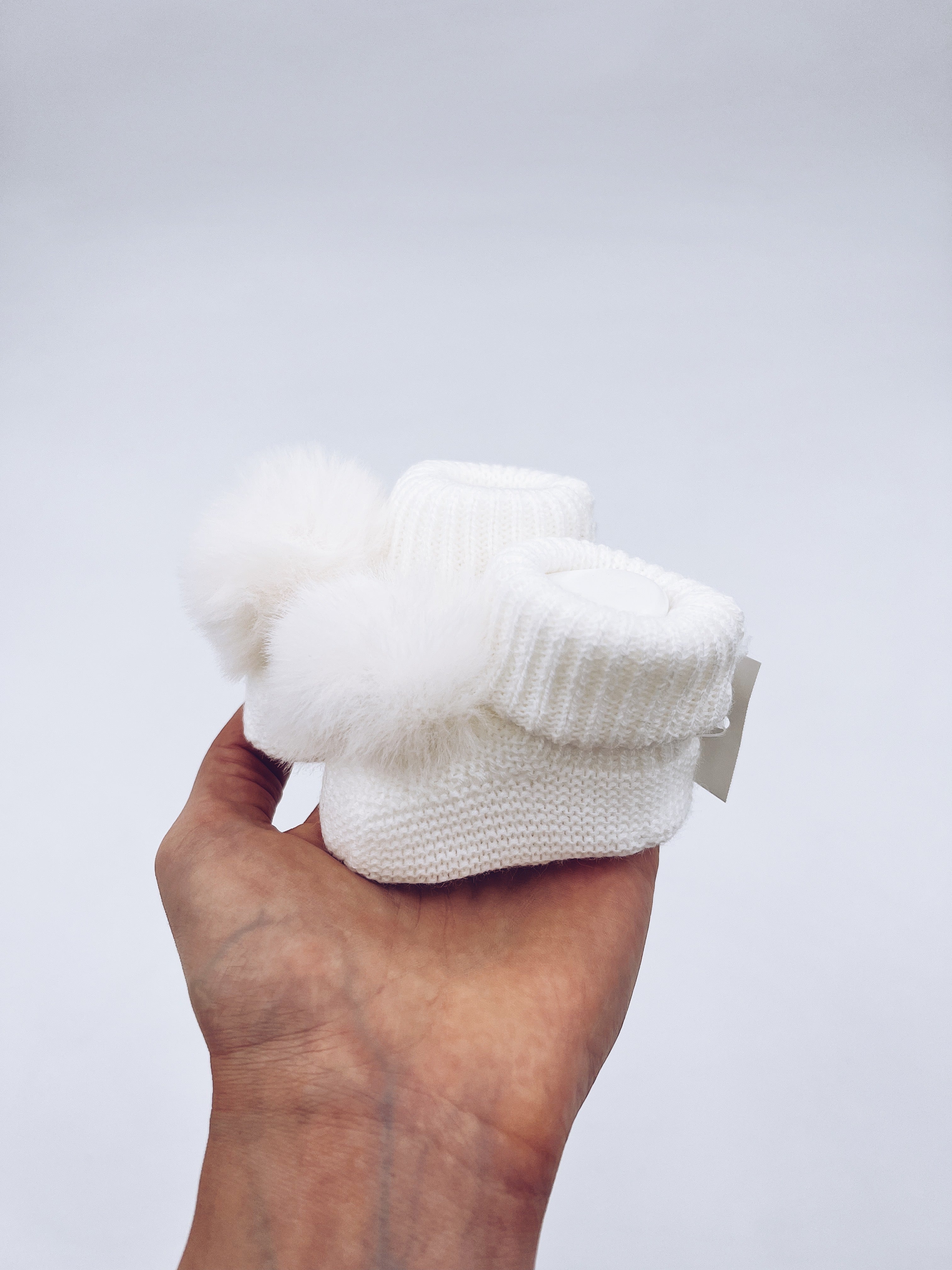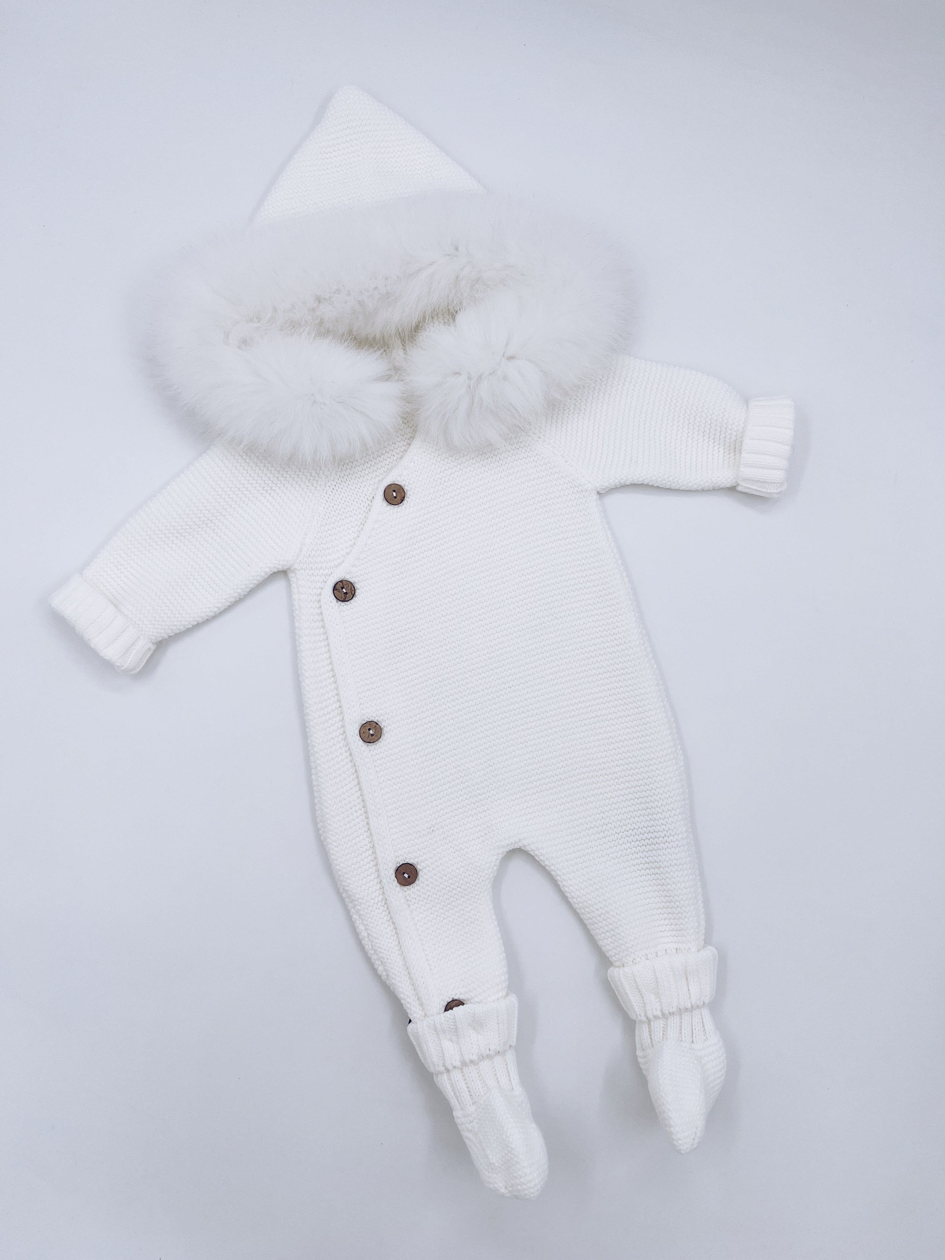 White Knitted Baby Pramsuit with Luxurious Fox fur trim