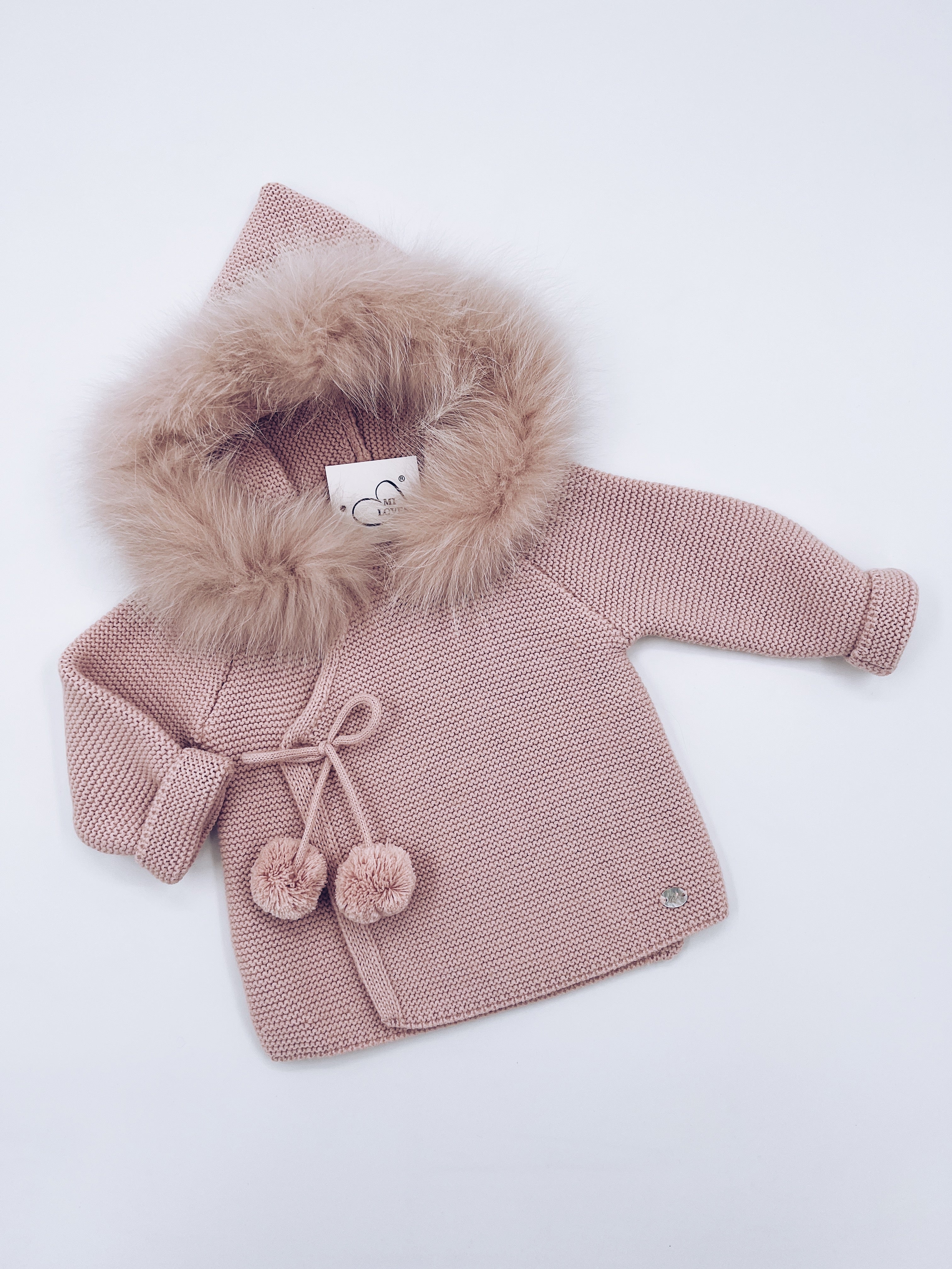 Beautiful Dusty pink knitted Cardigan with Luxurious fur trim.