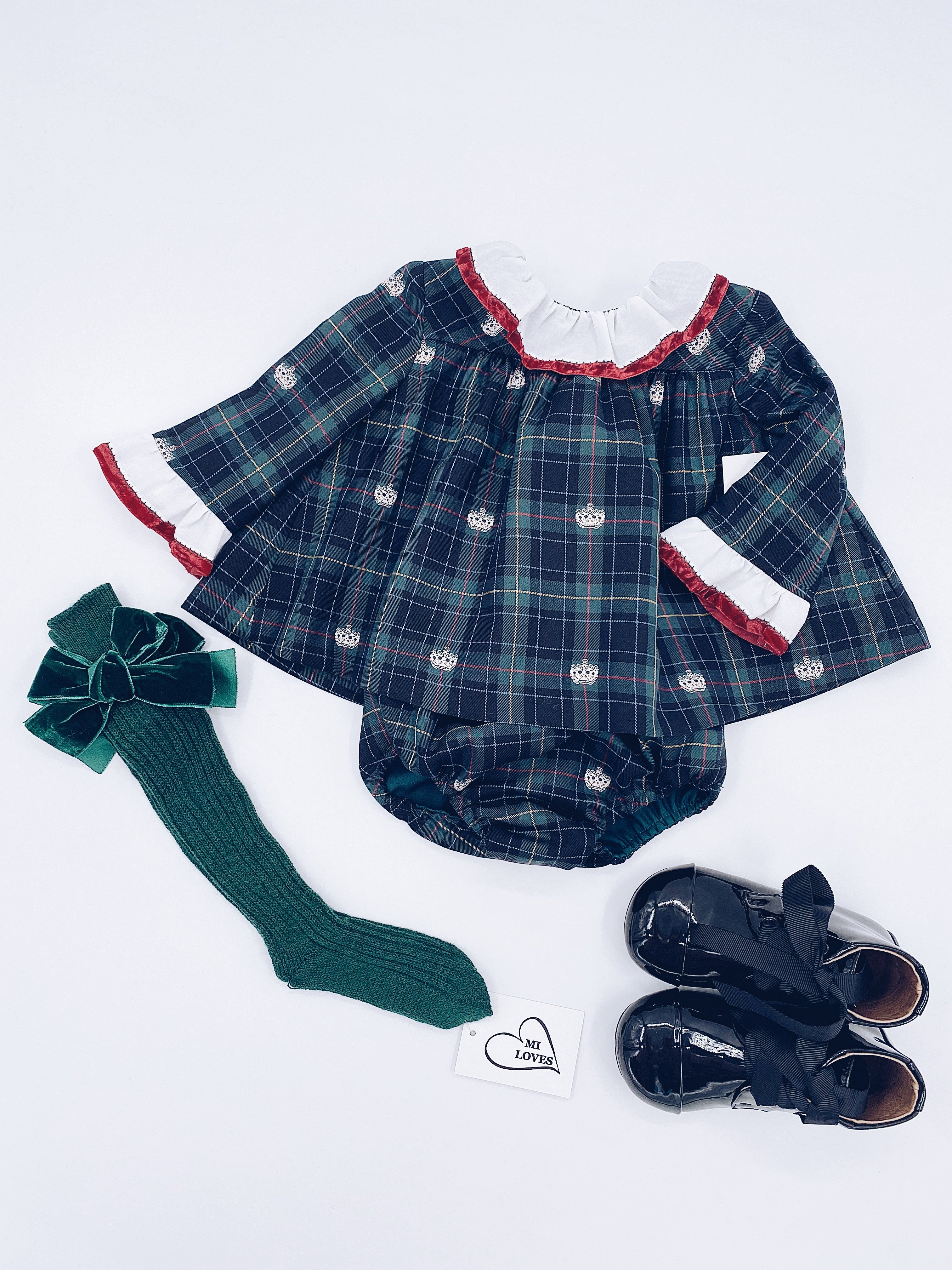 Beautiful Green tartan dress and bloomers 2 piece set with Crown details