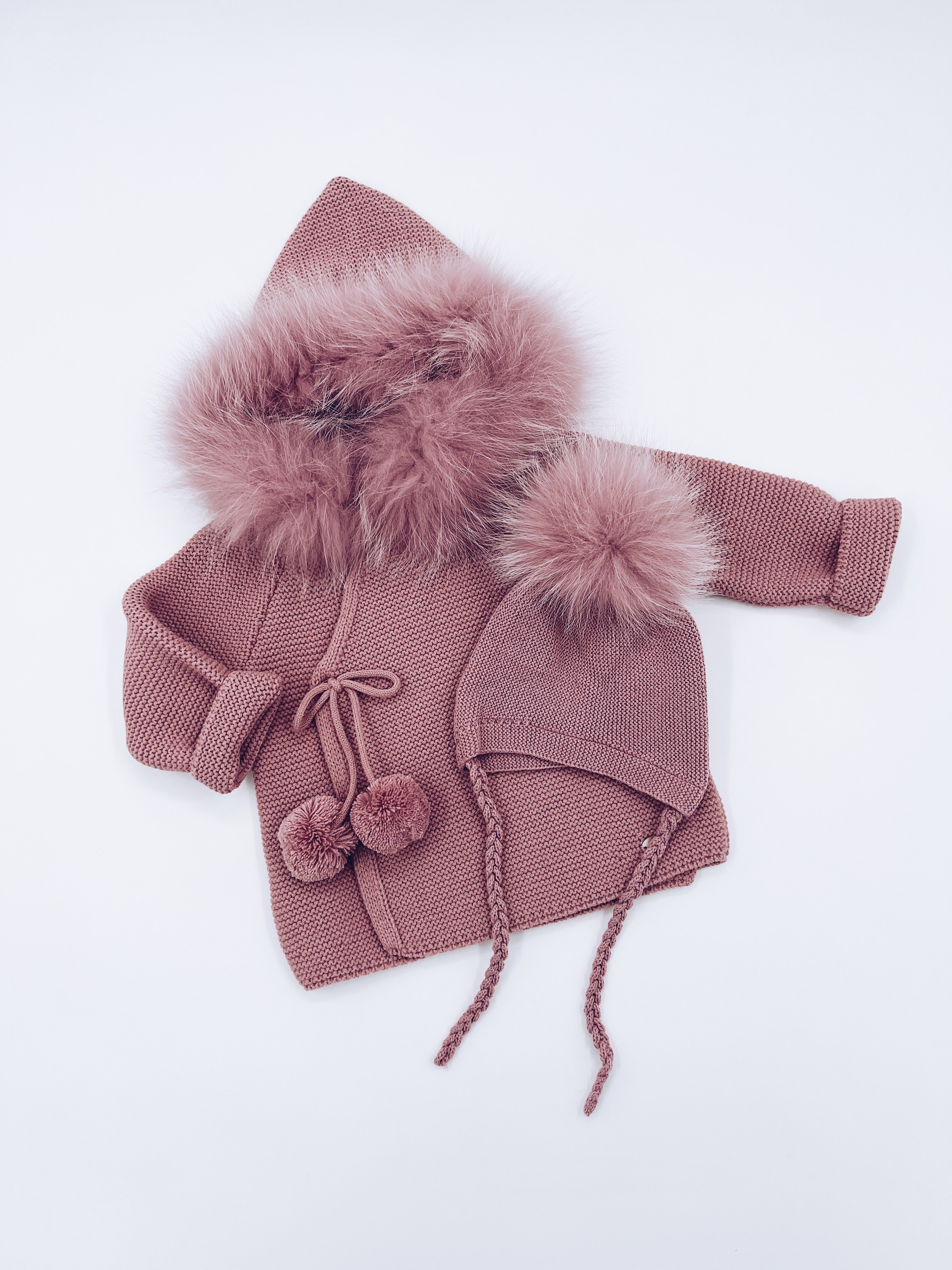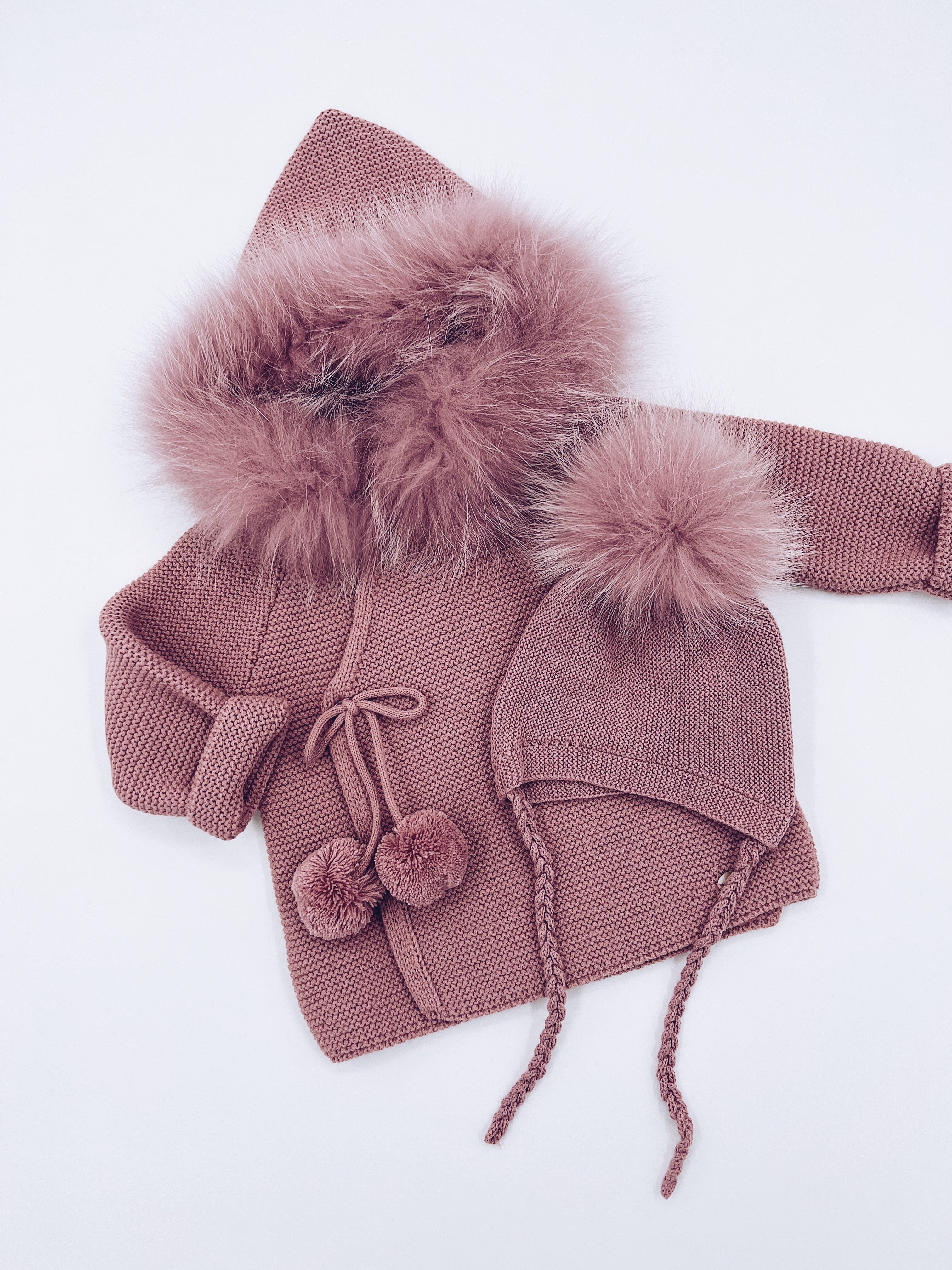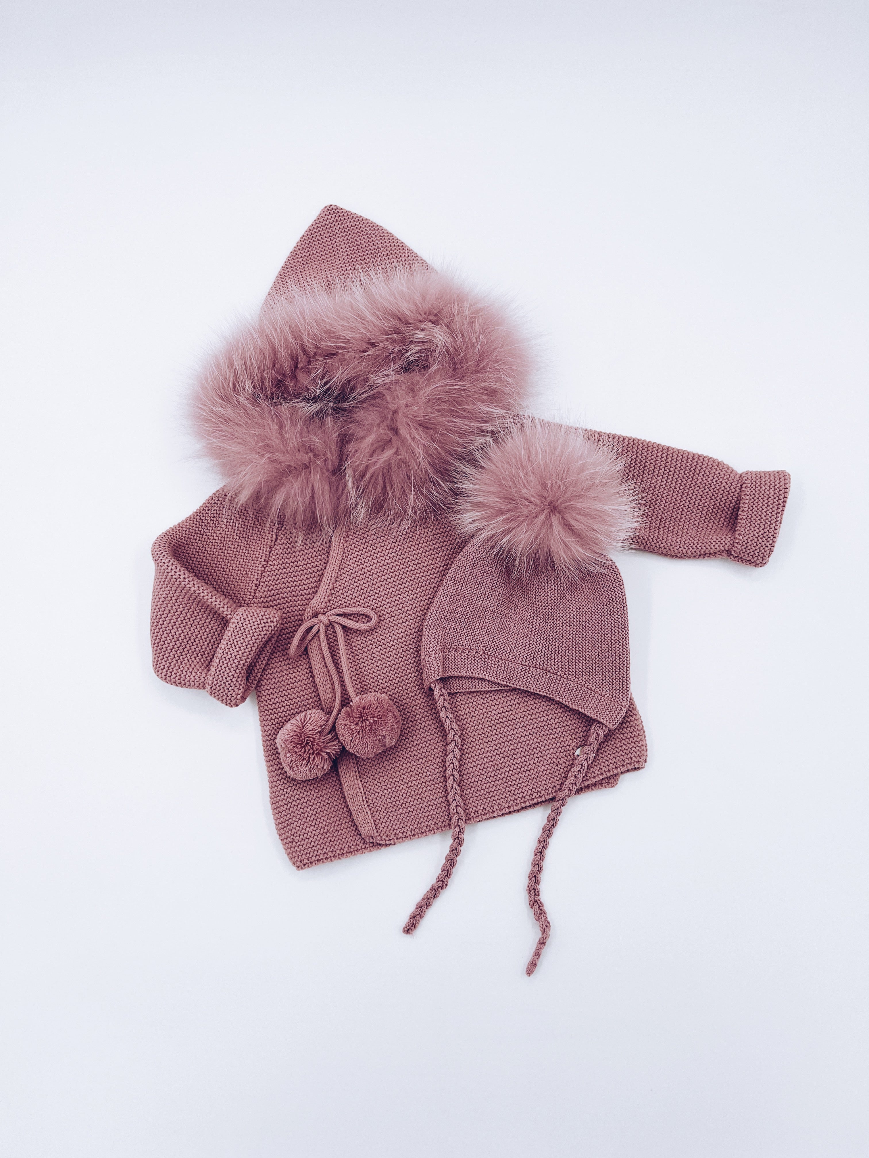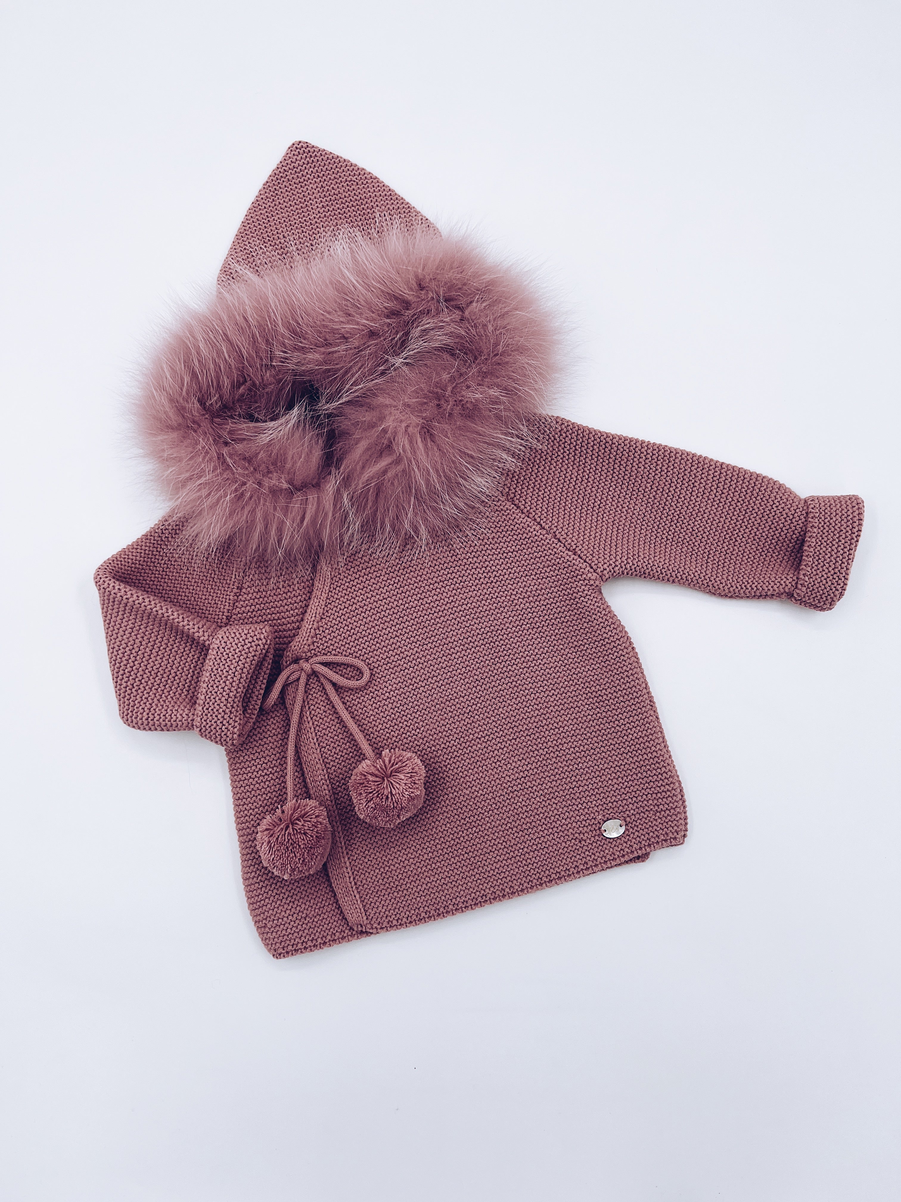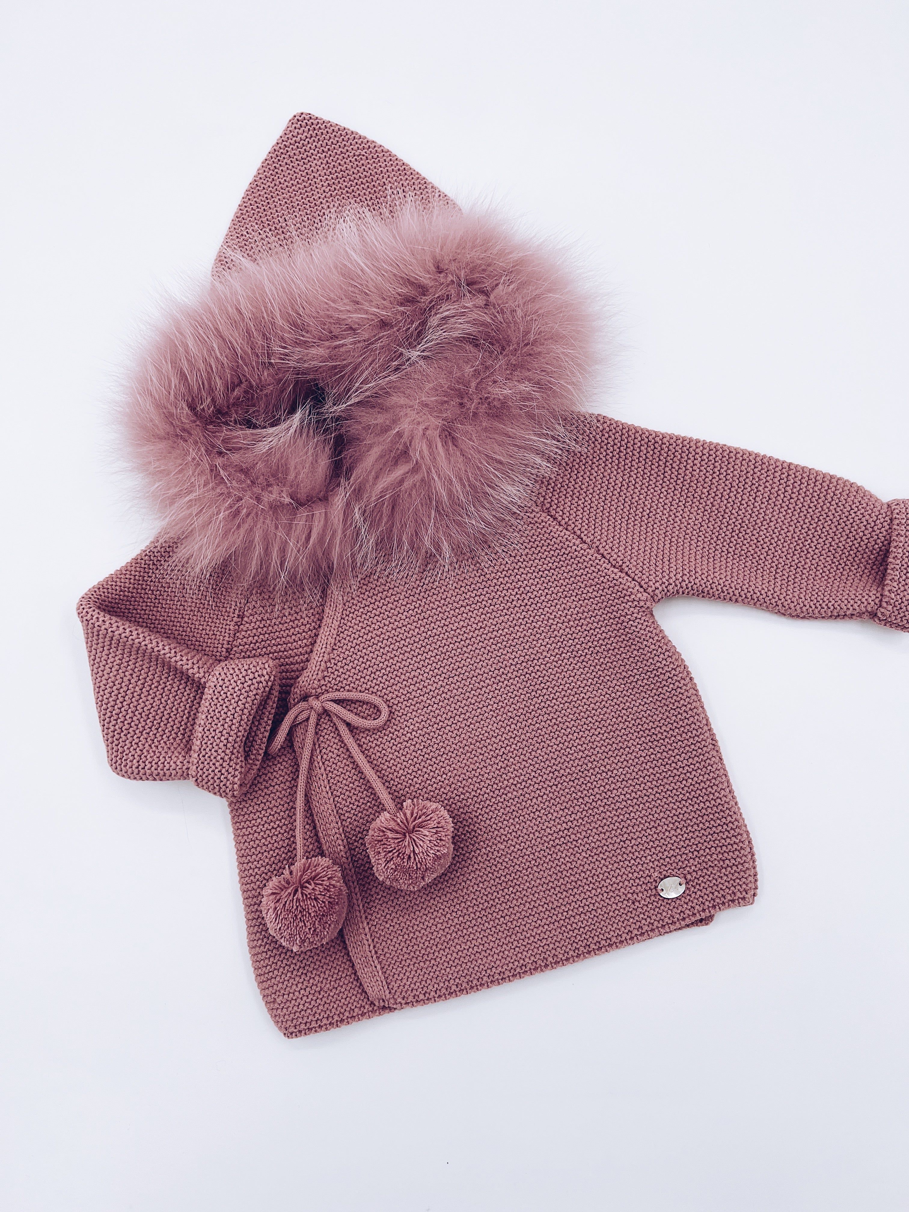 Beautiful Raspberry Pink knitted Cardigan with Luxurious fur trim.