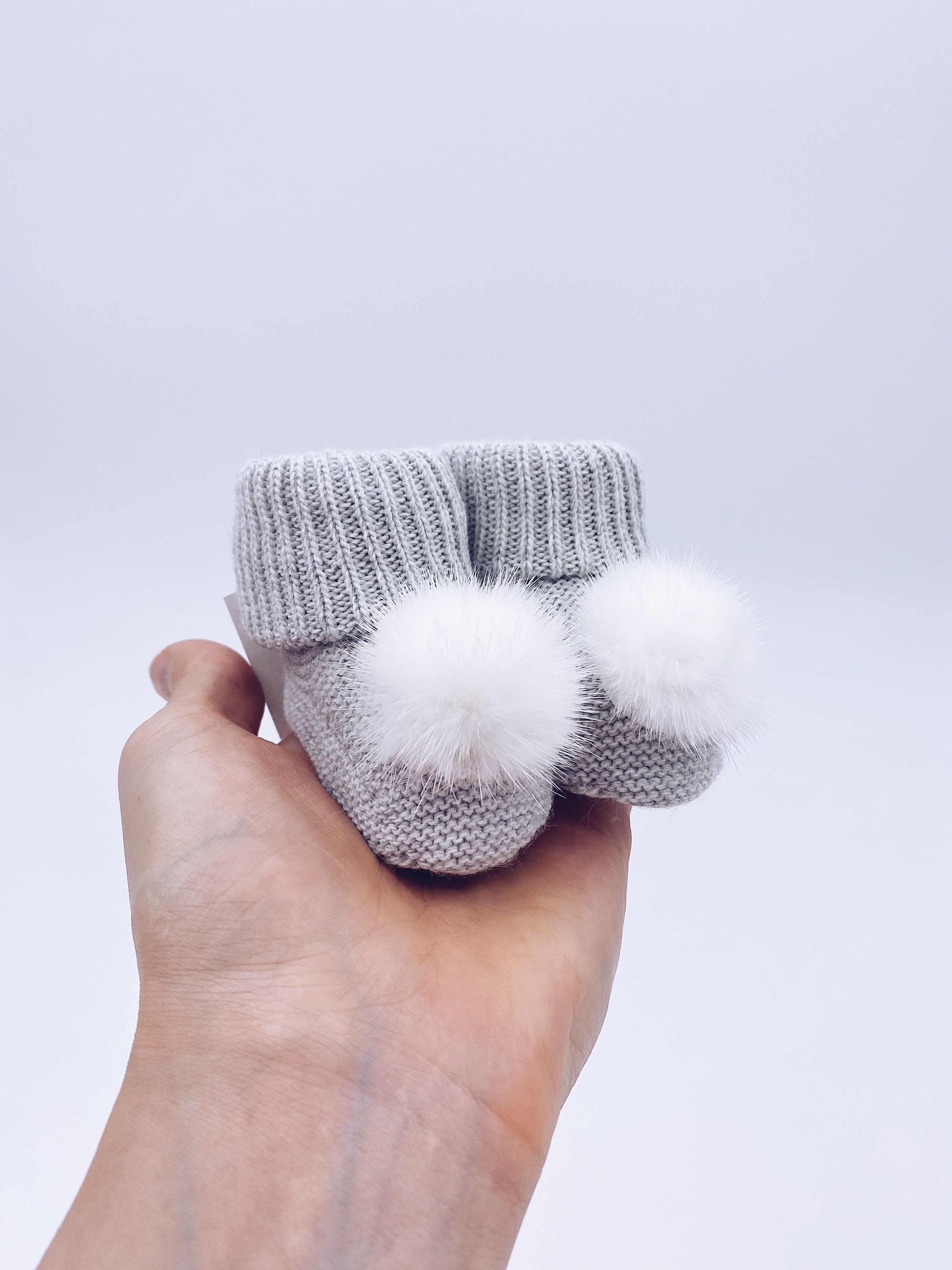 Grey knitted Pompom booties.