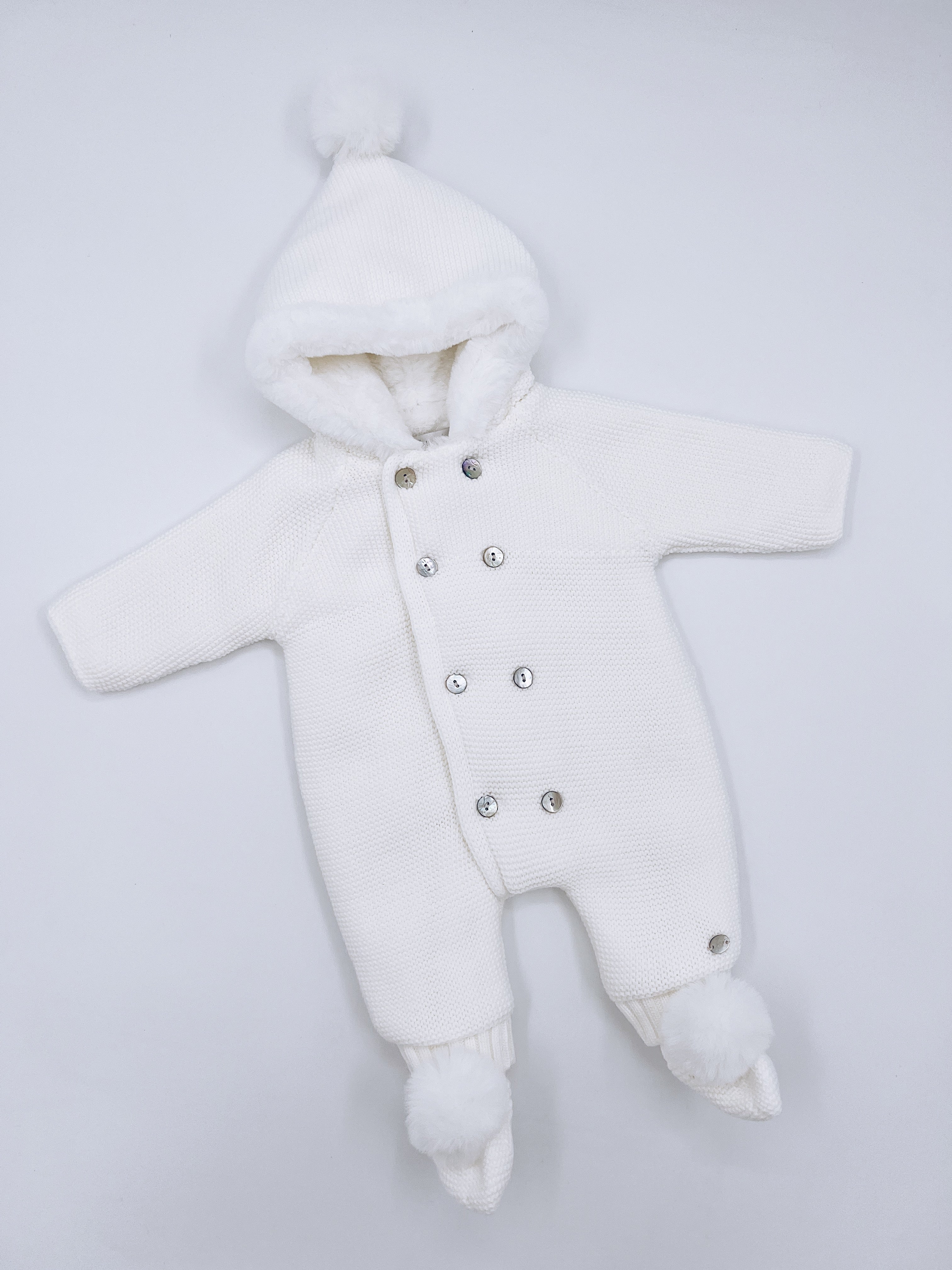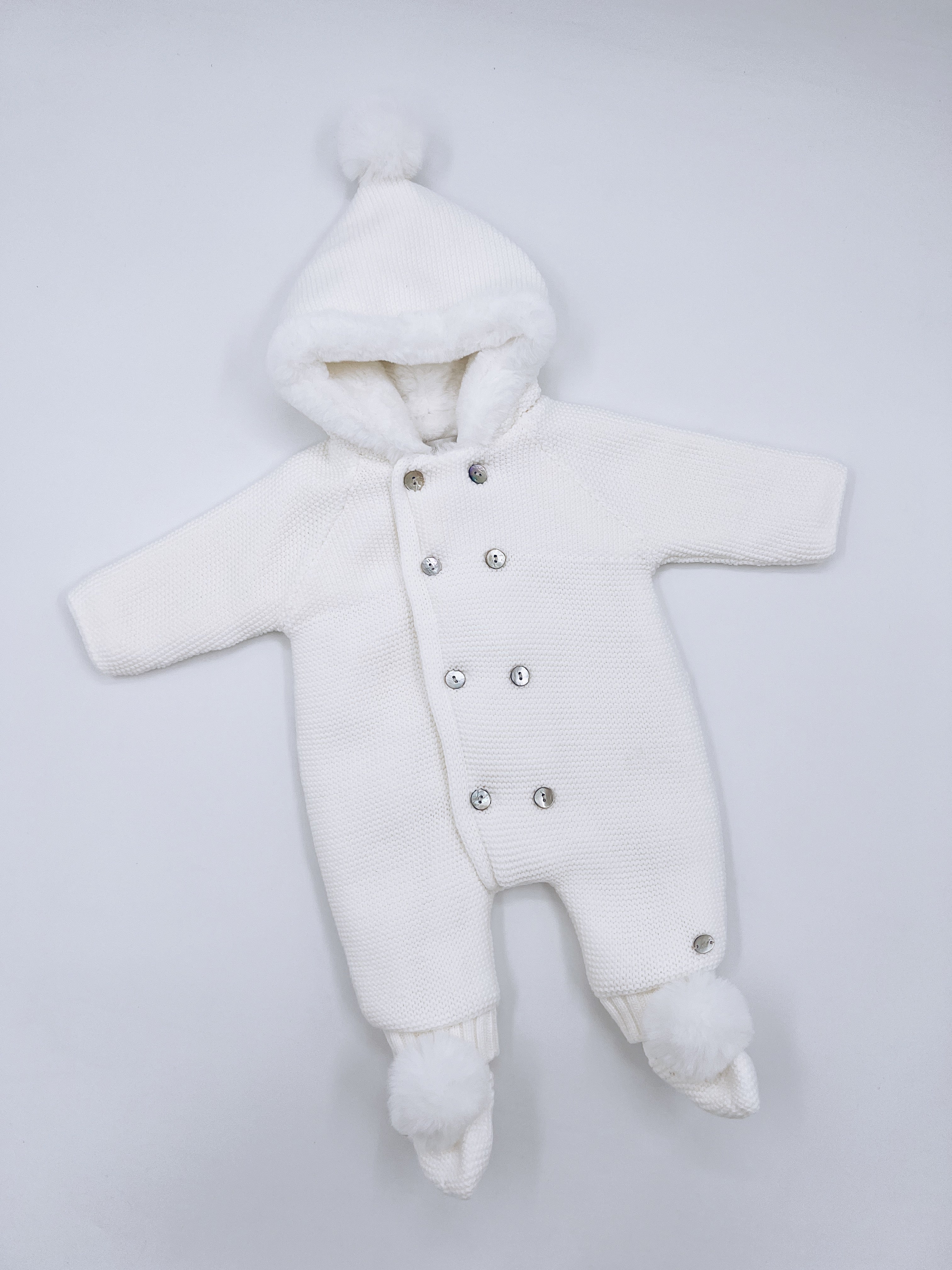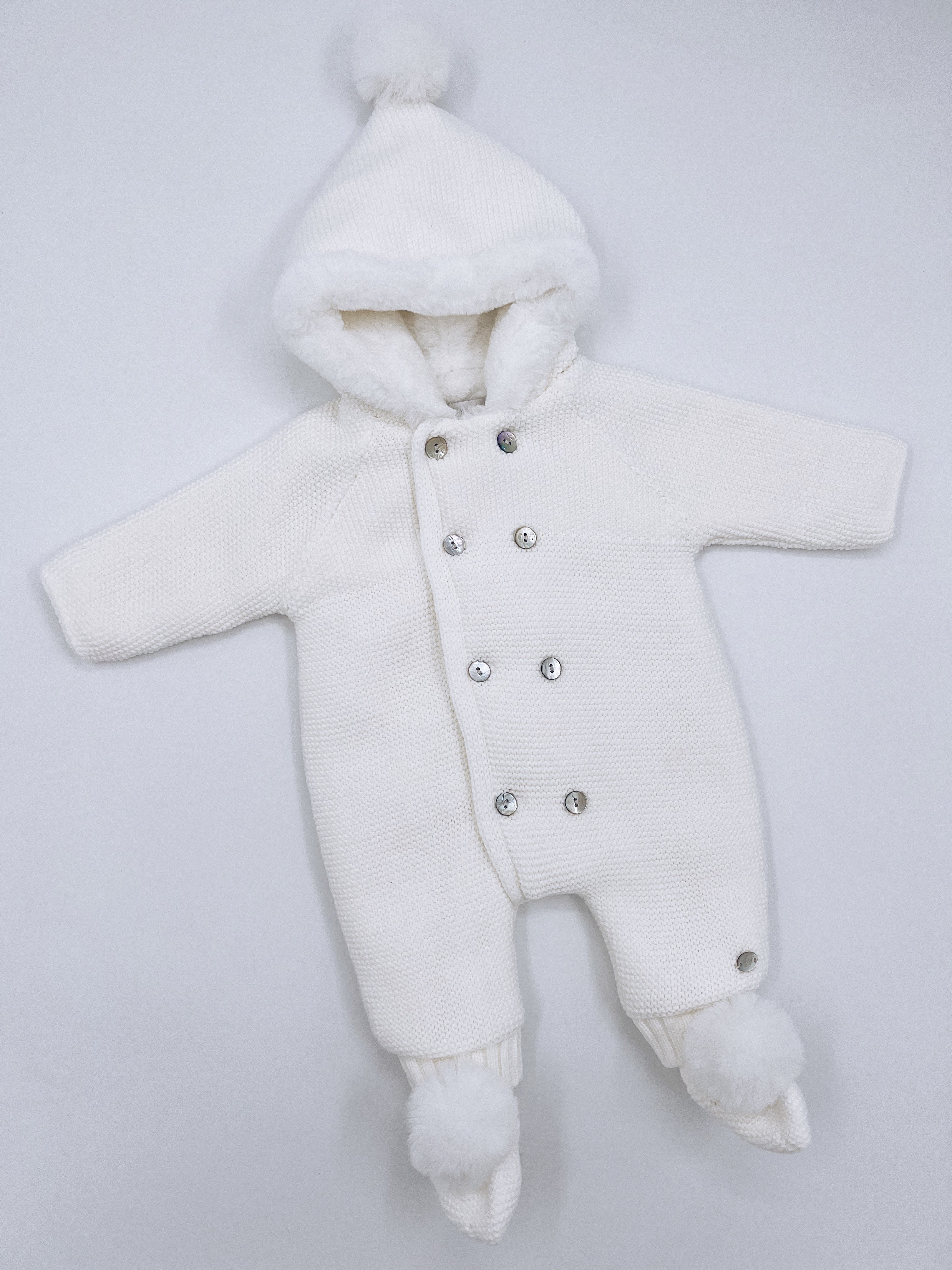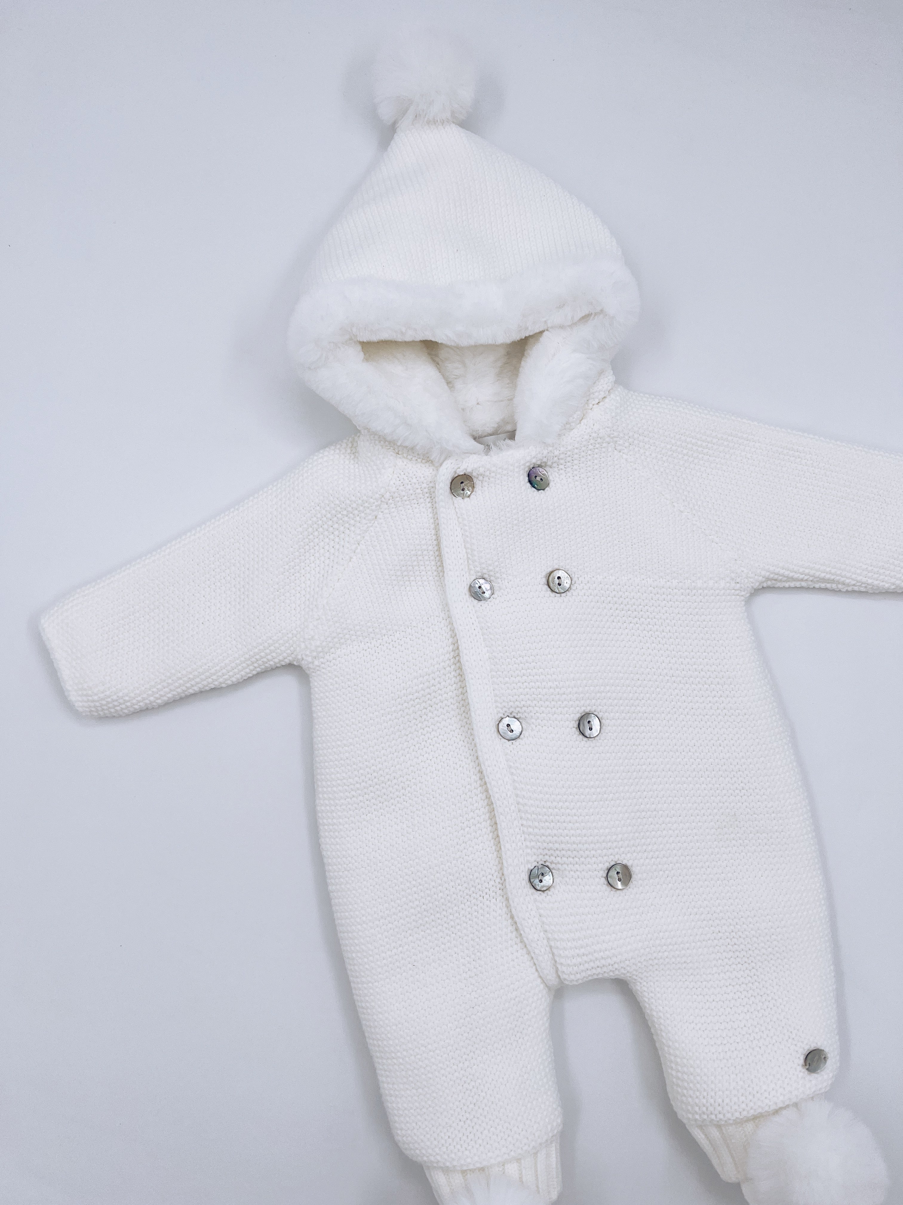 White knitted Baby pramsuit with matching knitted pompom booties.Beautiful and thick knit pramsuit with warm linning.Pramsuit comes with matching knitted booties