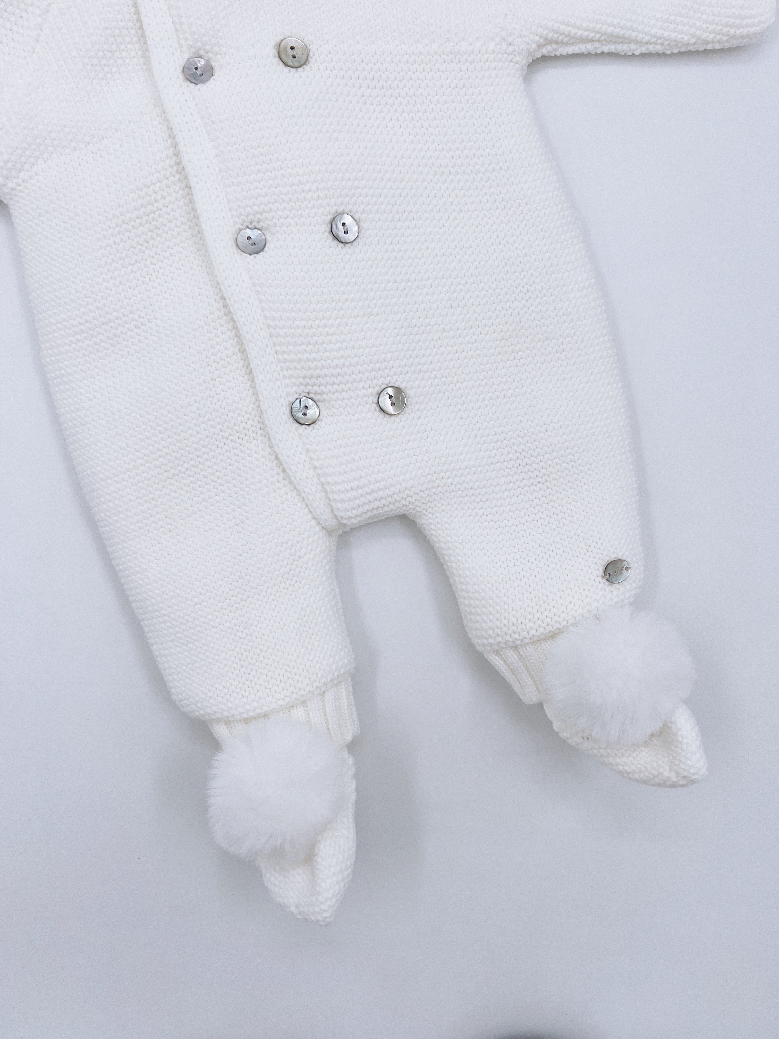 White knitted Baby pramsuit with matching knitted pompom booties.