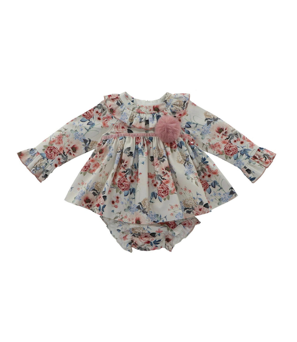 White knitted Baby pramsuit with matching knitted pompom booties.