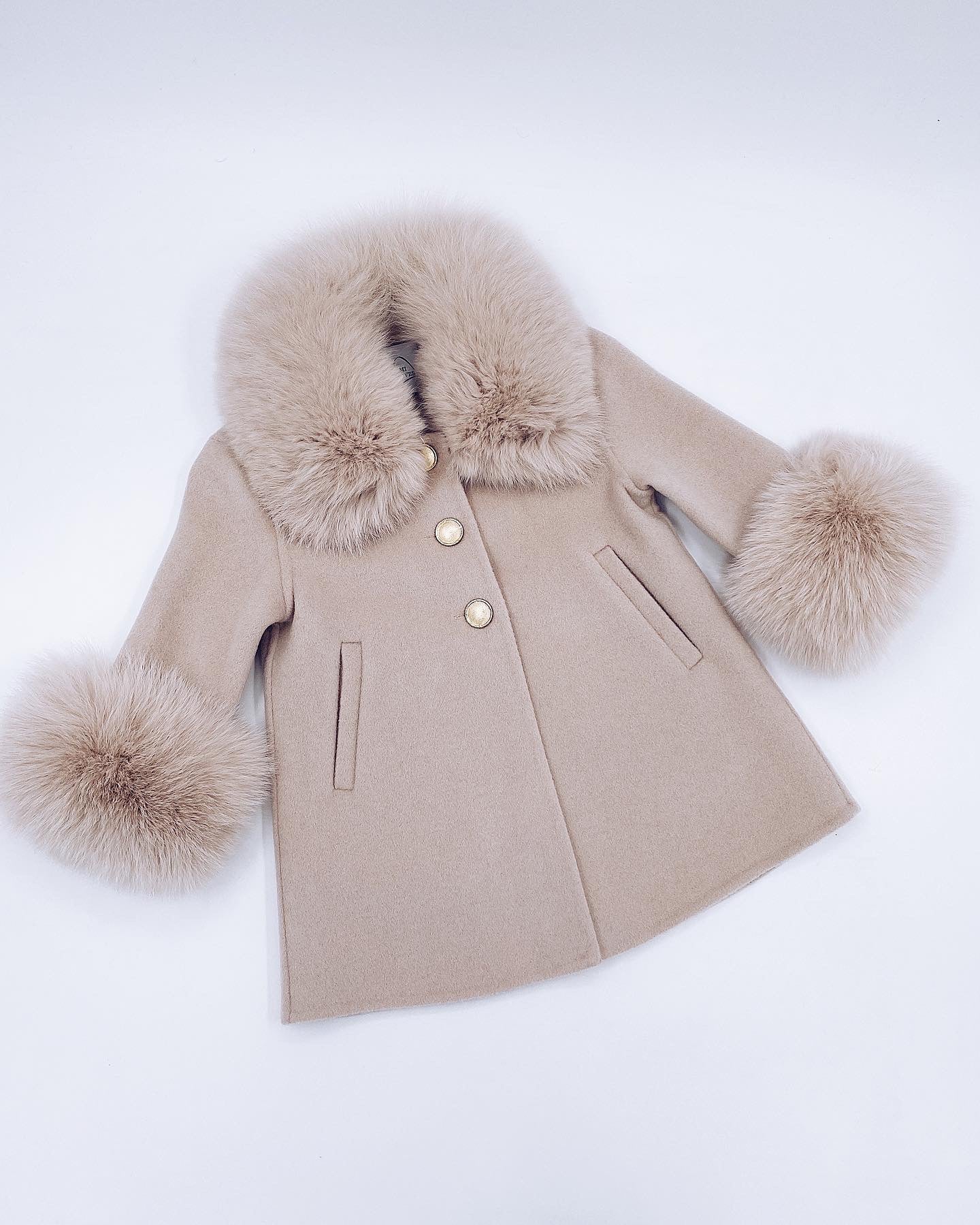 MI LOVES SIGNATURE Luxurious Cashmere kids coat with Fox fur trim and cuffs in Beautiful Nude colour