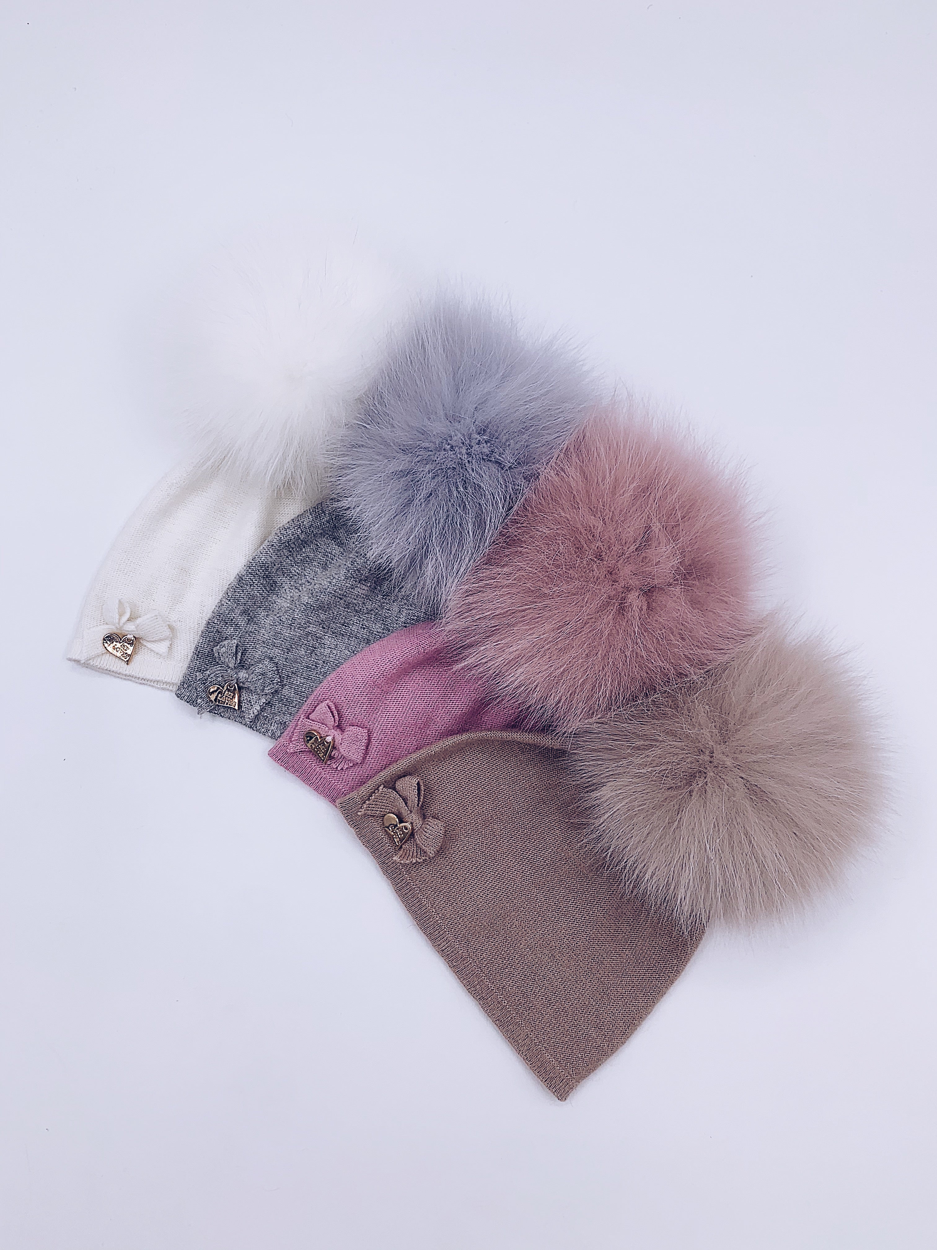 MI LOVES SIGNATURE LUXURIOUS FINE KNIT ANGORA HAT WITH FOX FUR POMPOM (with Bow)