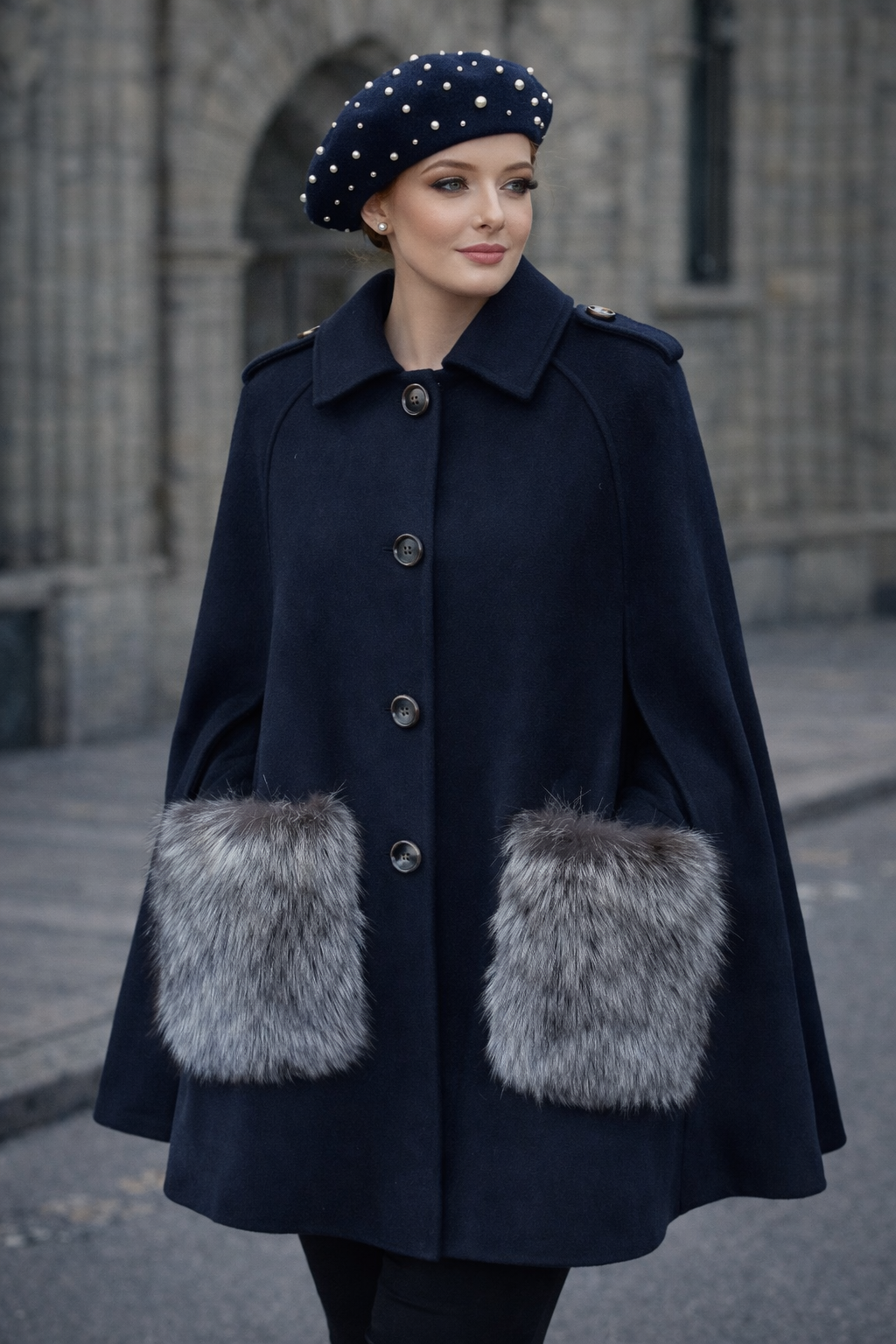 Adult LUXURIOUS CASHMERE cape with Luxurious fox fur pockets ,part of MI LOVES ELITE COLLECTION!This beautiful Cape is a Must-Have item in your AW wardrobe,looks super chic paired with jeans and high knee boots .Available in Camel and Navy colour