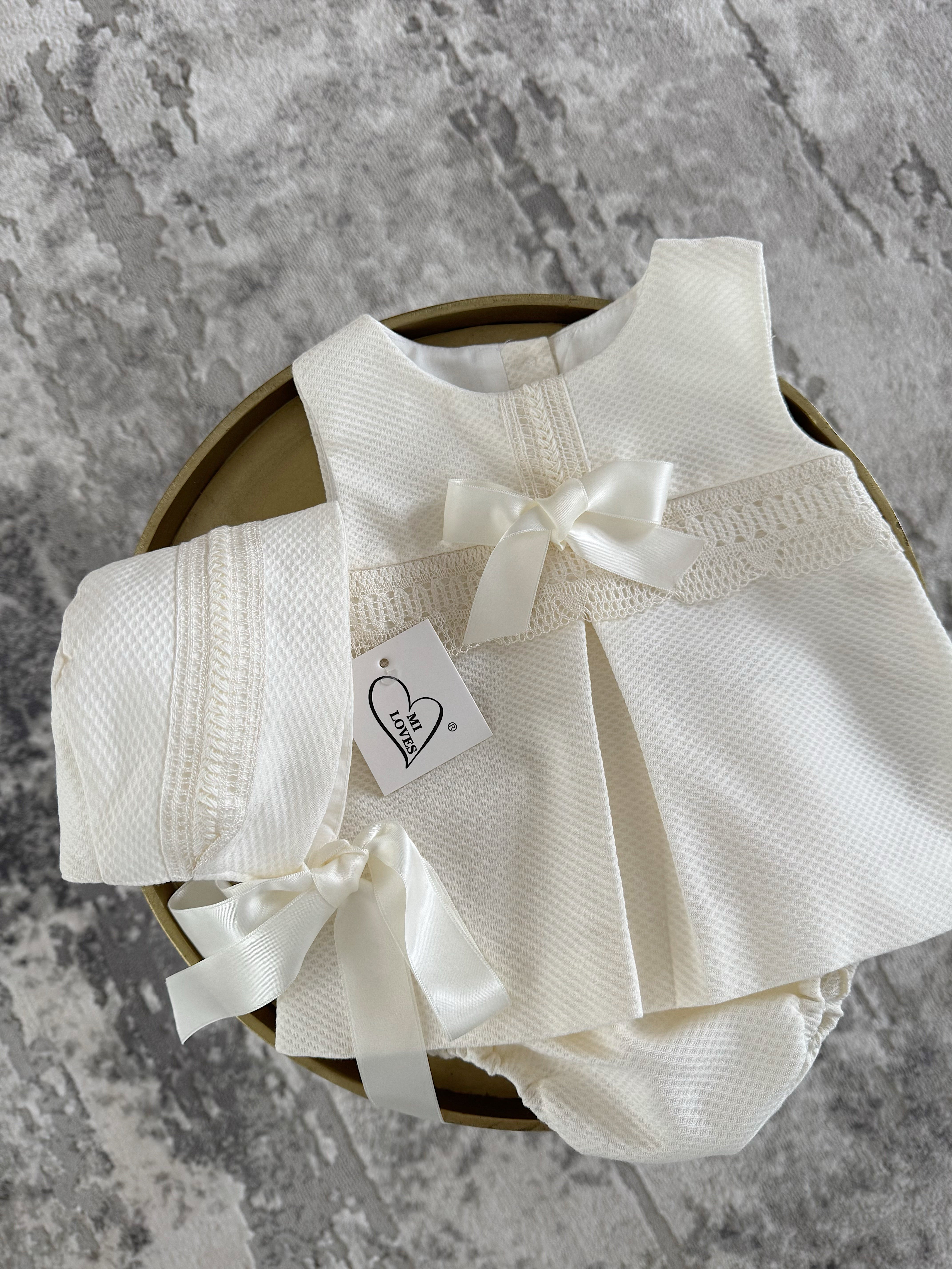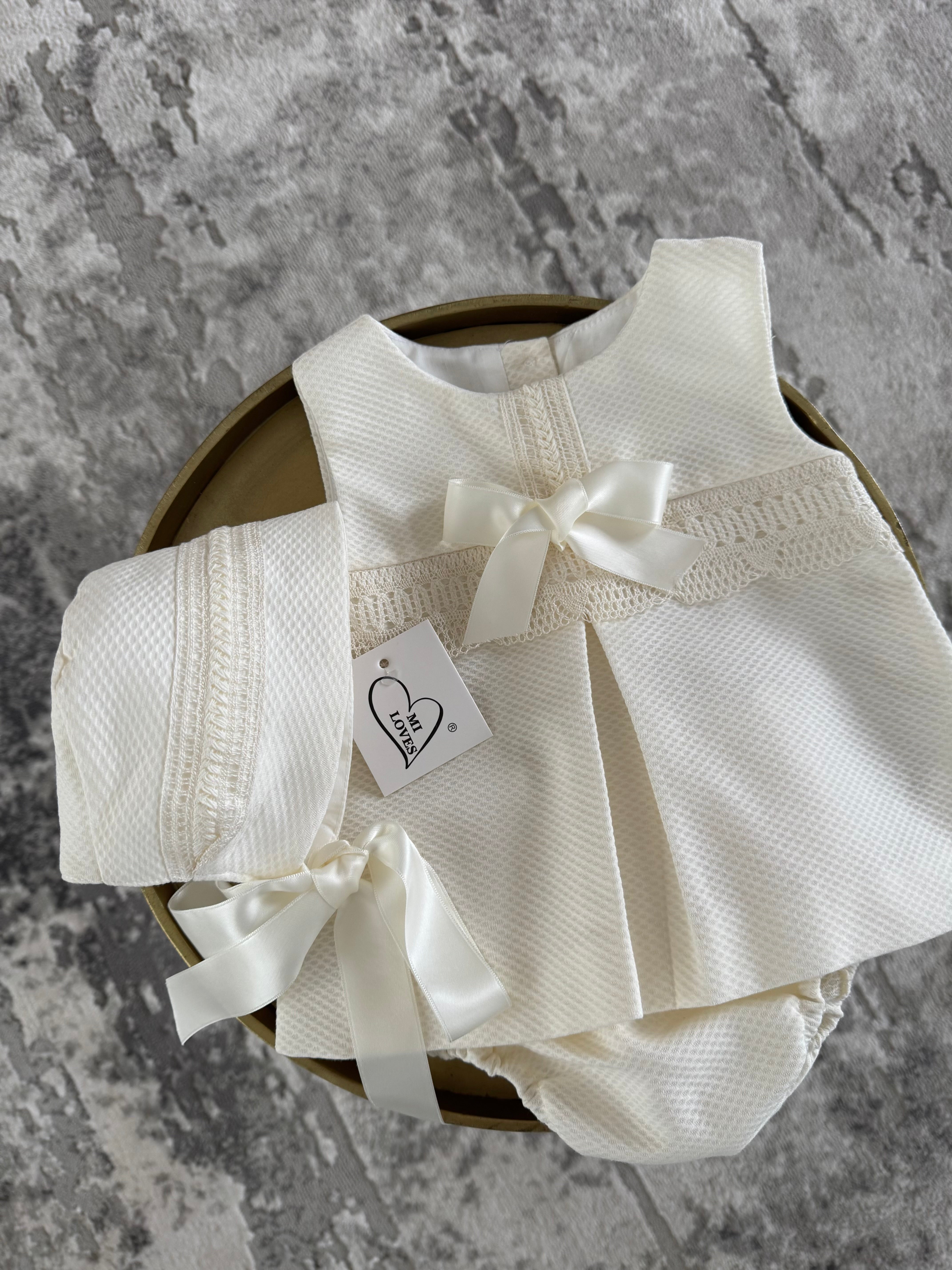 MI LOVES Ivory Dress/Bonnet/Bloomers 3 piece set with beautiful lace details