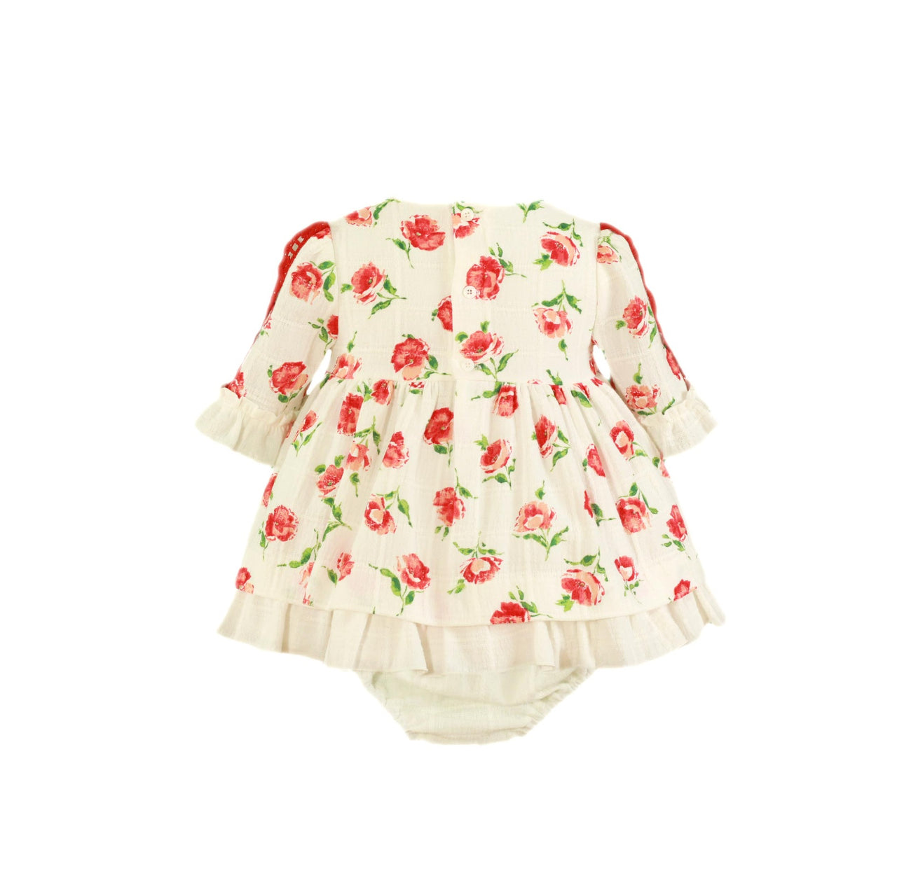 Miranda Beautiful dress/bloomers set with red floral print details.