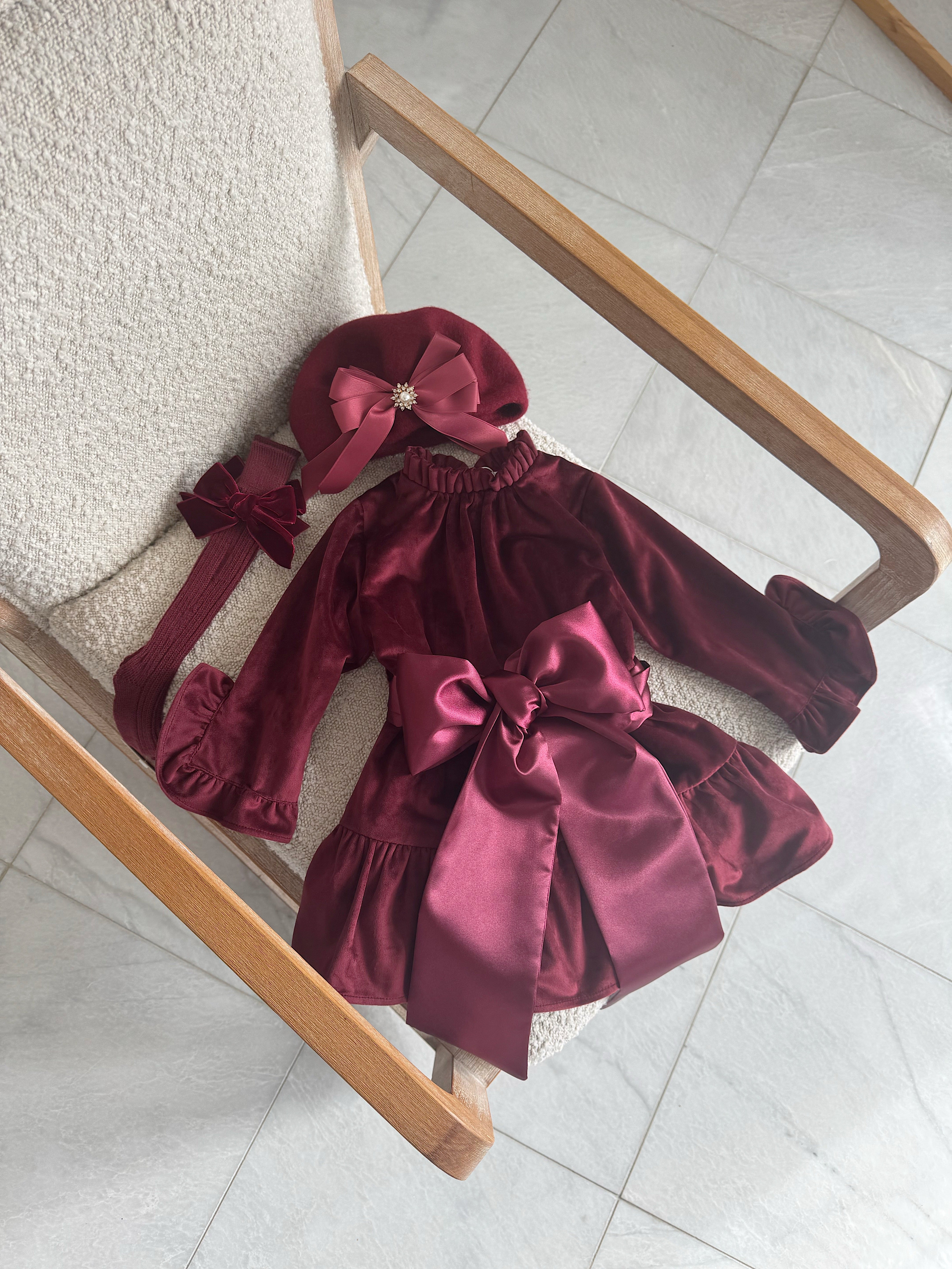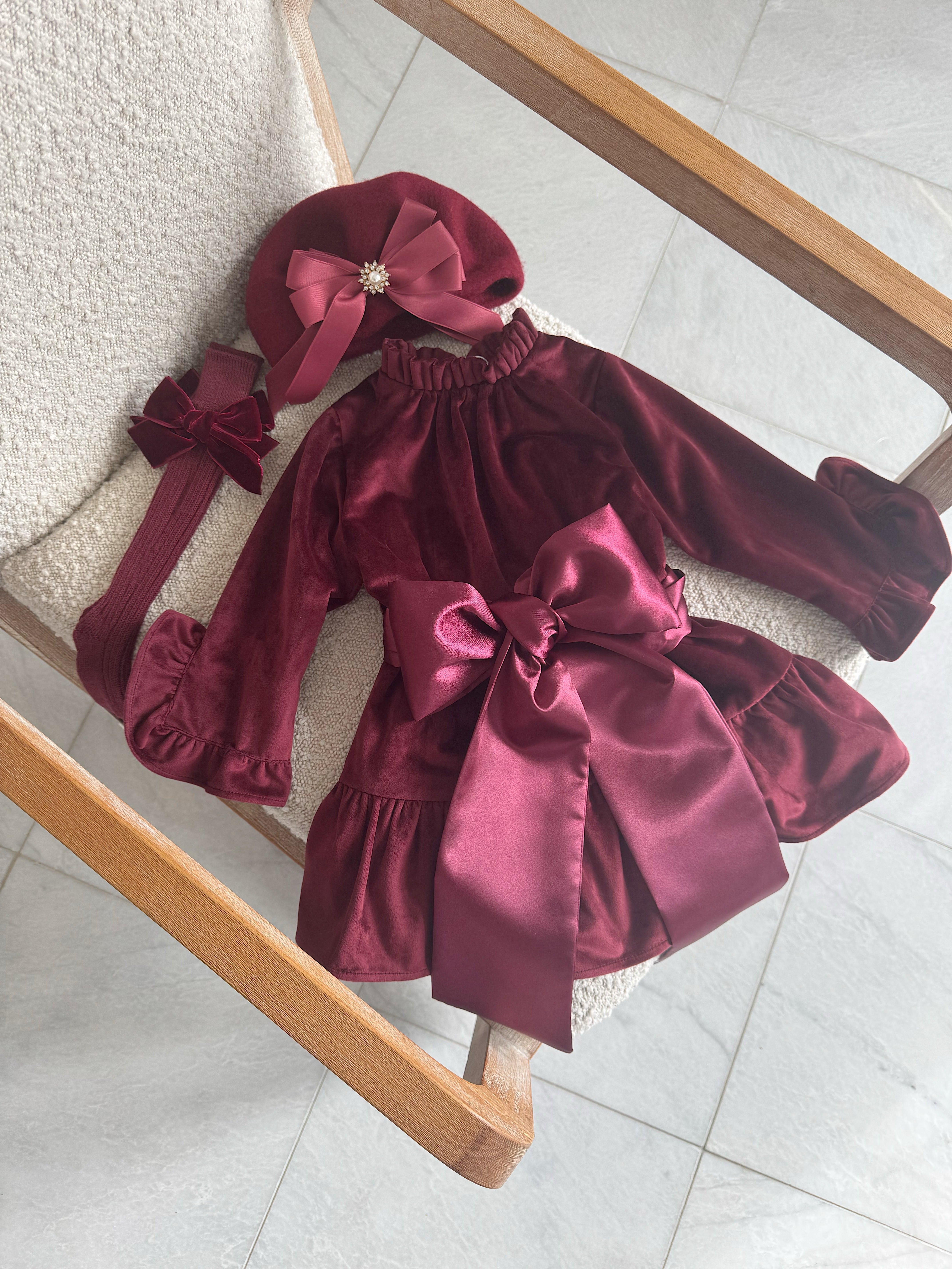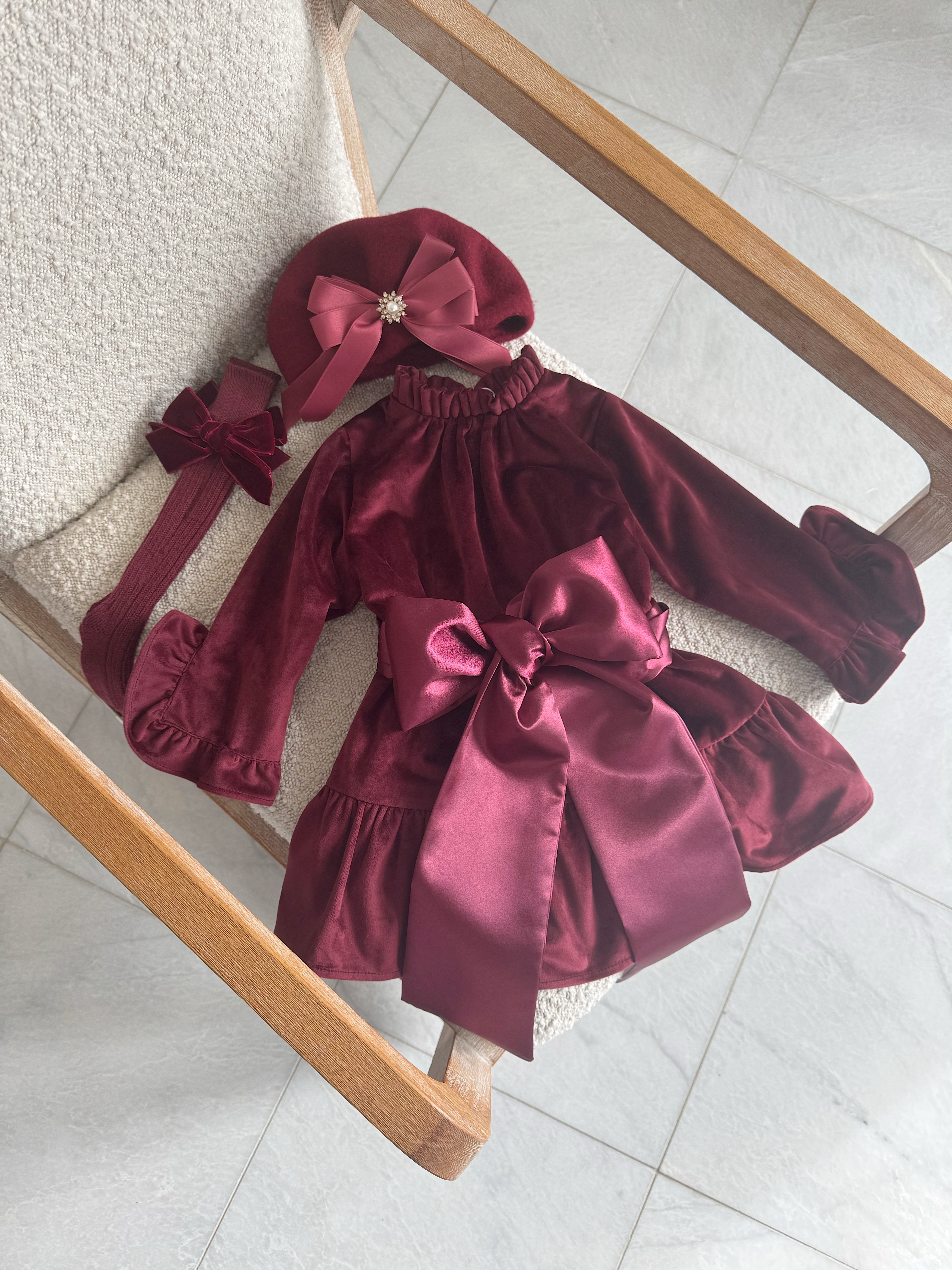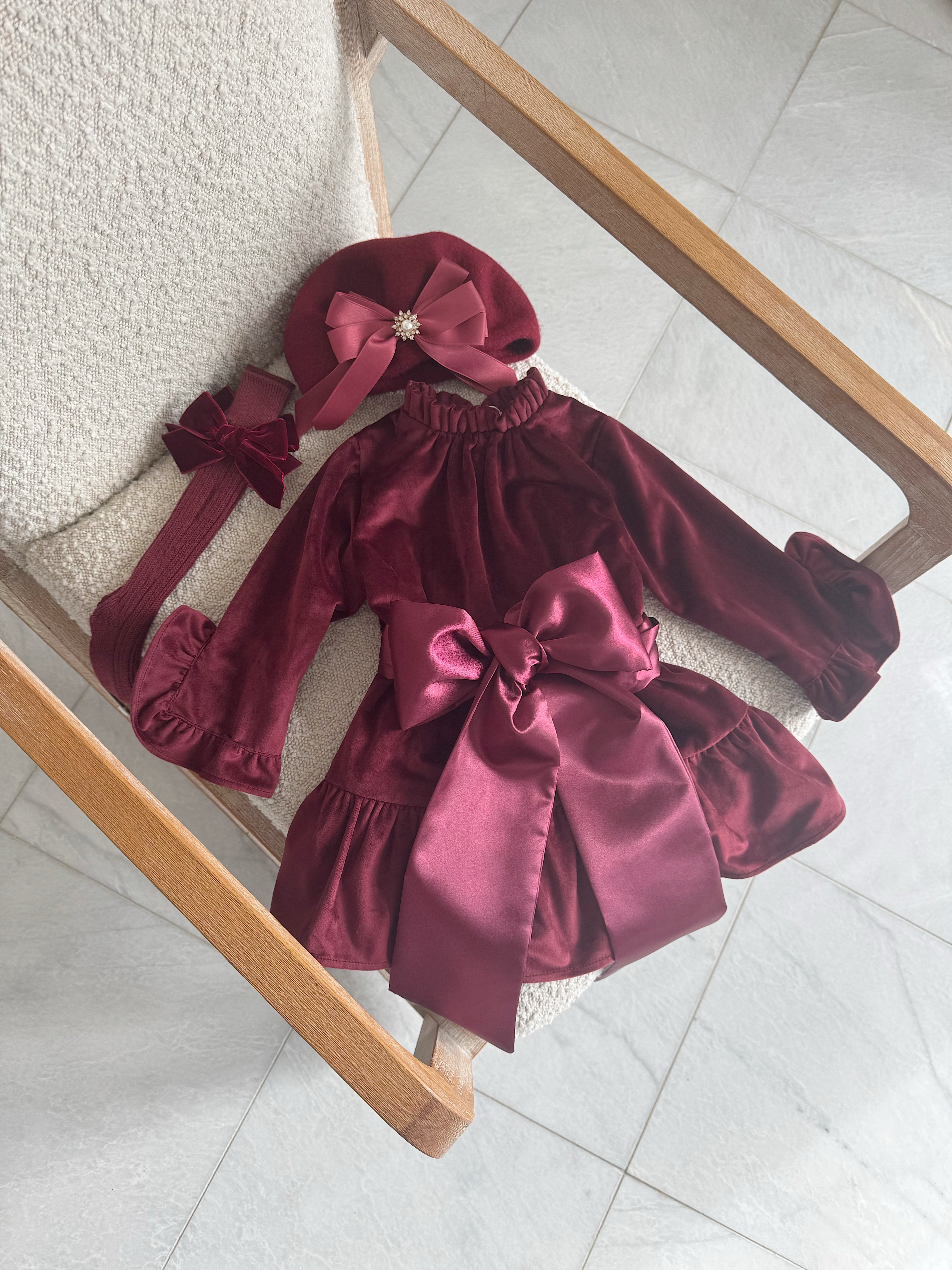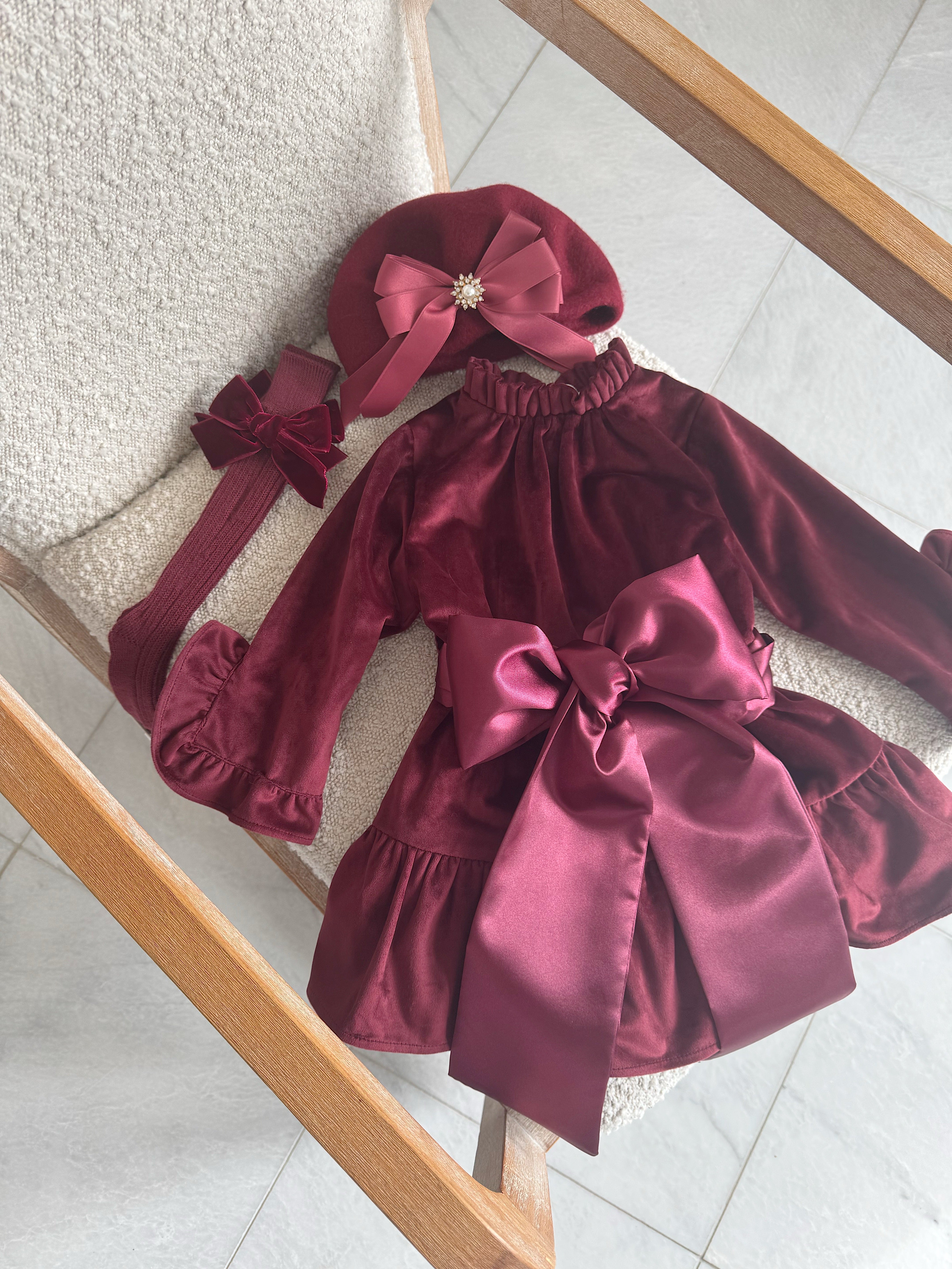 Beautiful Burgundy velvet Dress with Frill and Burgundy statement bow details.
