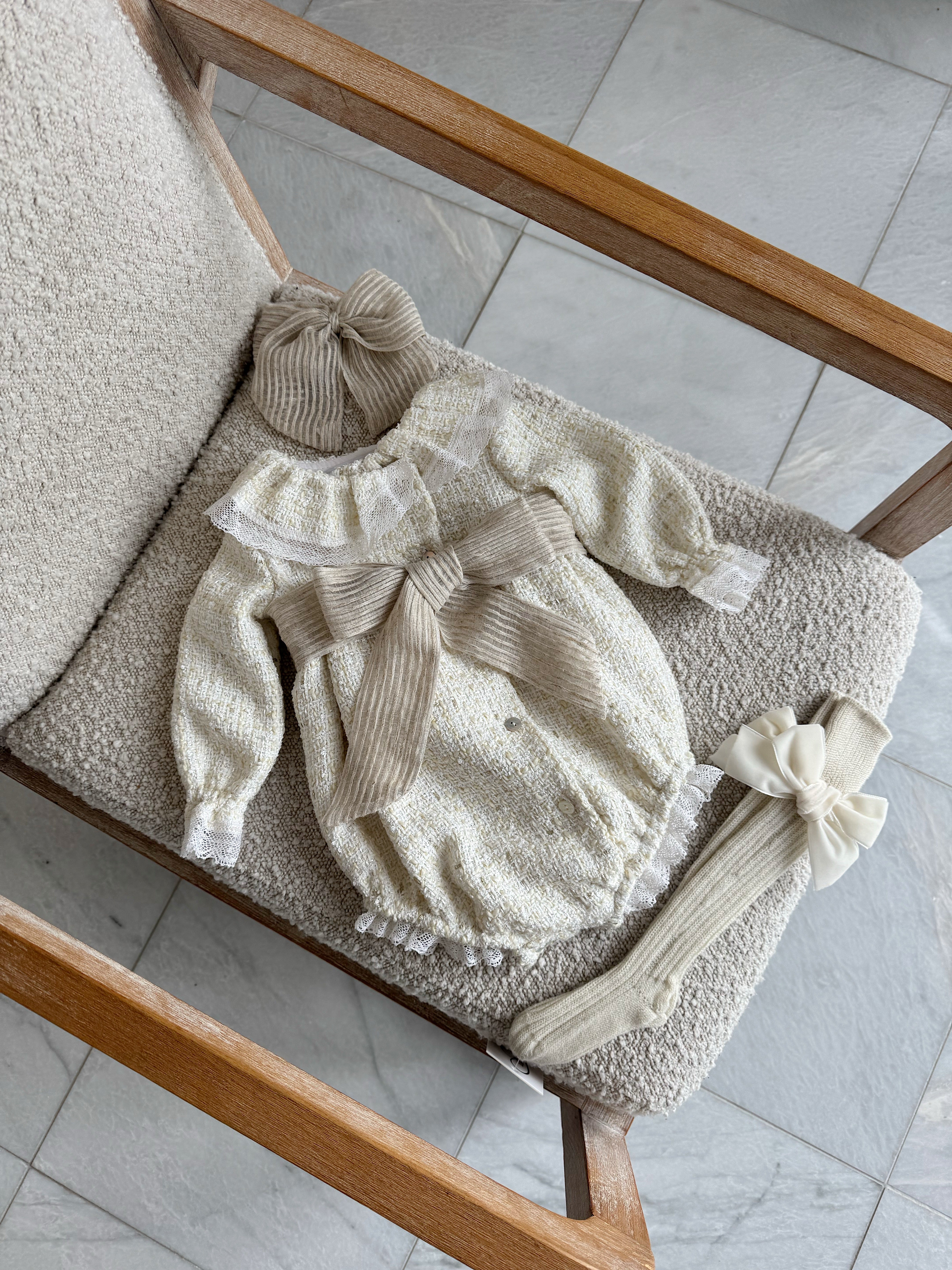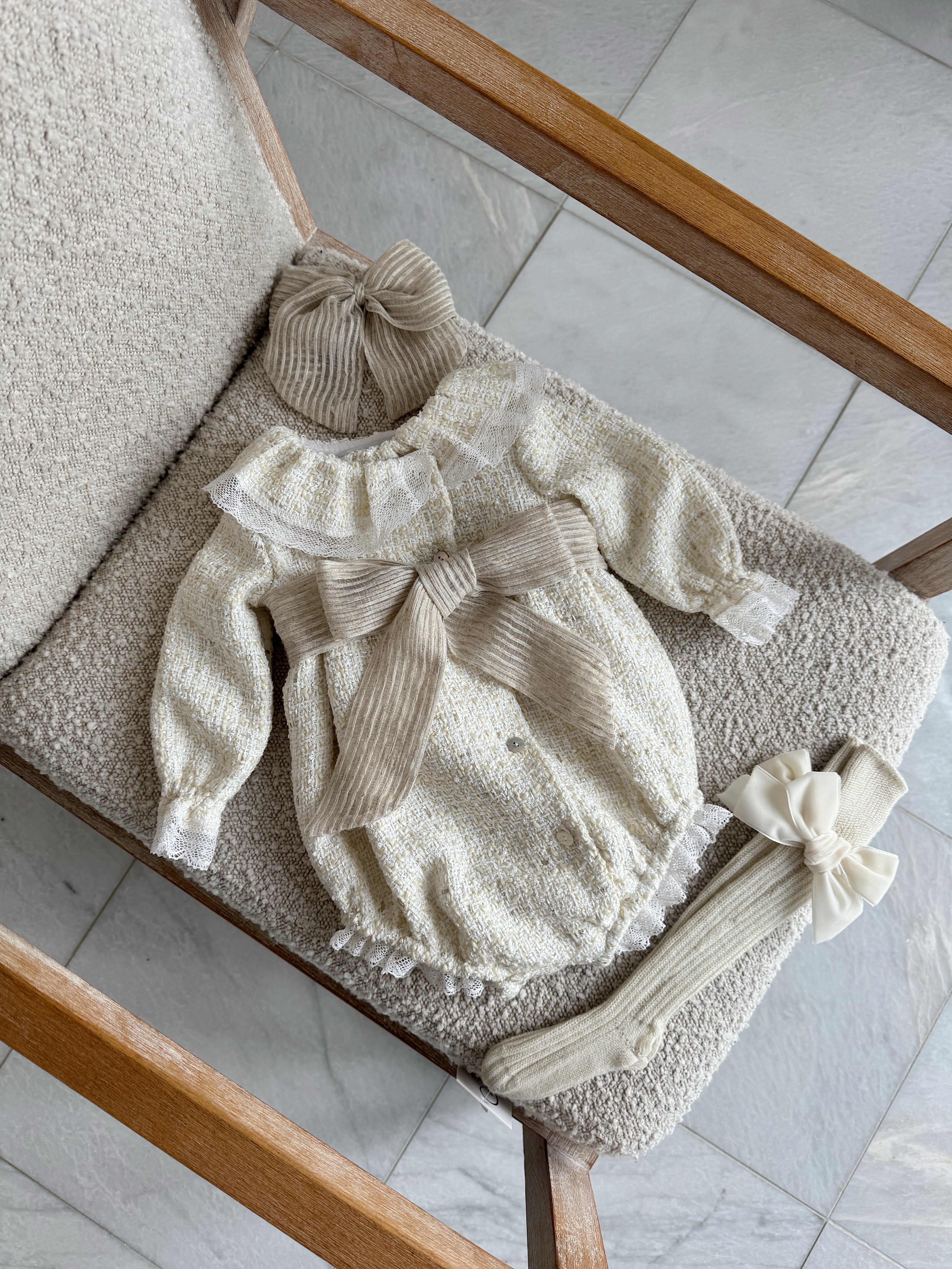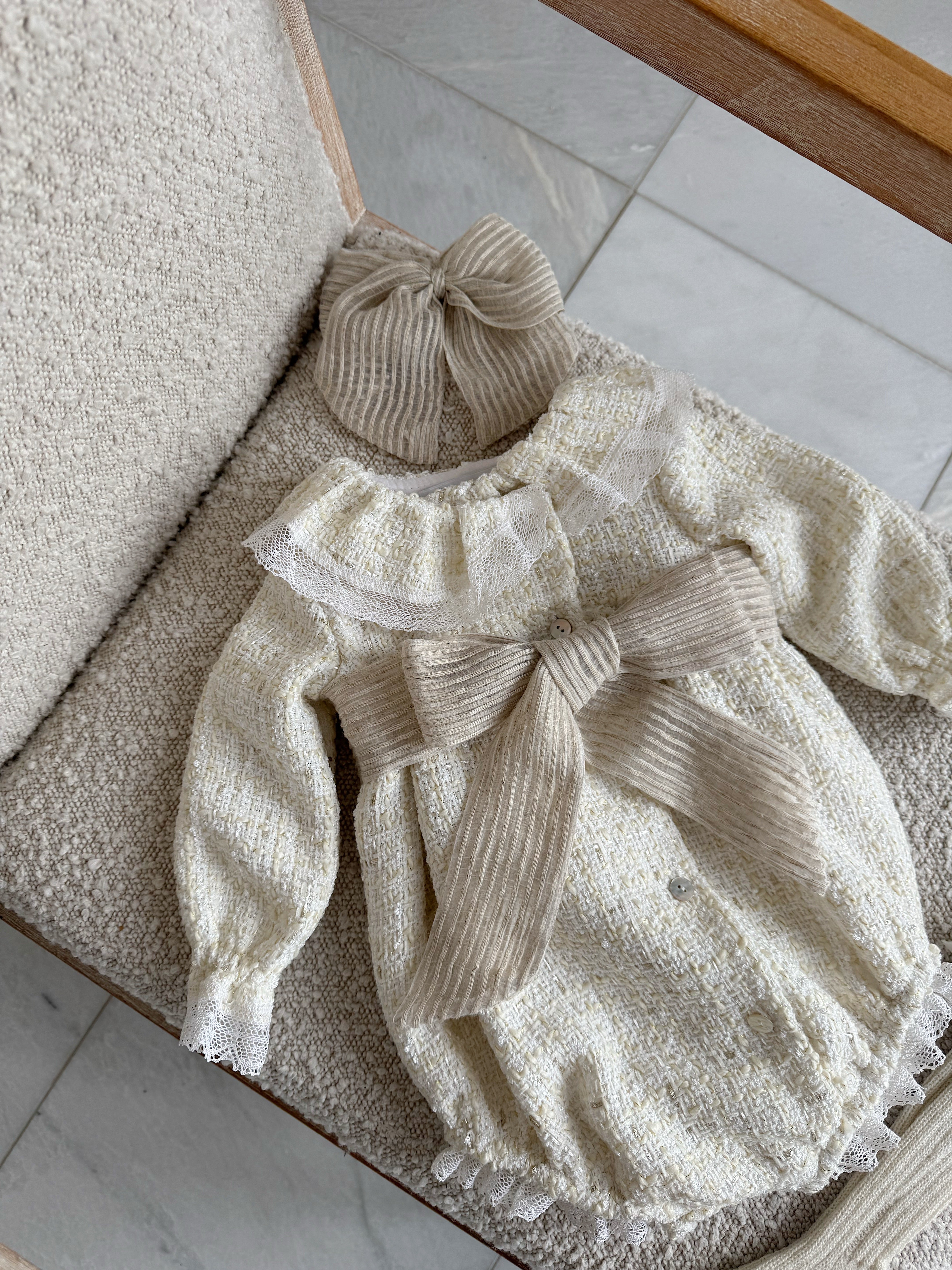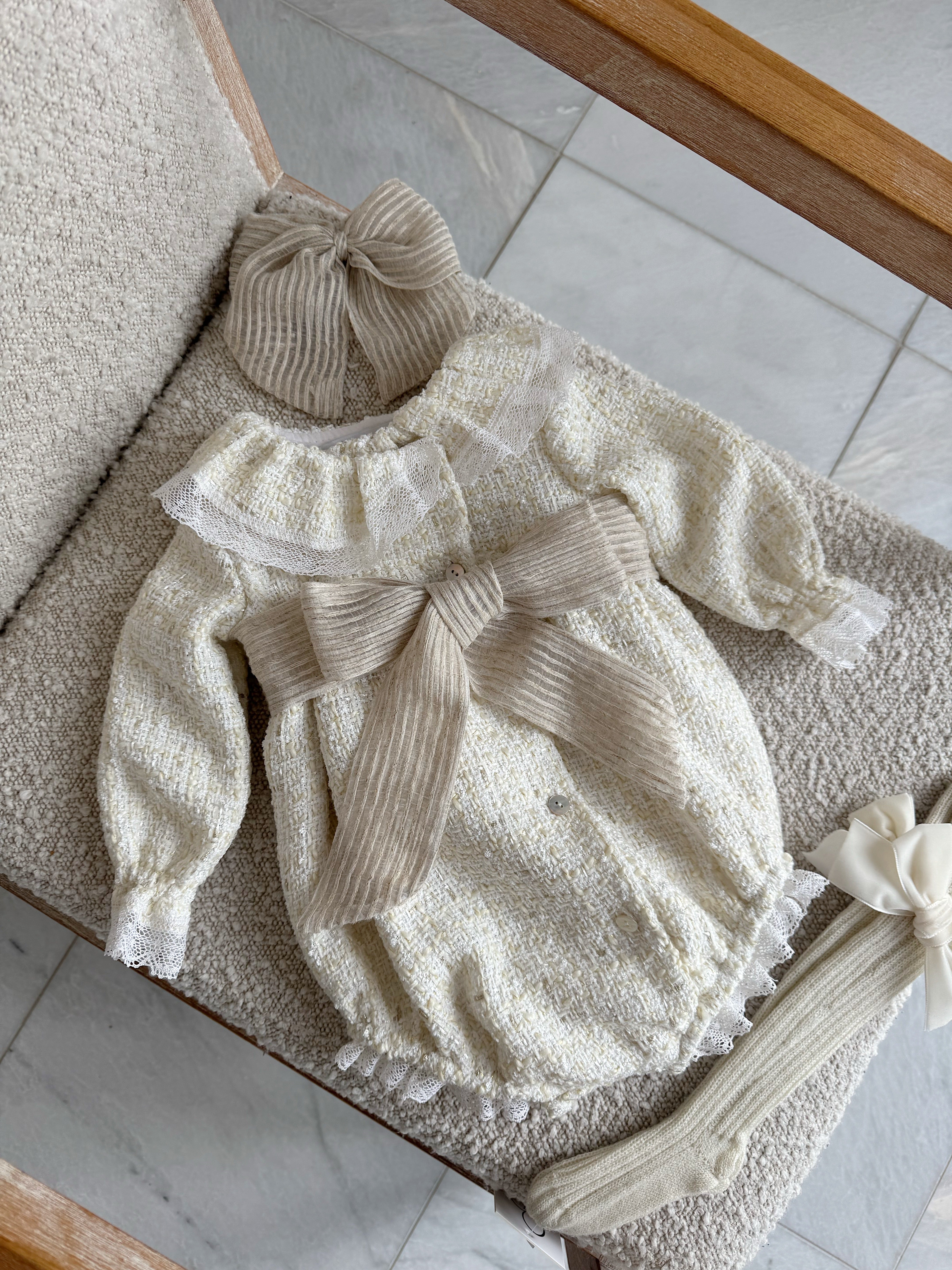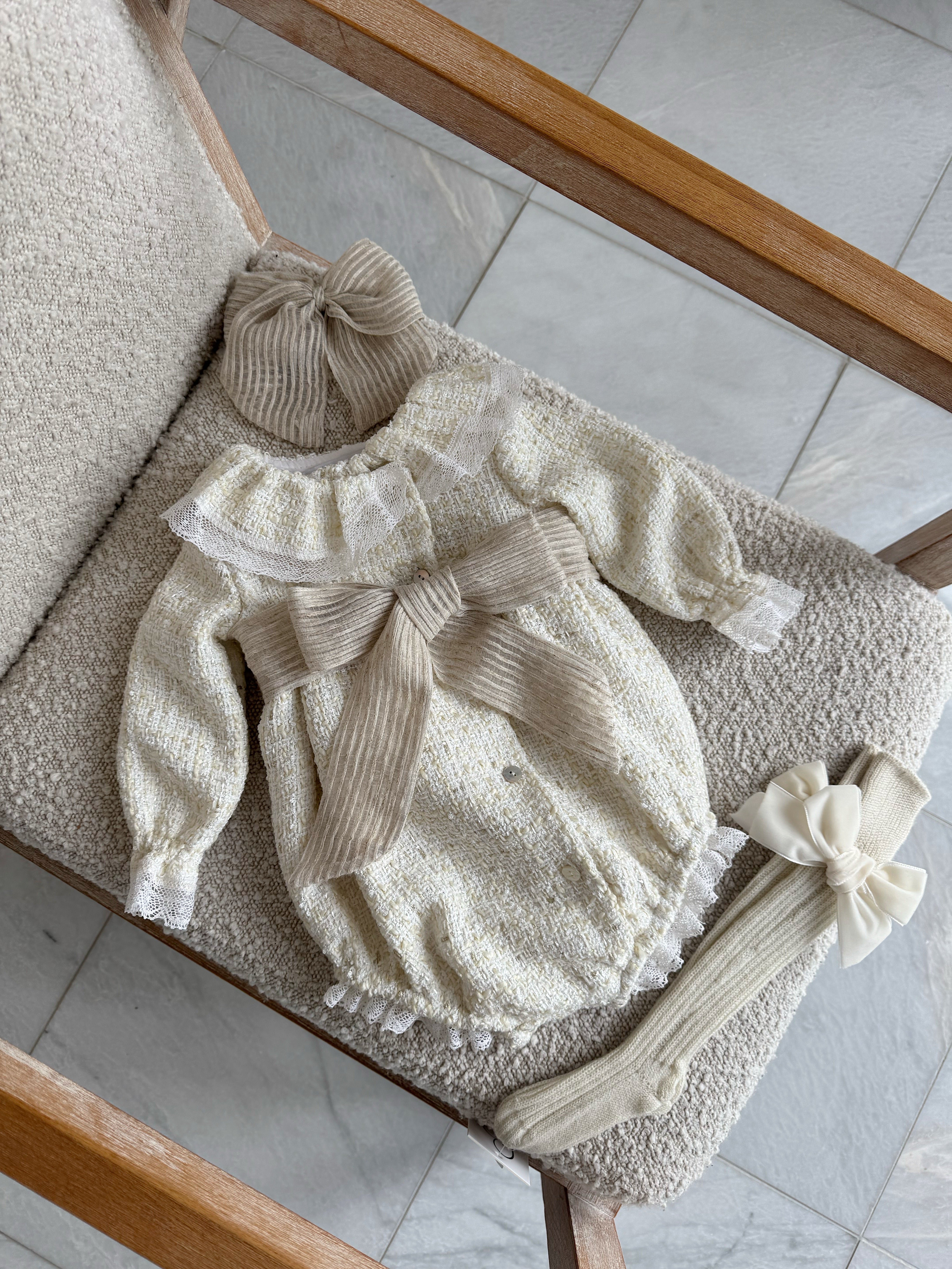 Beautiful Cream Tweed Bow Romper .