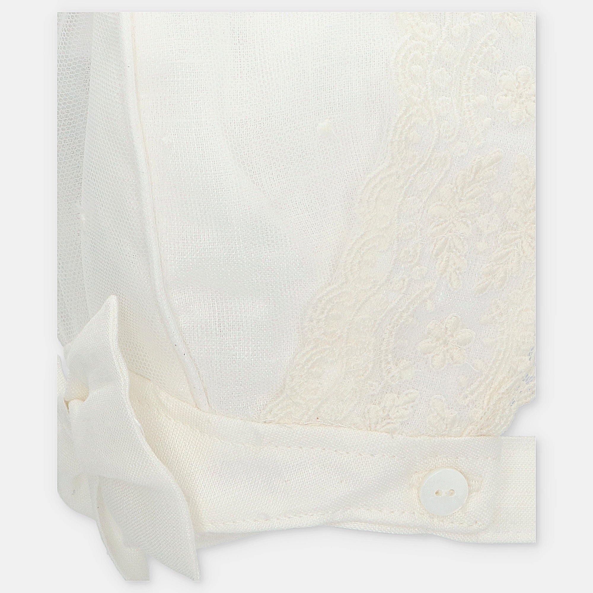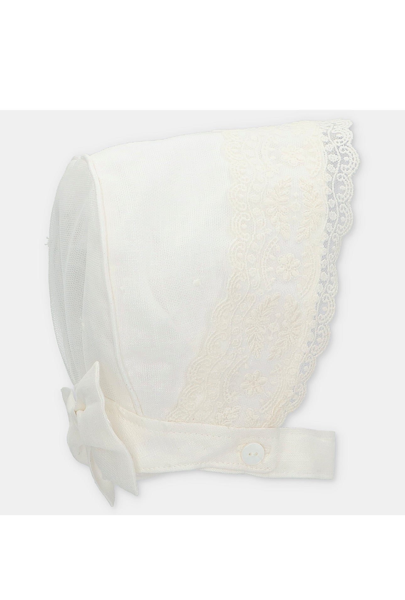 Beautiful Ivory Baby bonnet with lace and bow details.
