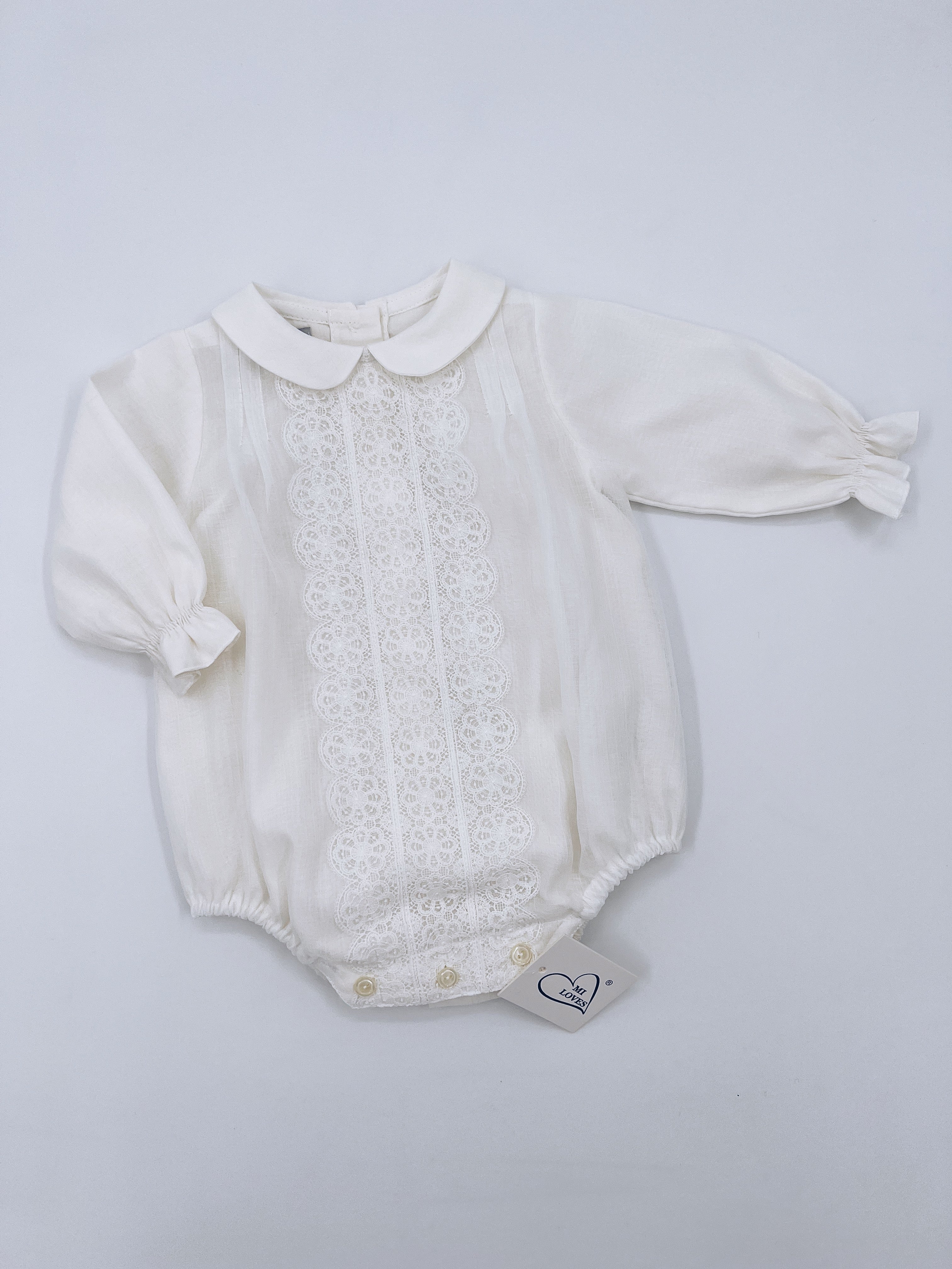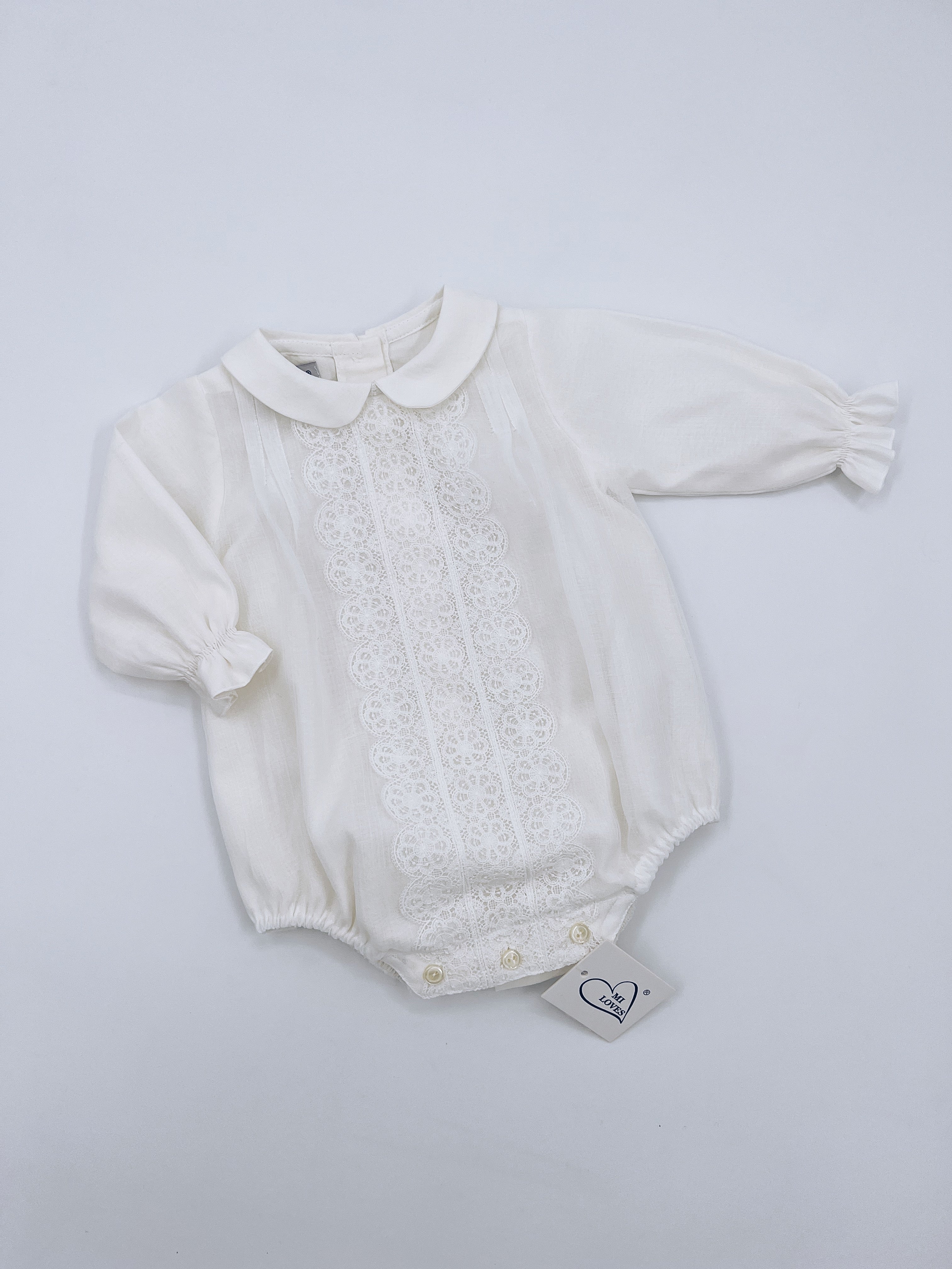 Beautiful Ivory Unisex Romper with lace details on the front.