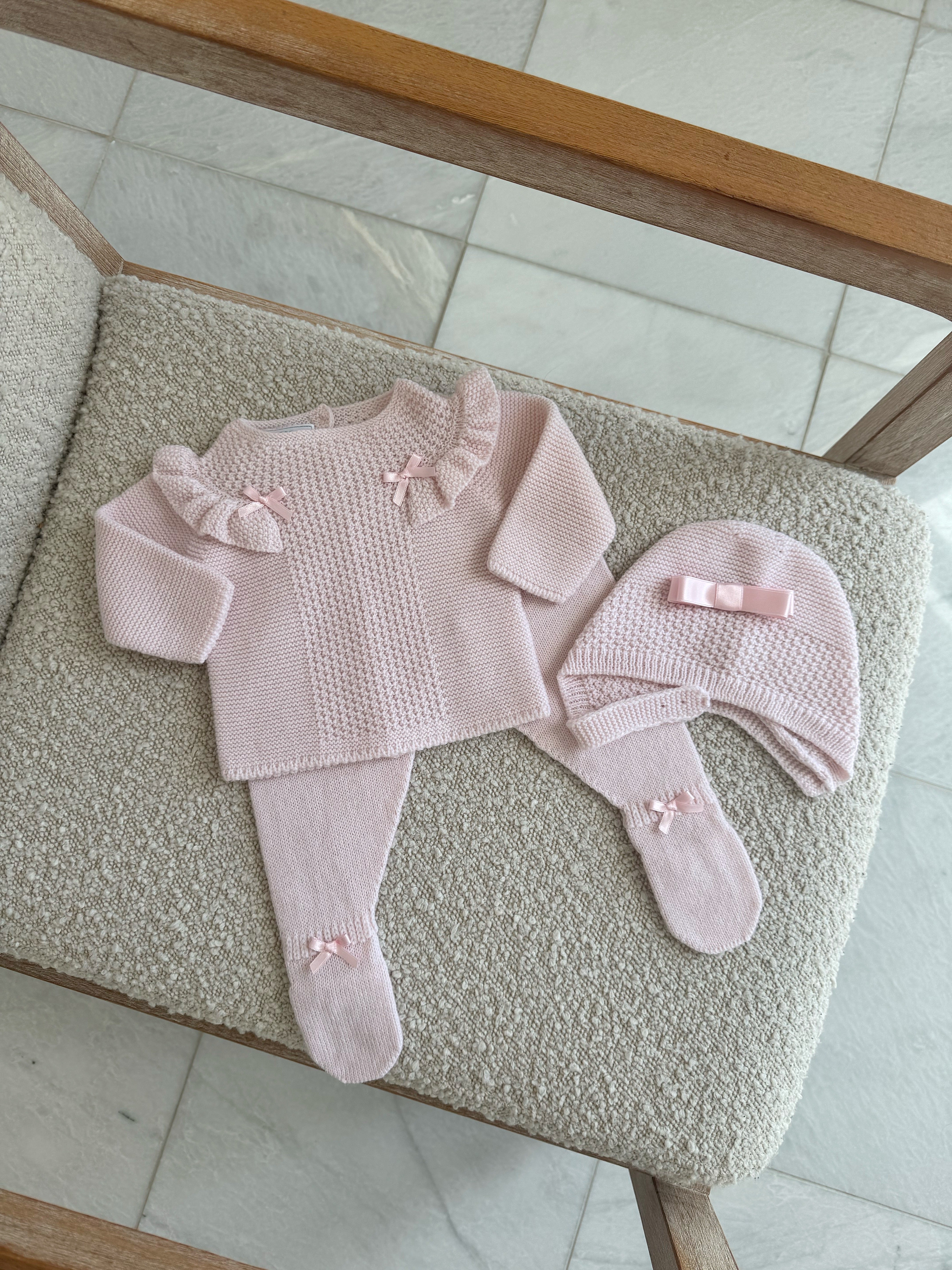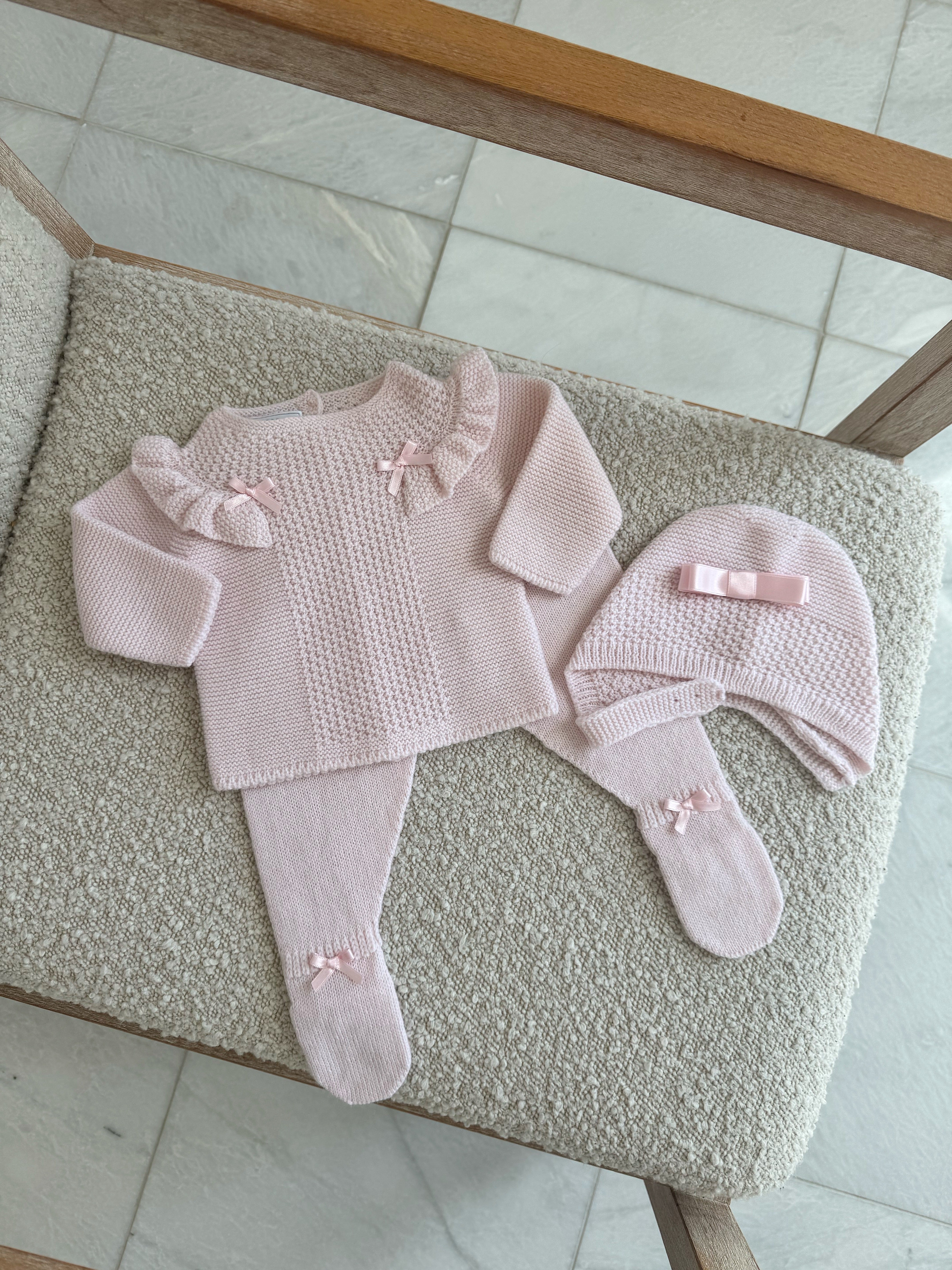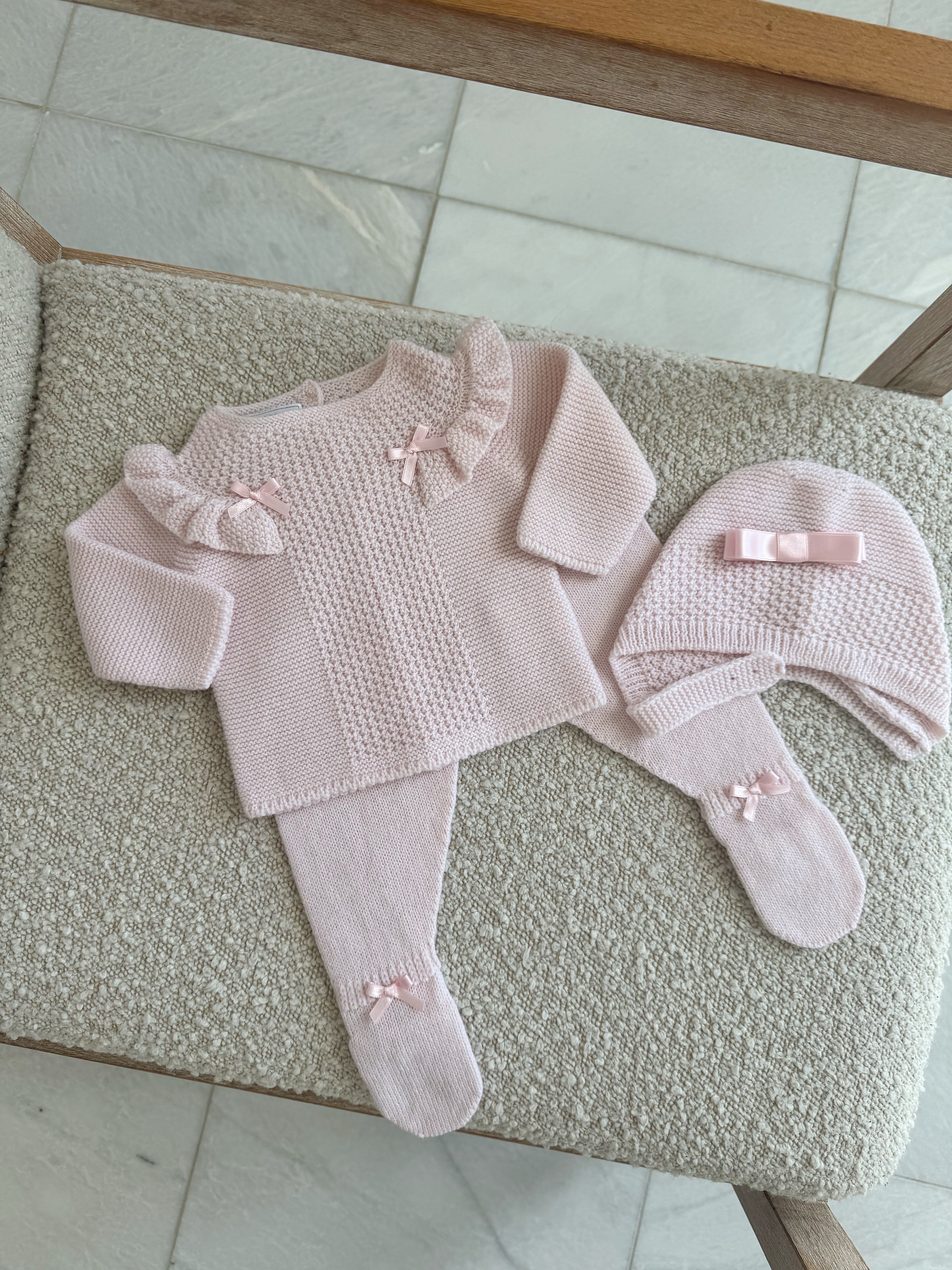 Beautiful Knitted Baby pink 3 piece set with frill details.