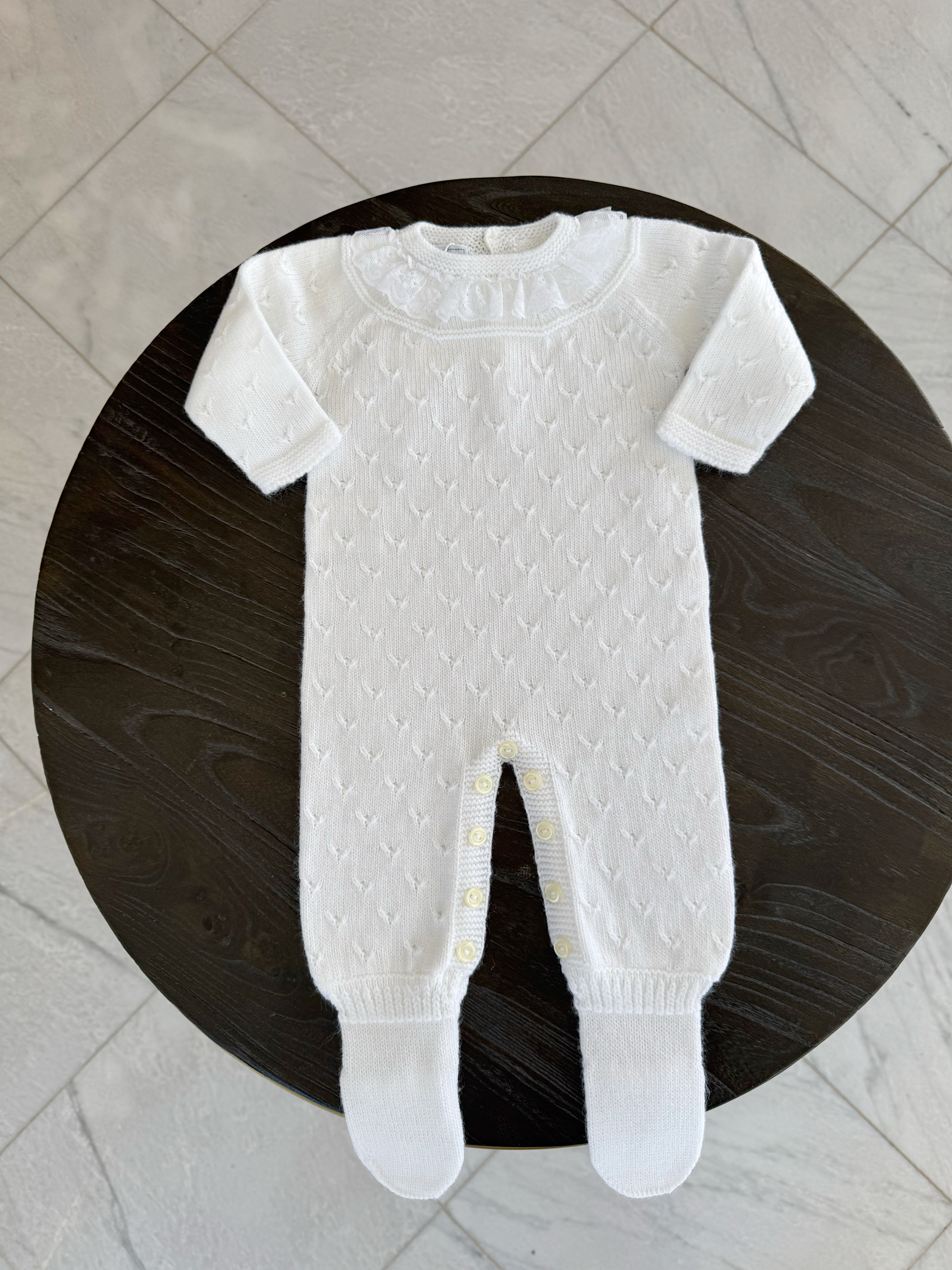 Beautiful Knitted ivory knitted baby grow with lace details.