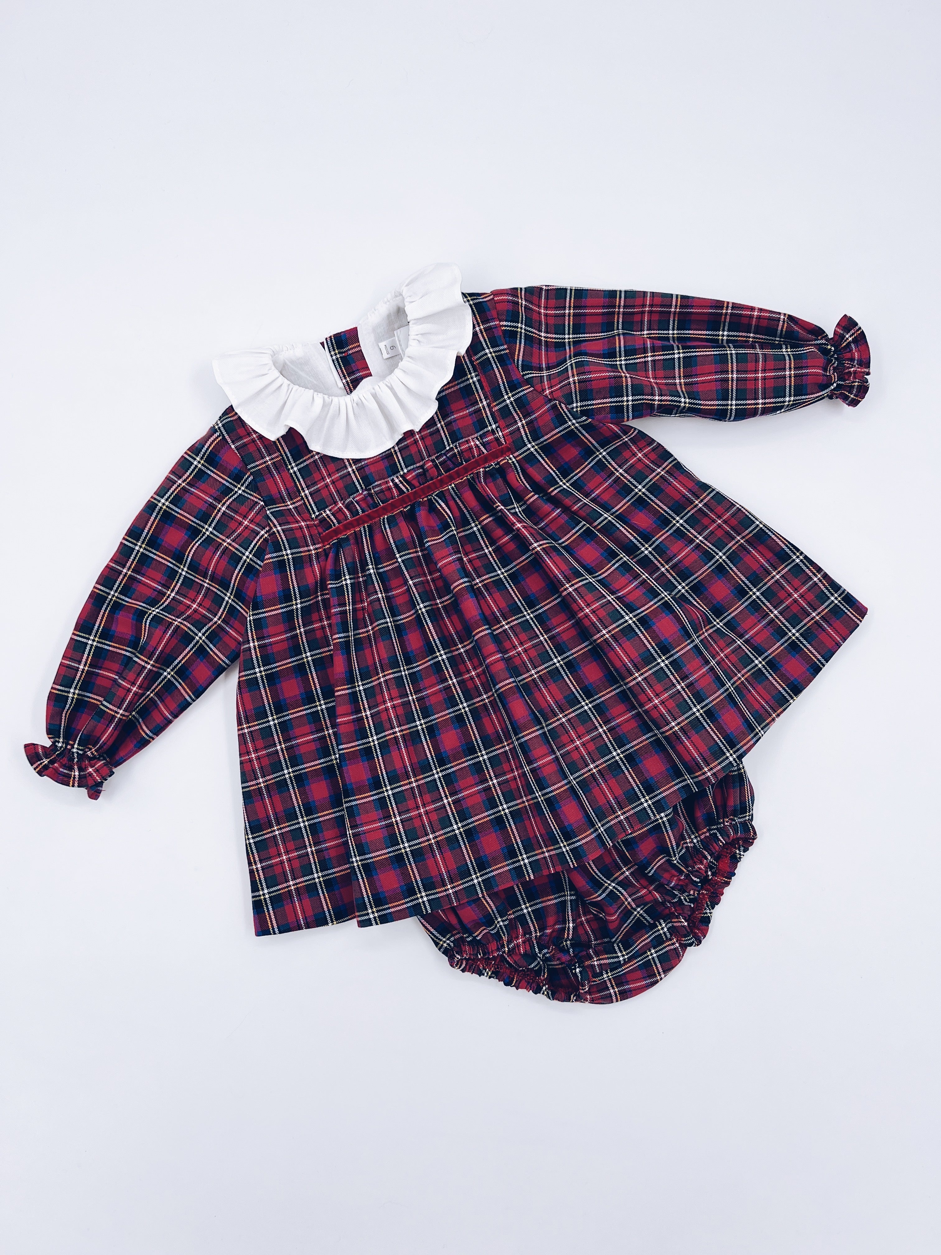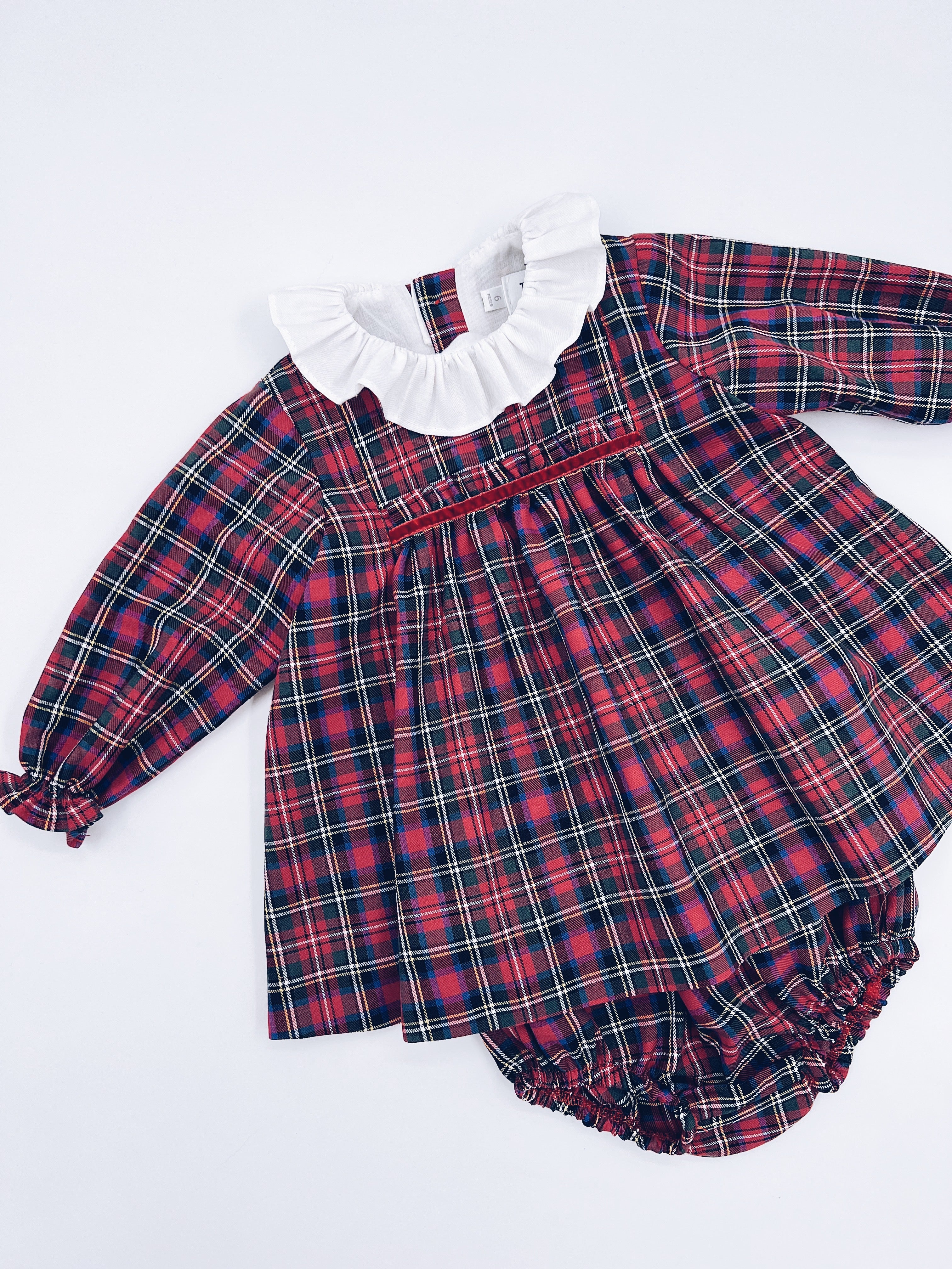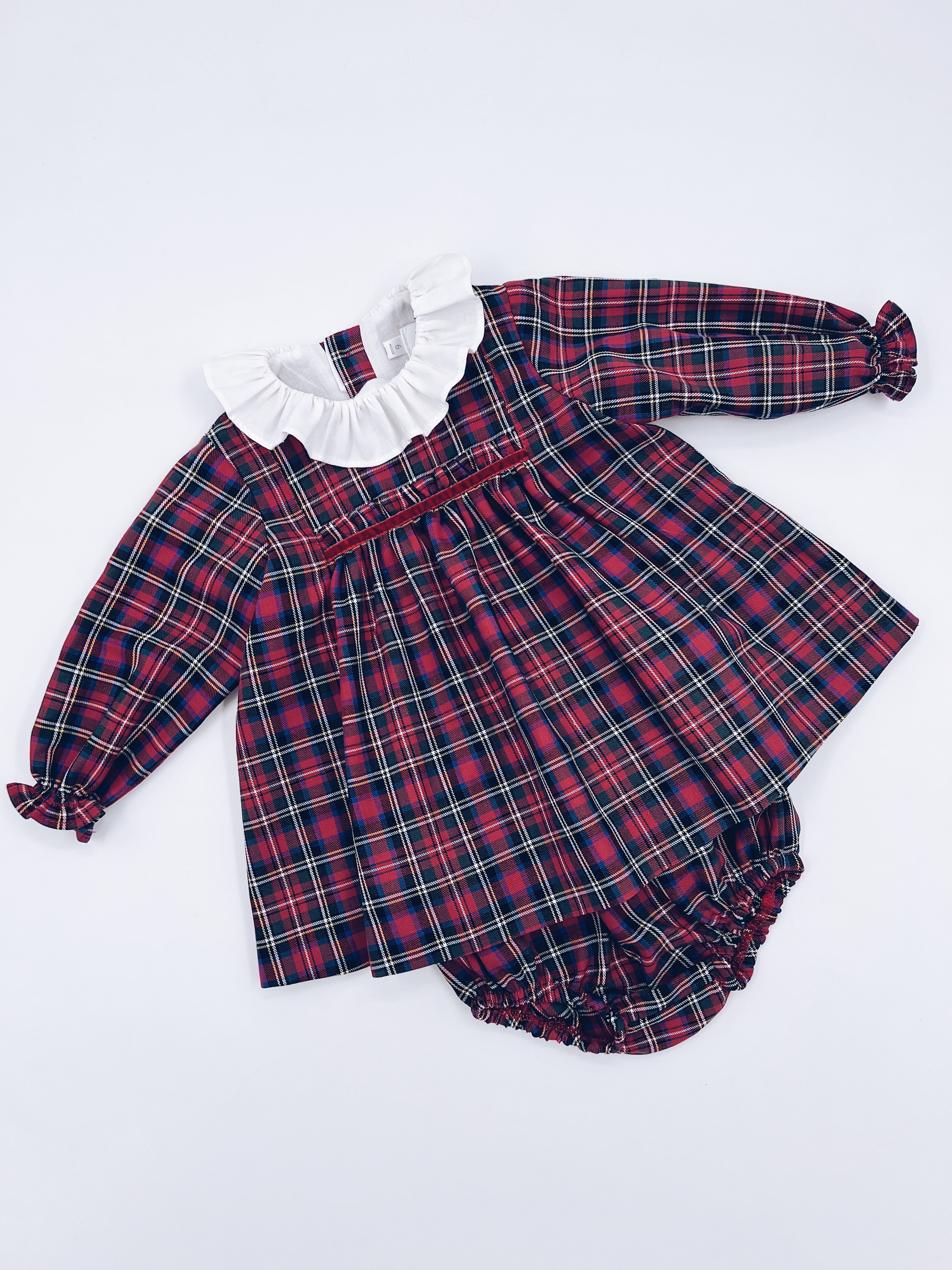Beautiful Red tartan Dress/Bloomers 2 piece set with white frilly neck details.