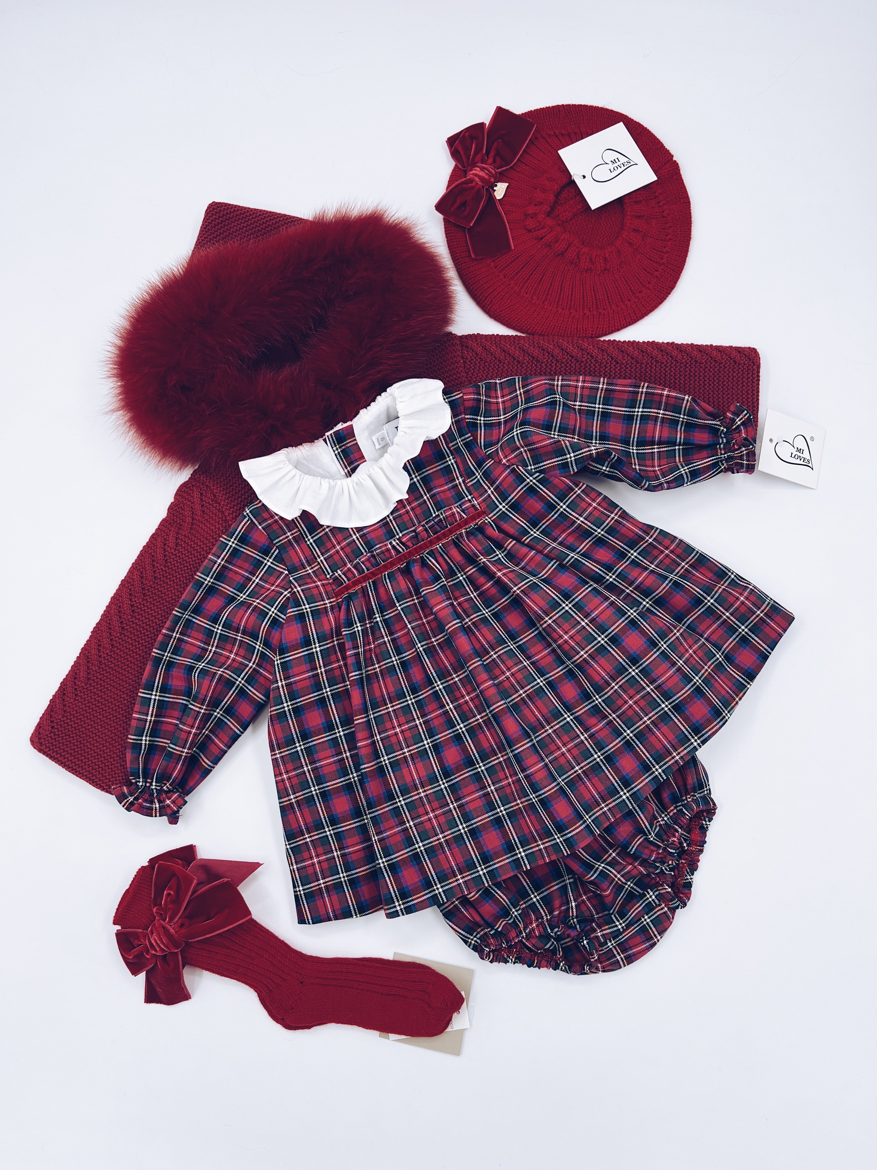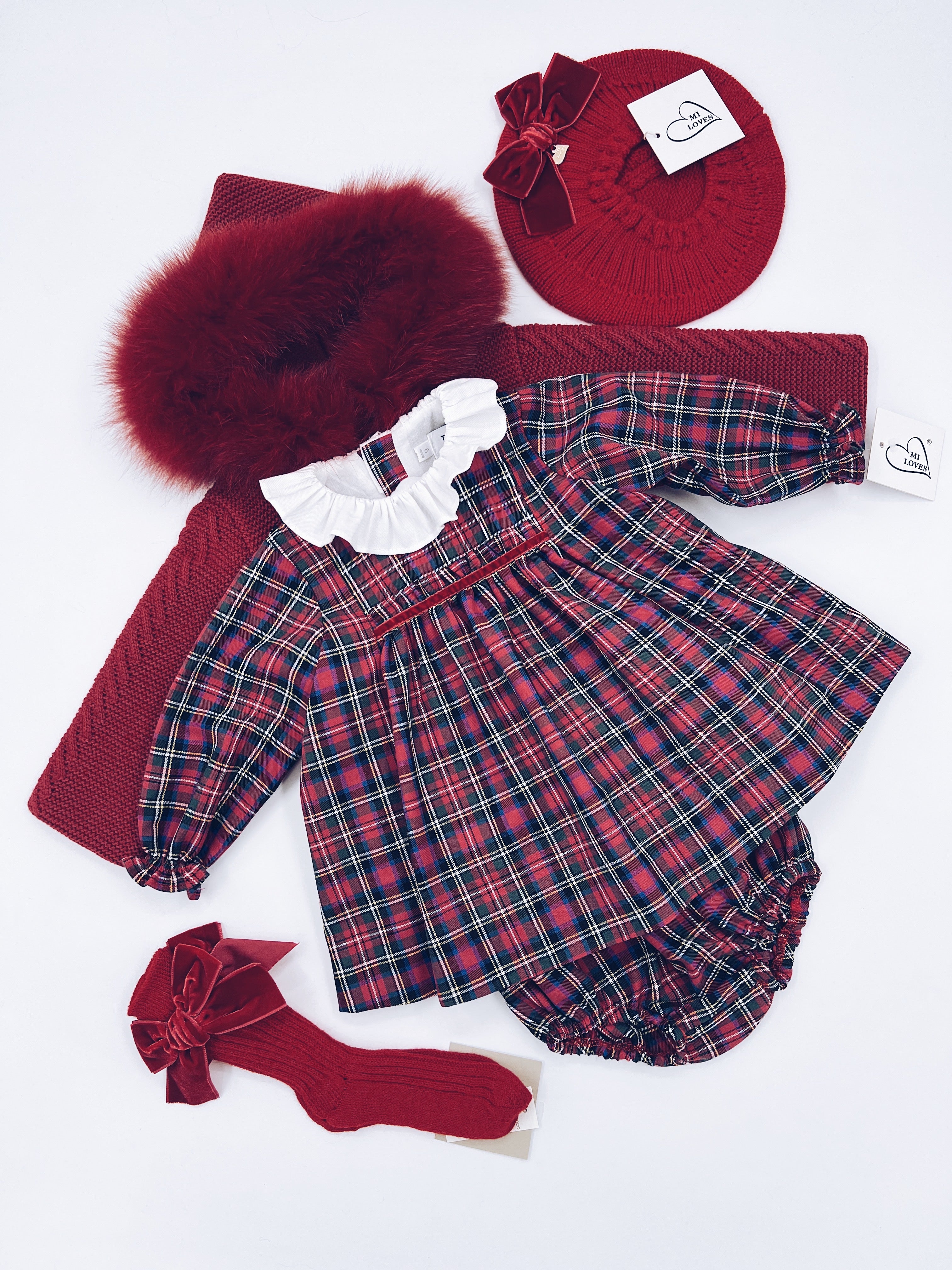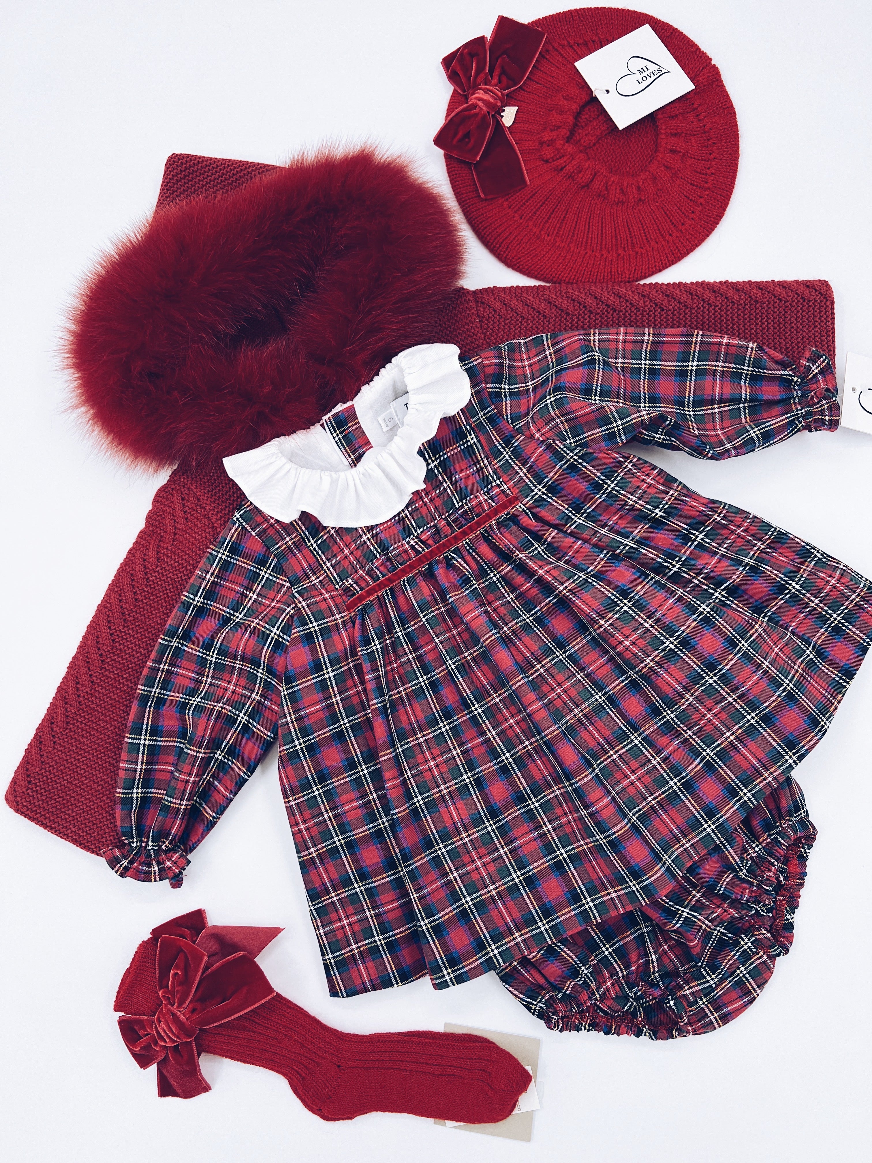 Beautiful Red tartan Dress/Bloomers 2 piece set with white frilly neck details.