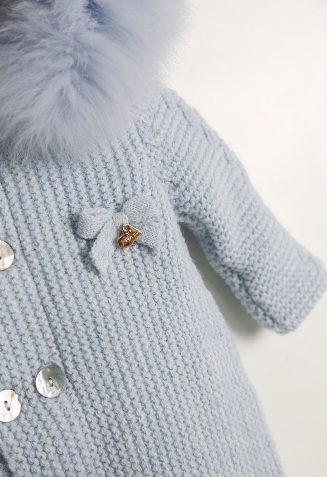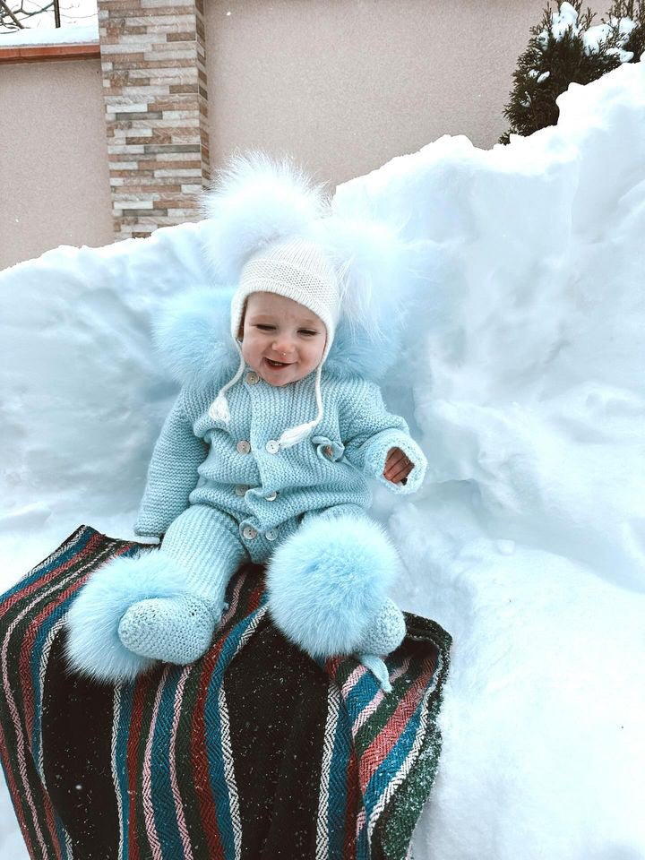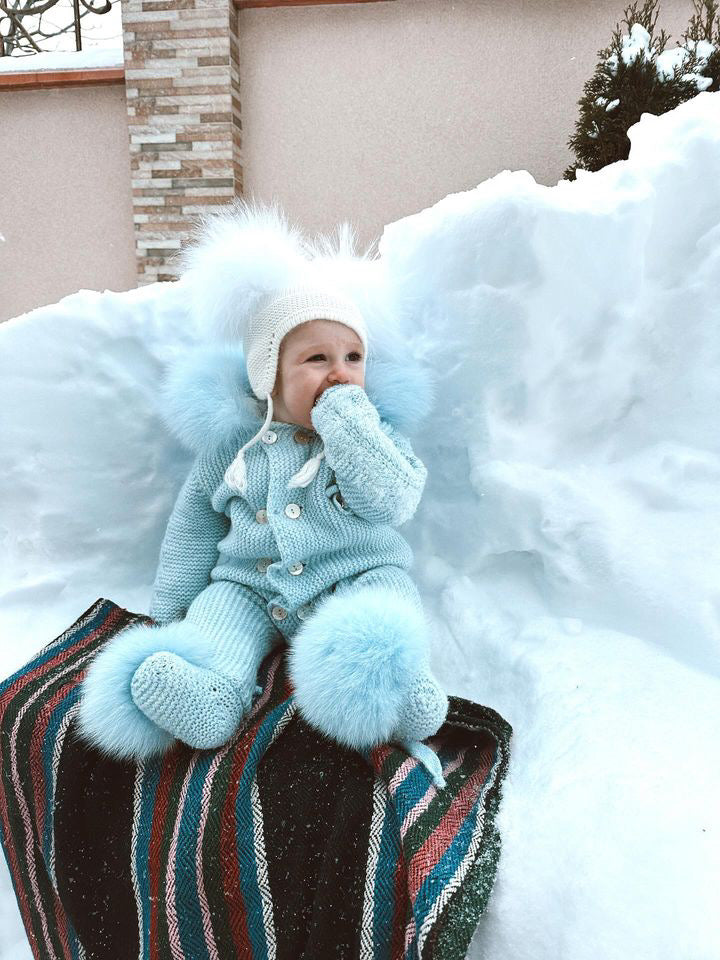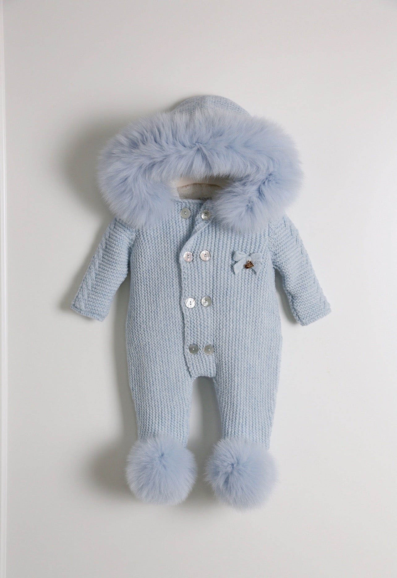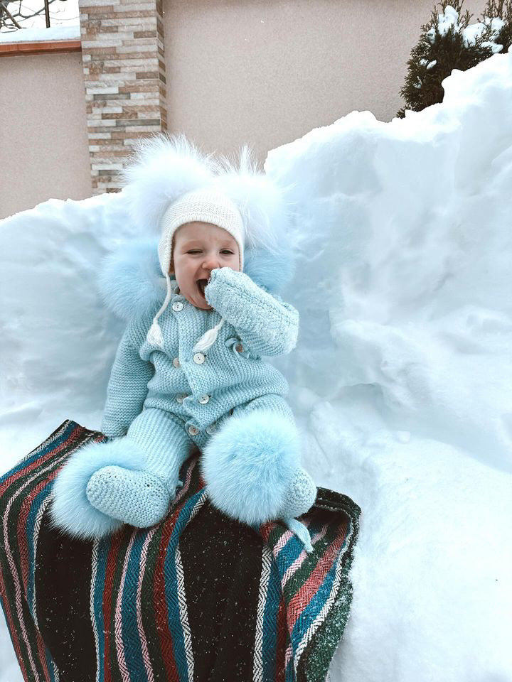 BLUE MI LOVES SIGNATURE Fox fur trim/pompoms Baby ANGEL pramsuit.Beatiful and Luxurious Baby pramsuit featuring detachable Fox fur trim on the hood and detachable Fox fur pompoms on the feet .Mother of pearls buttons.Soft Plush Cotton lining.Beautiful Angel wings details on the back.