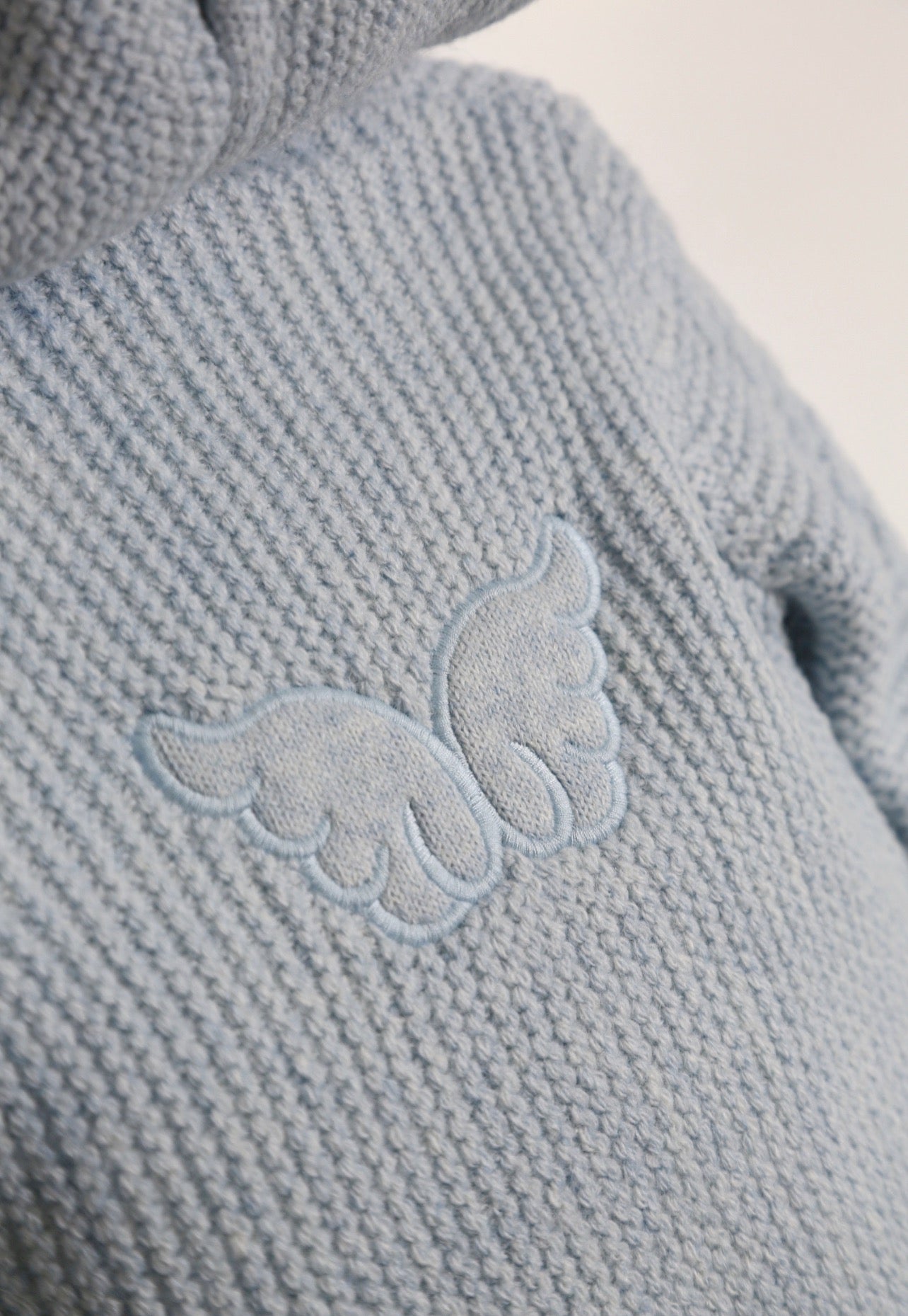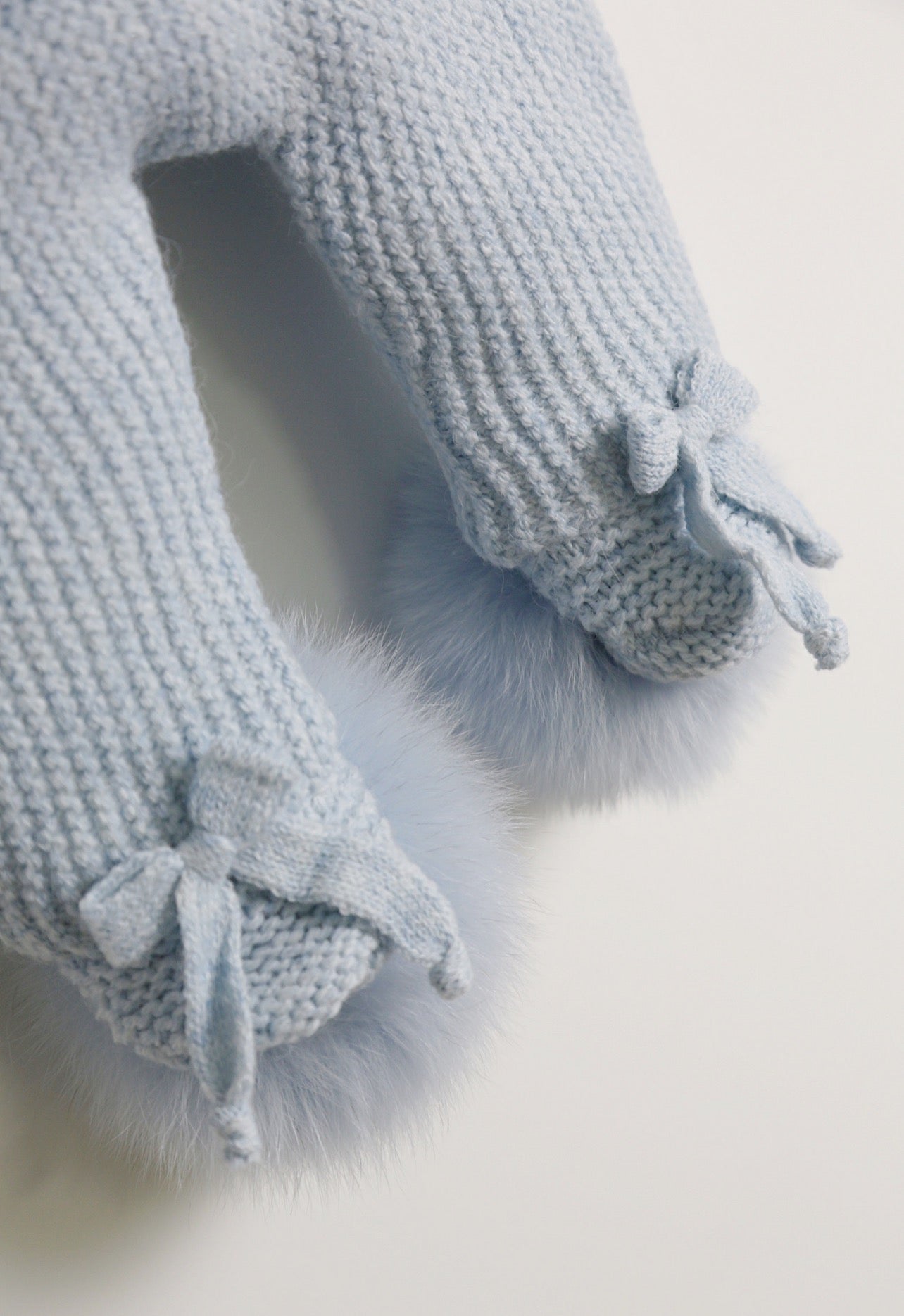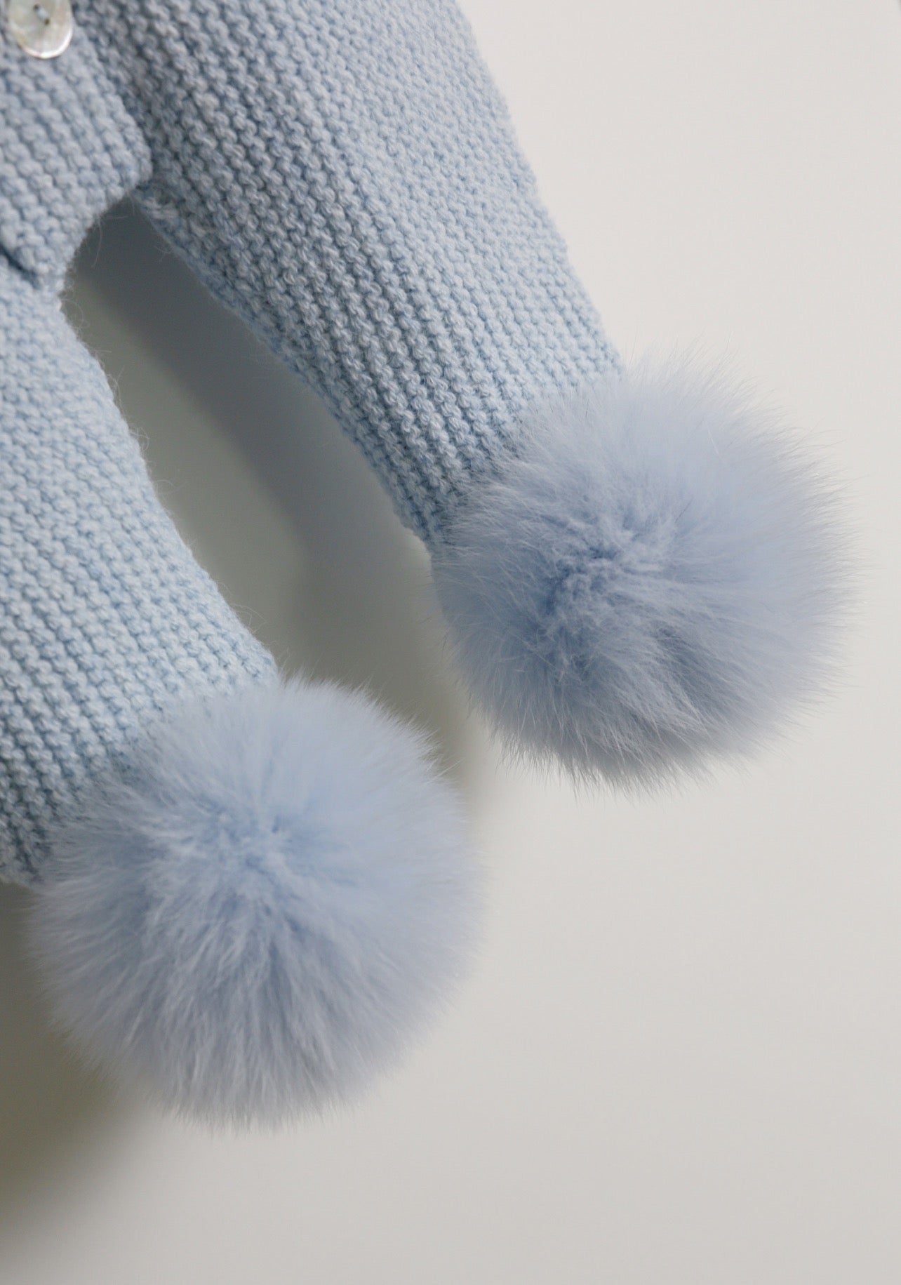 BLUE MI LOVES SIGNATURE Fox fur trim/pompoms Baby ANGEL pramsuit.Beatiful and Luxurious Baby pramsuit featuring detachable Fox fur trim on the hood and detachable Fox fur pompoms on the feet .Mother of pearls buttons.Soft Plush Cotton lining.Beautiful Angel wings details on the back.