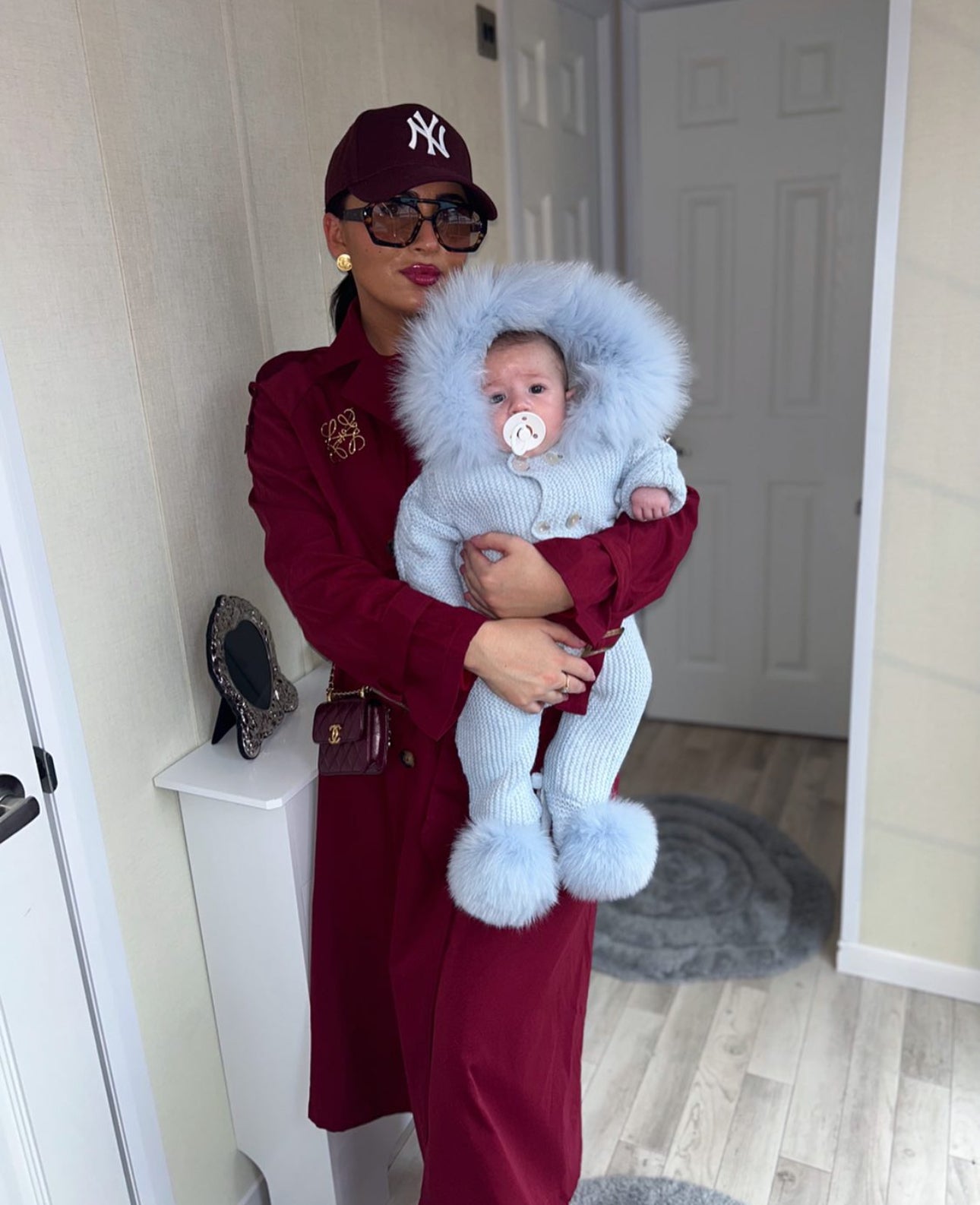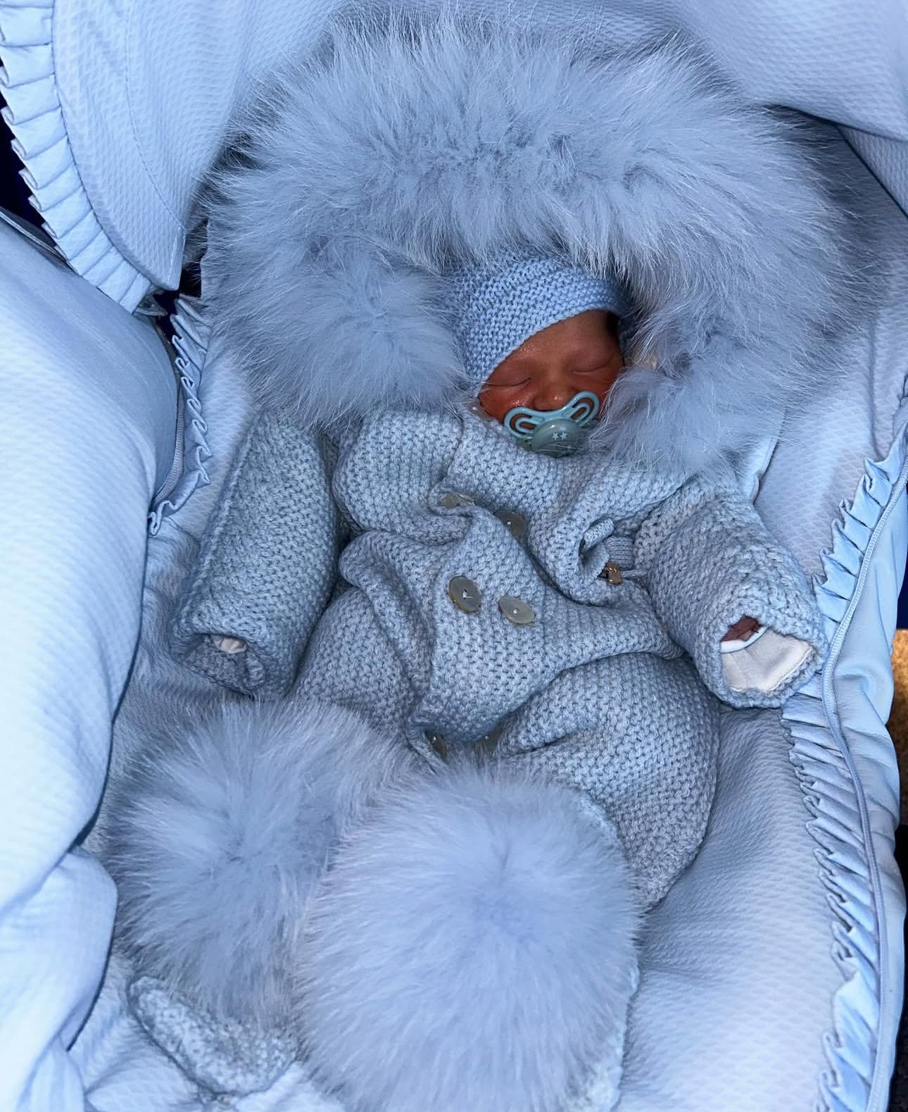 BLUE MI LOVES SIGNATURE Fox fur trim/pompoms Baby ANGEL pramsuit. C