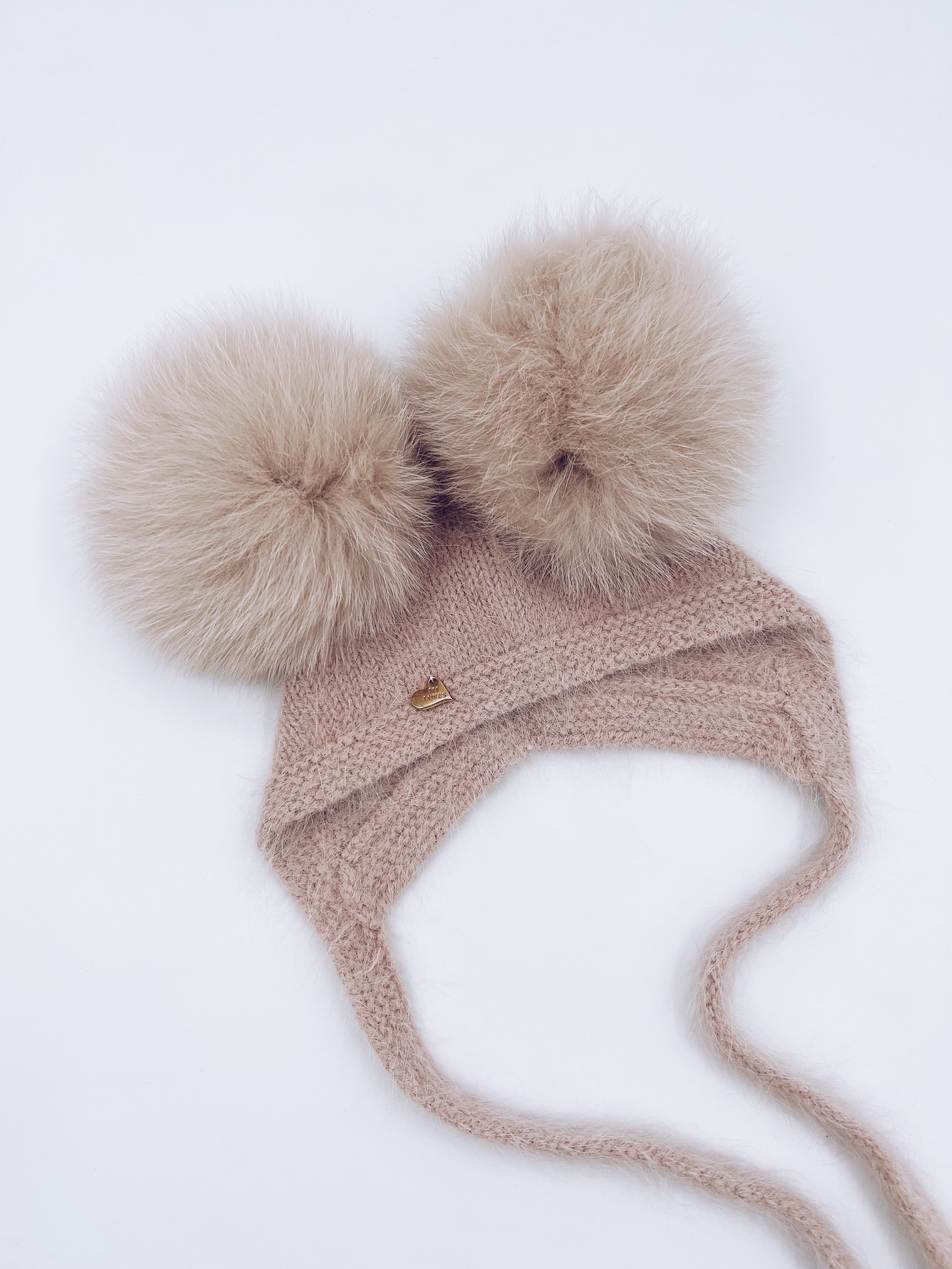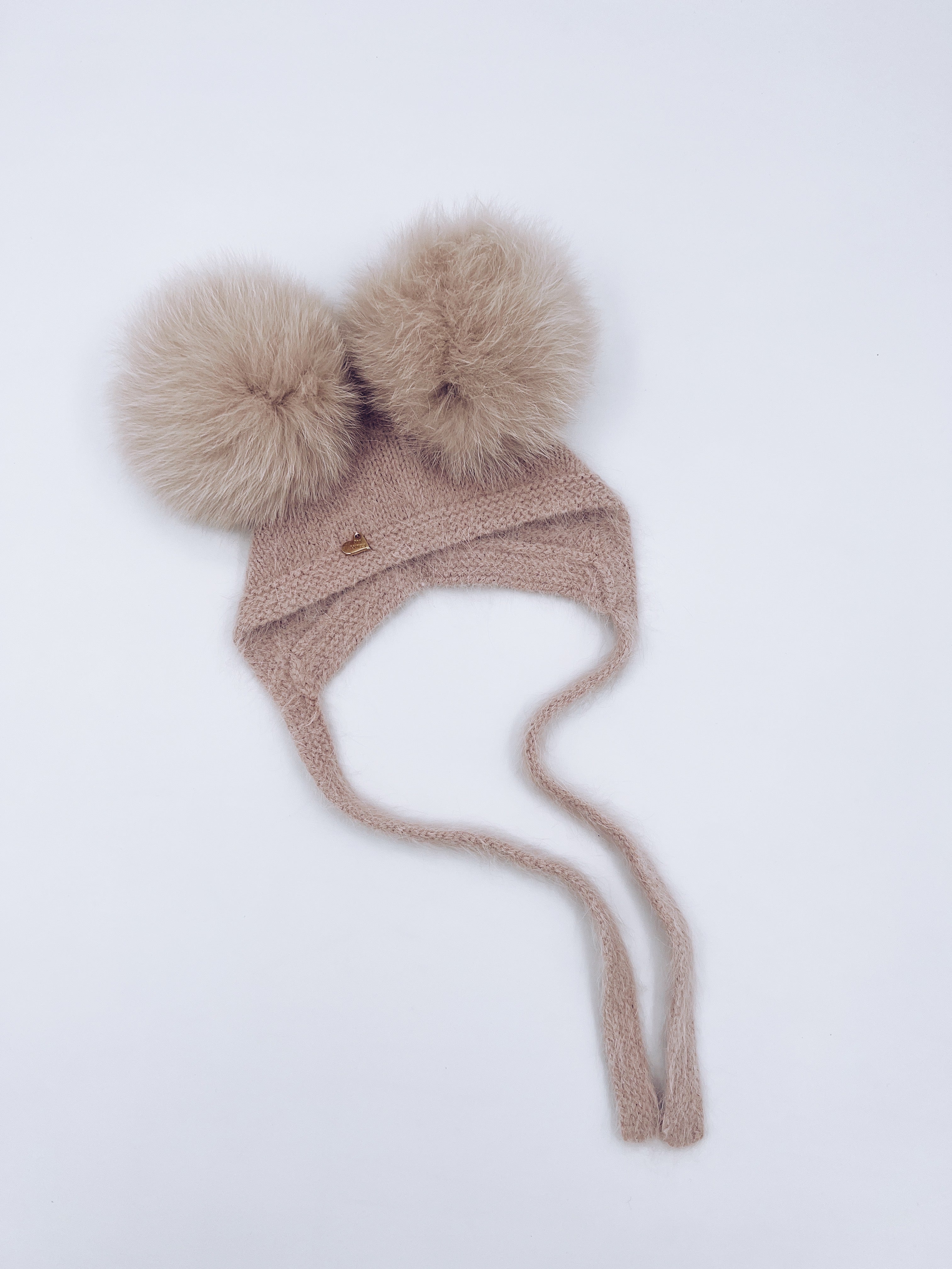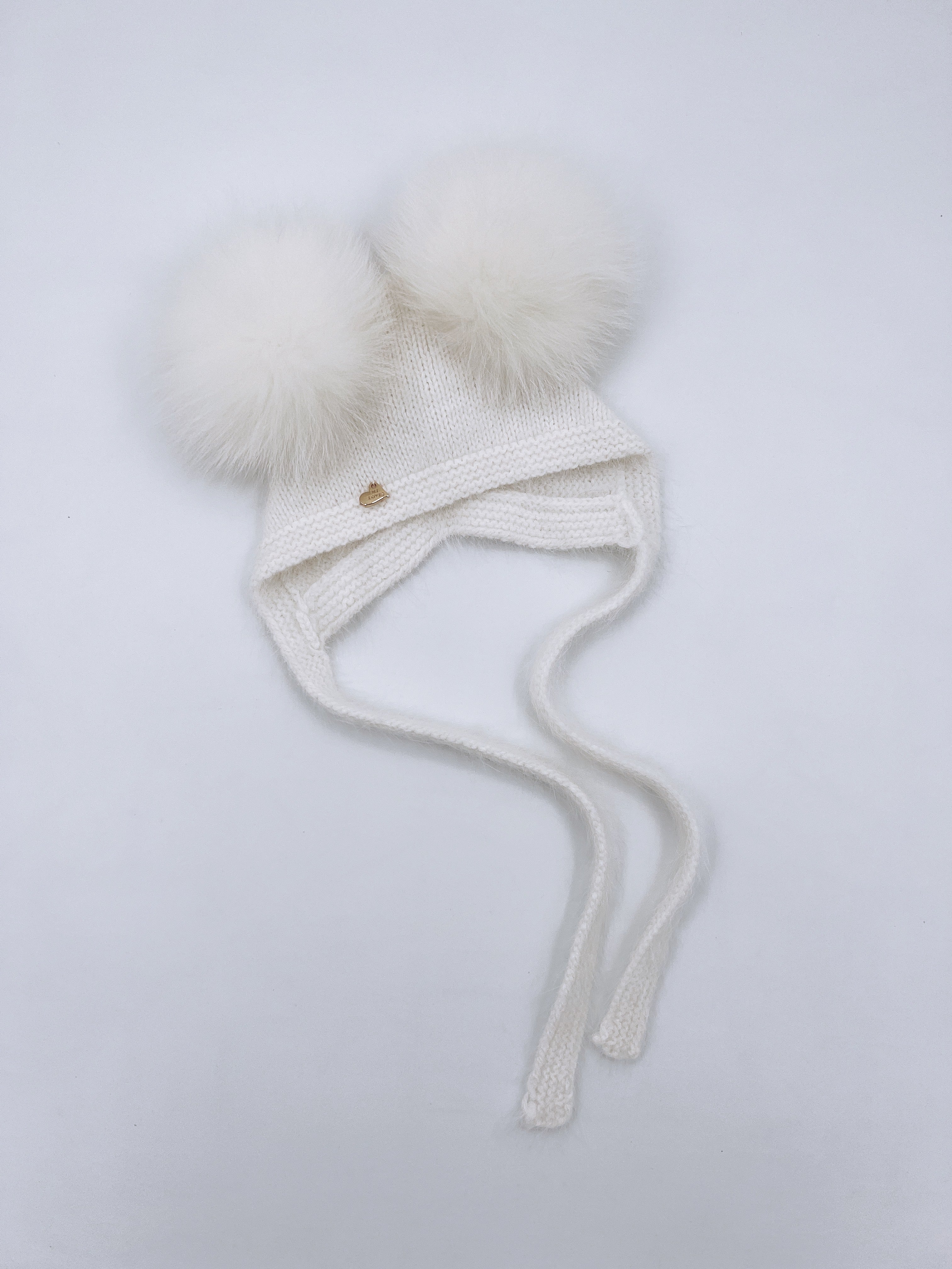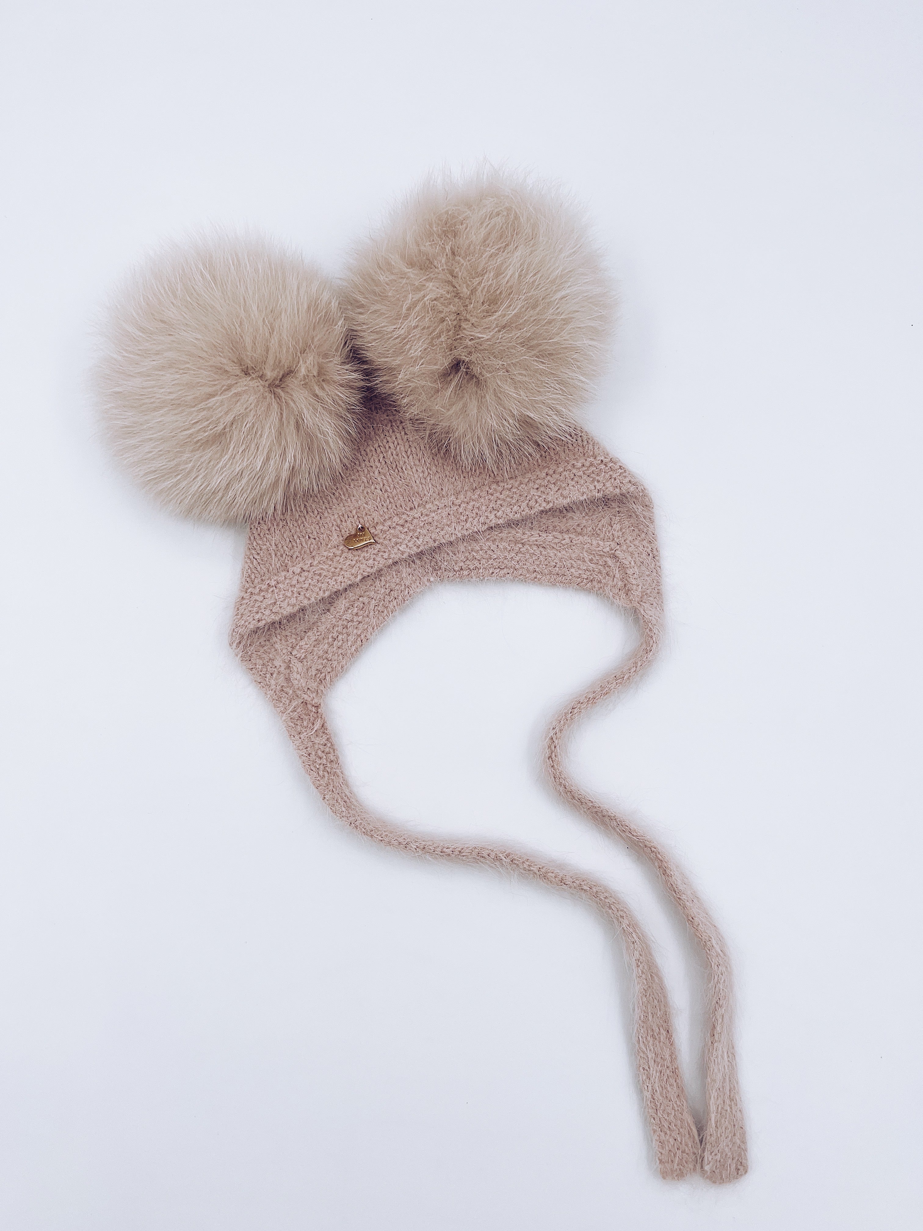 MI LOVES SIGNATURE Little Bear Angora Double pompom hat.Beautiful,Soft and warm angora yarn and lovely big round fox fur pompoms.