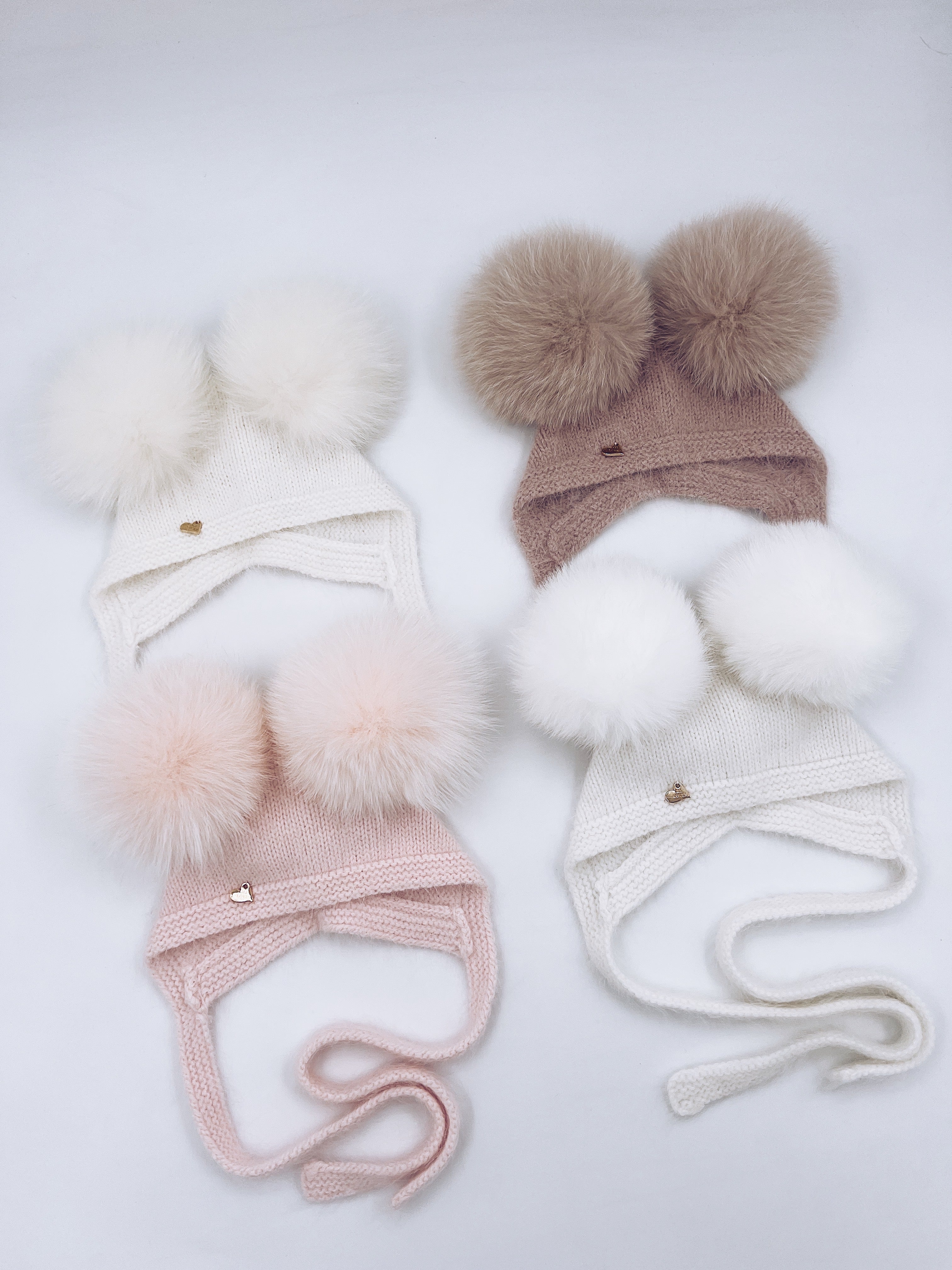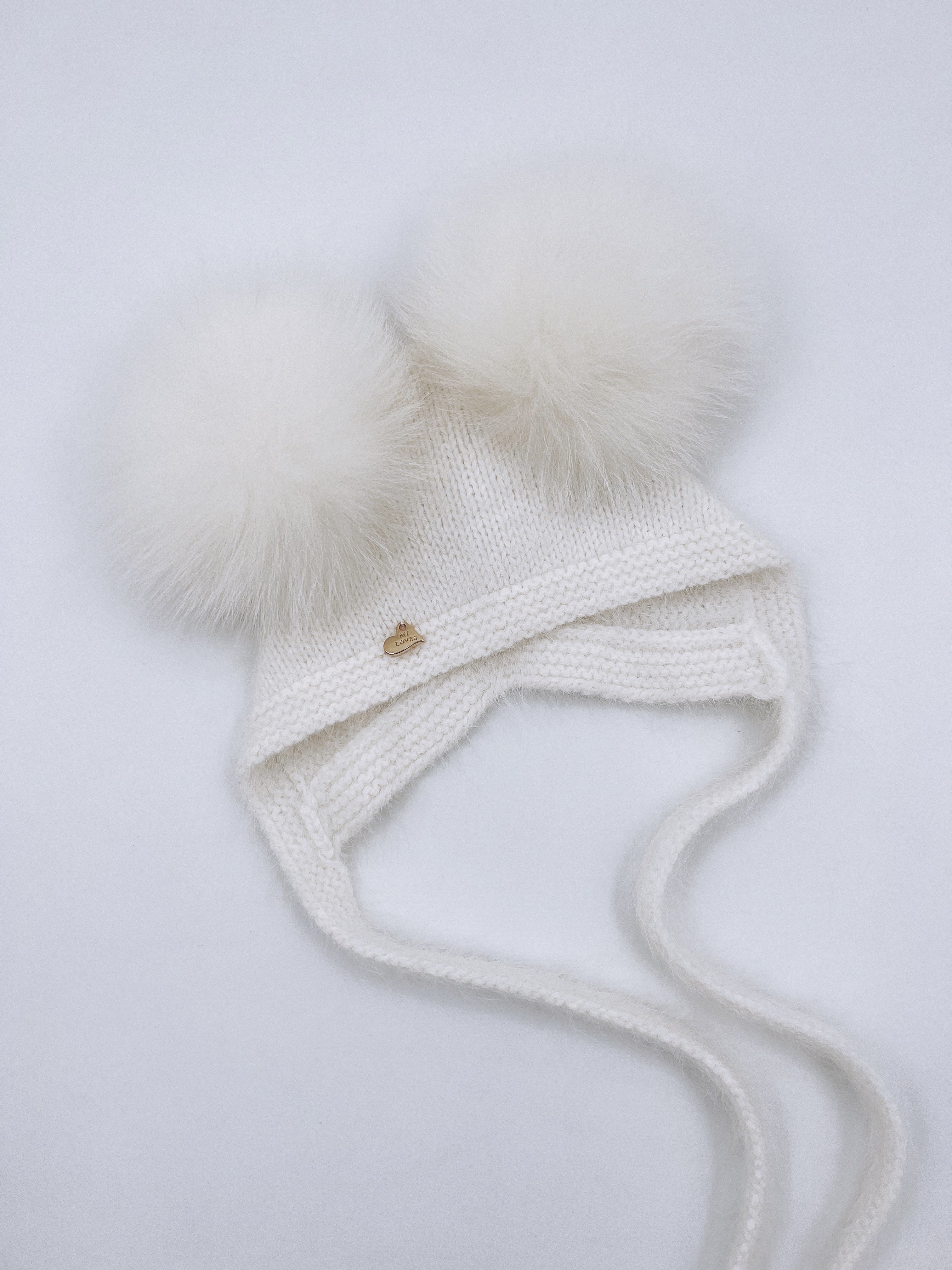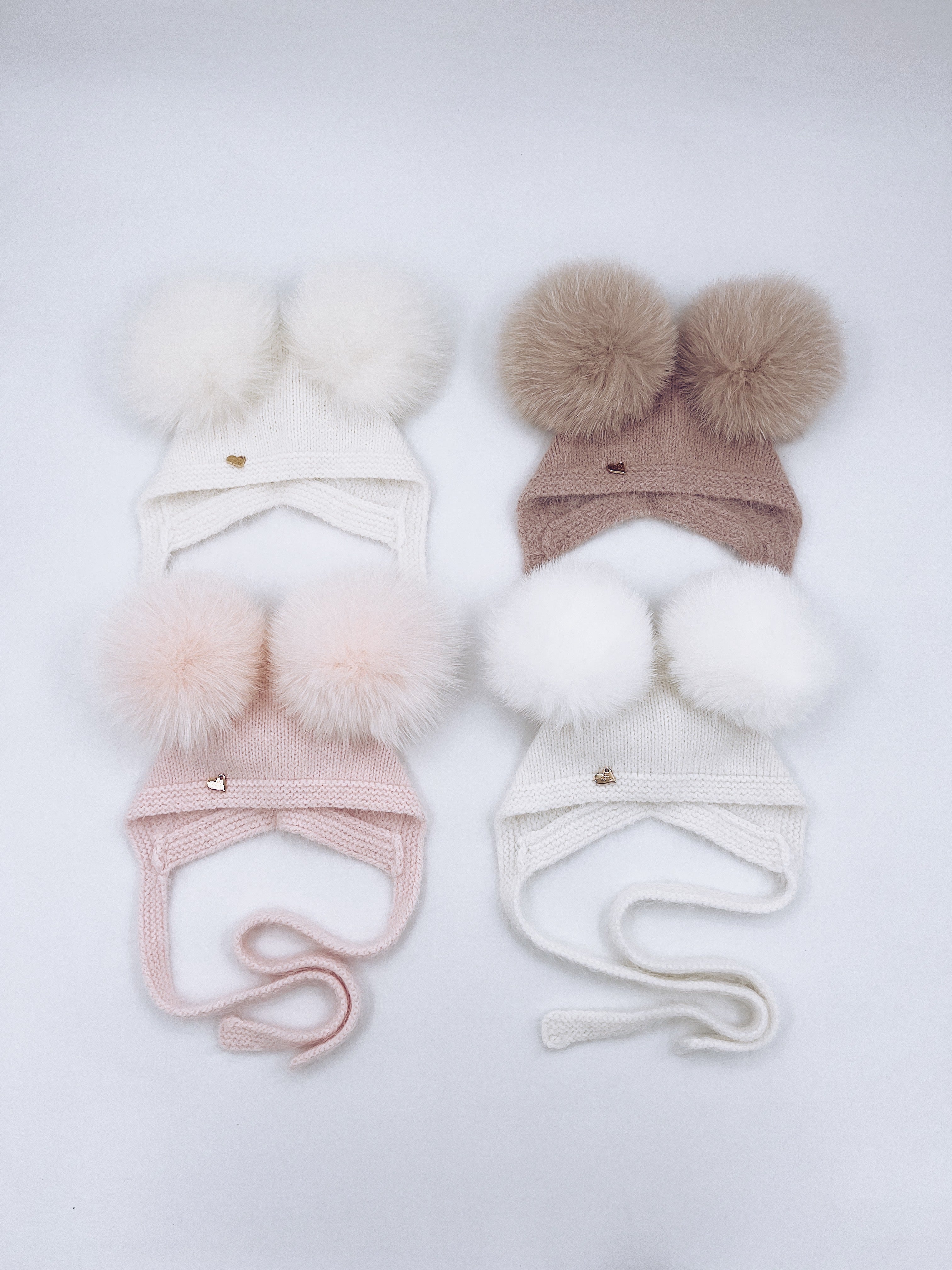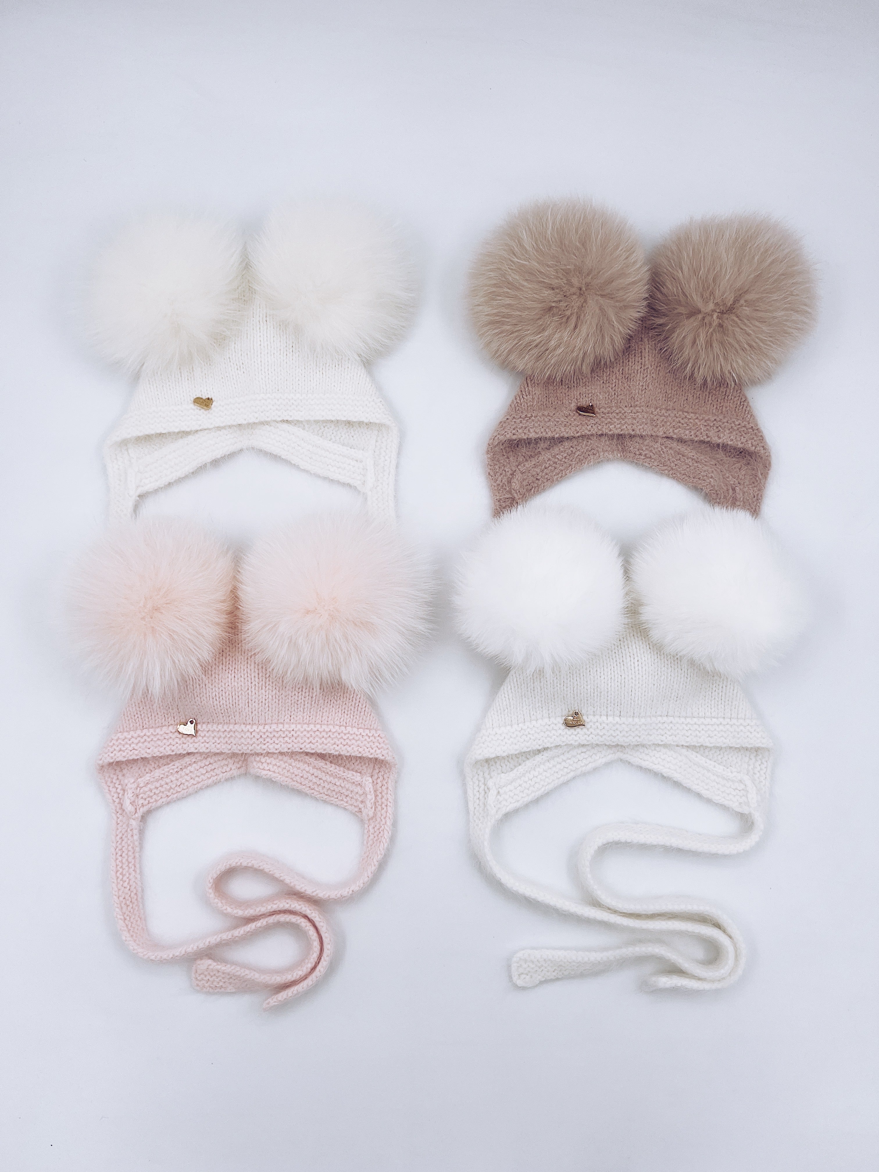 MI LOVES SIGNATURE Little Bear Angora Double pompom hat.Beautiful,Soft and warm angora yarn and lovely big round fox fur pompoms.