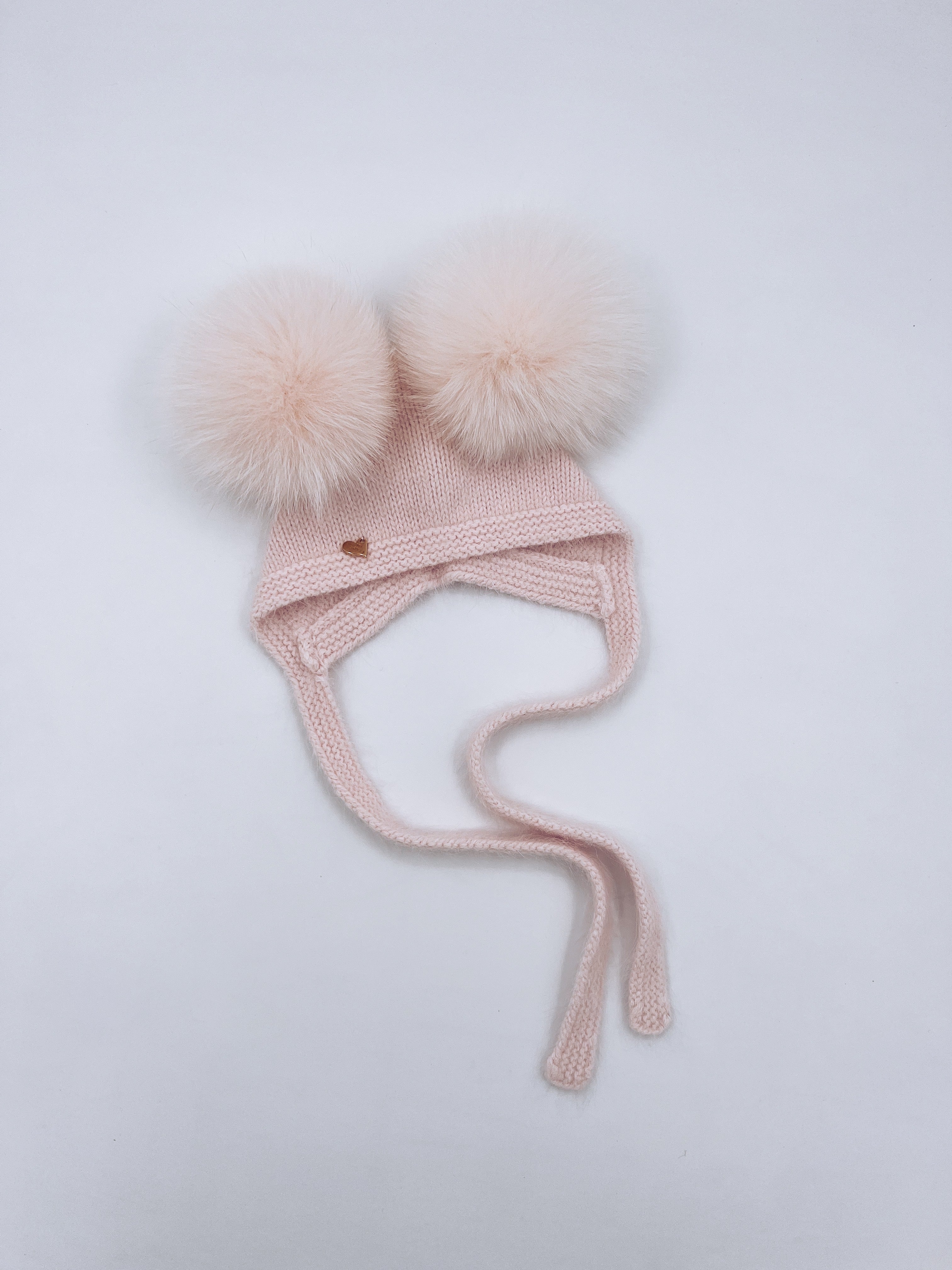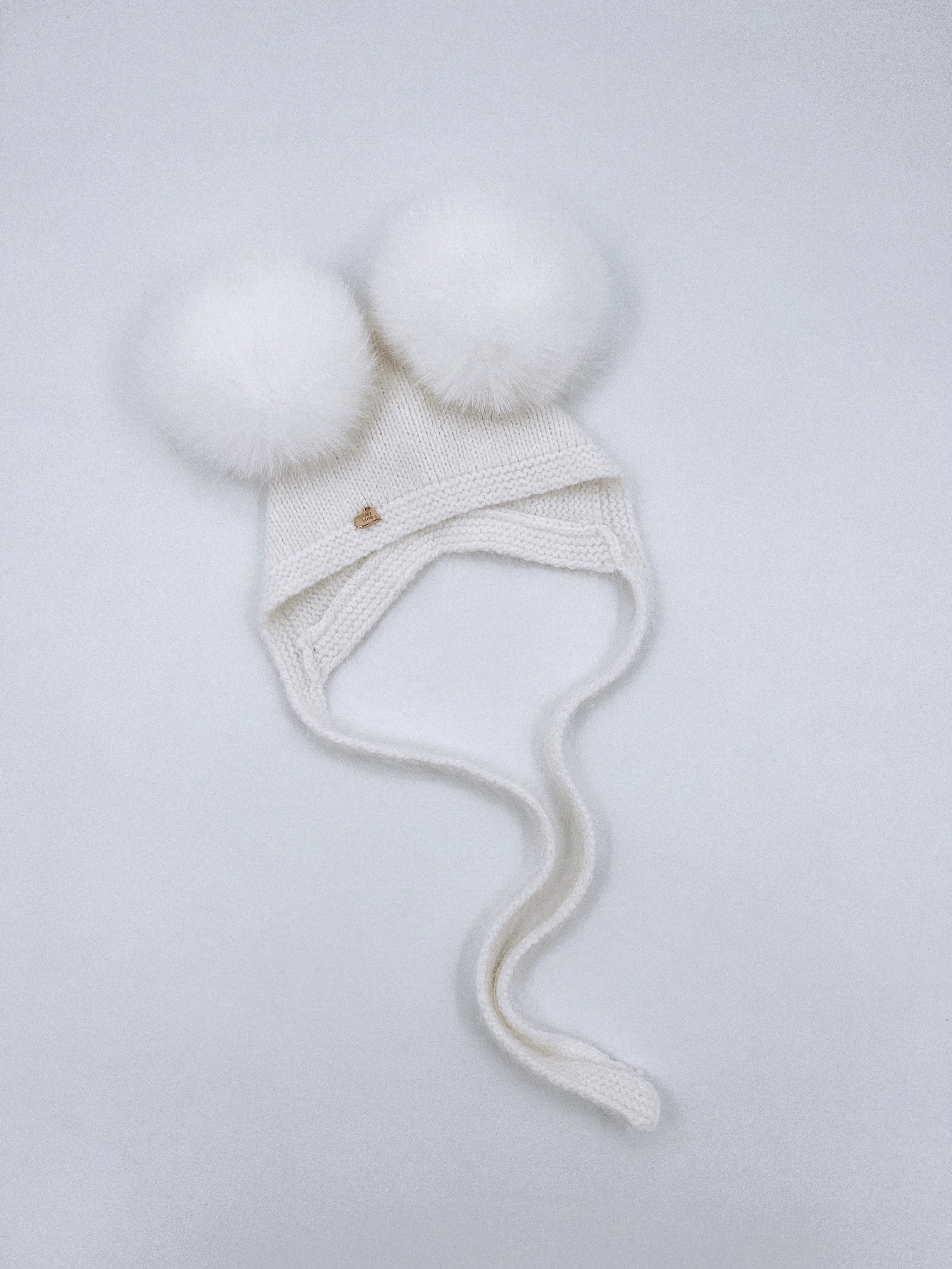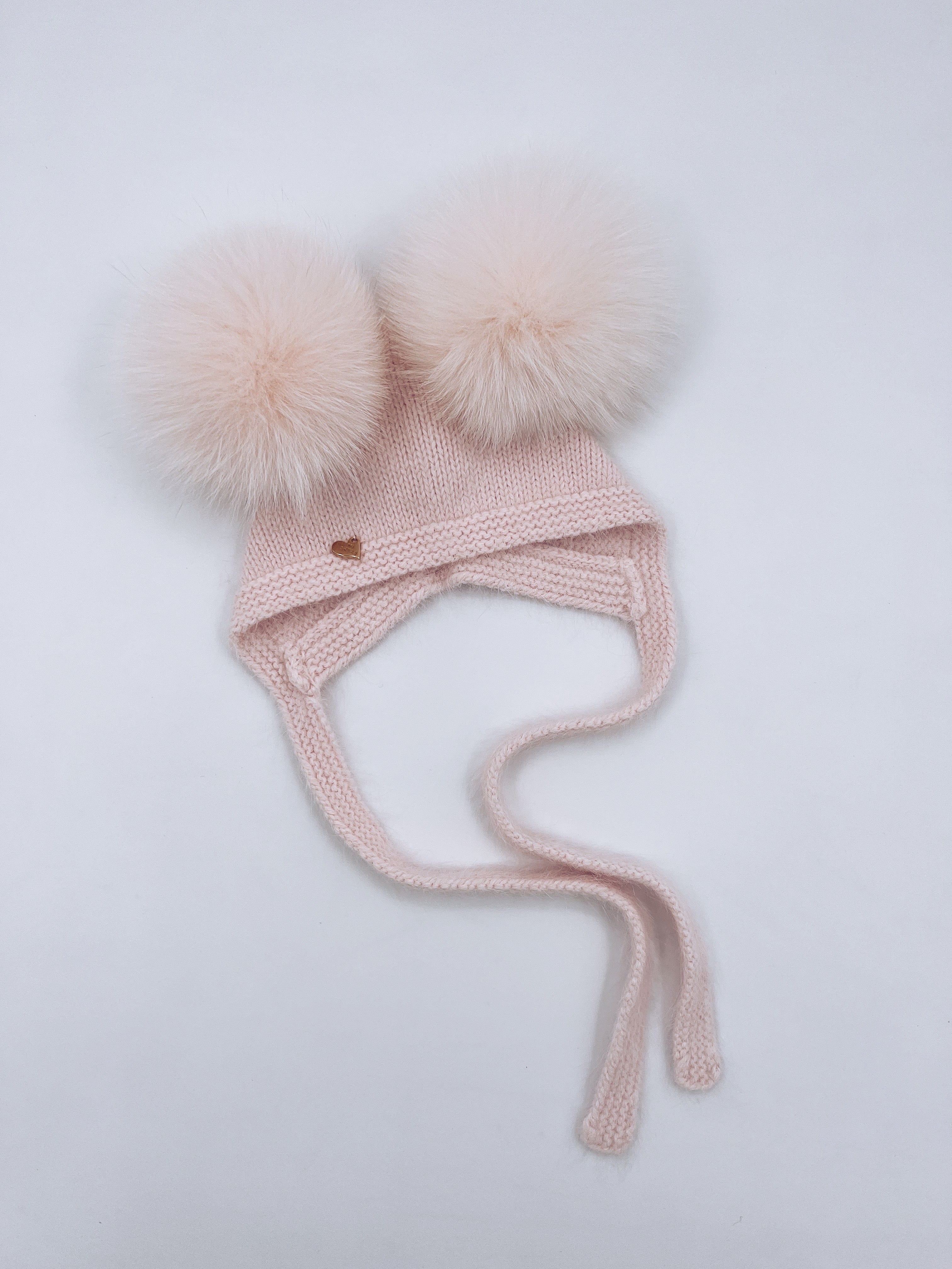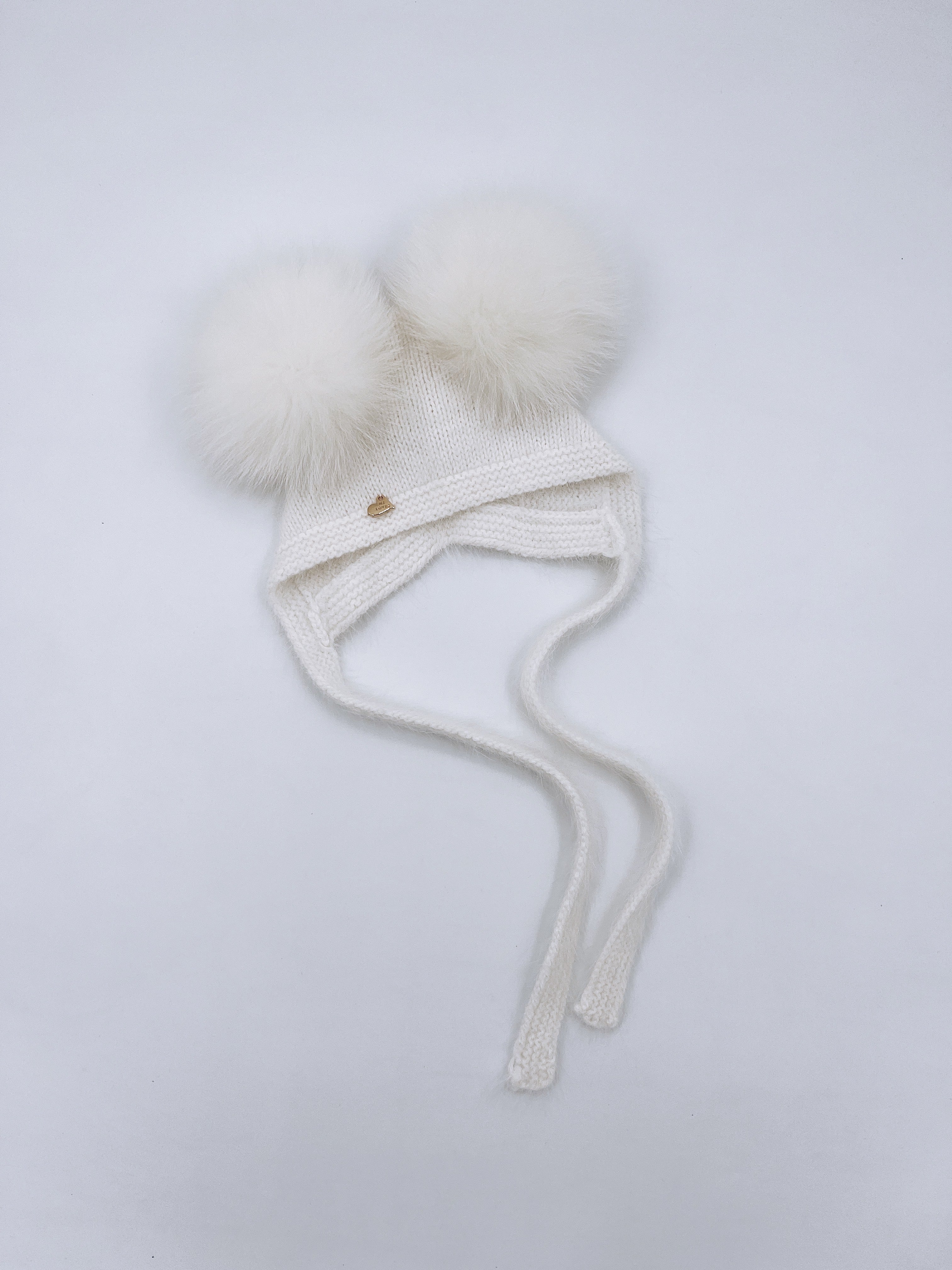 MI LOVES SIGNATURE Little Bear Angora Double pompom hat.Beautiful,Soft and warm angora yarn and lovely big round fox fur pompoms.