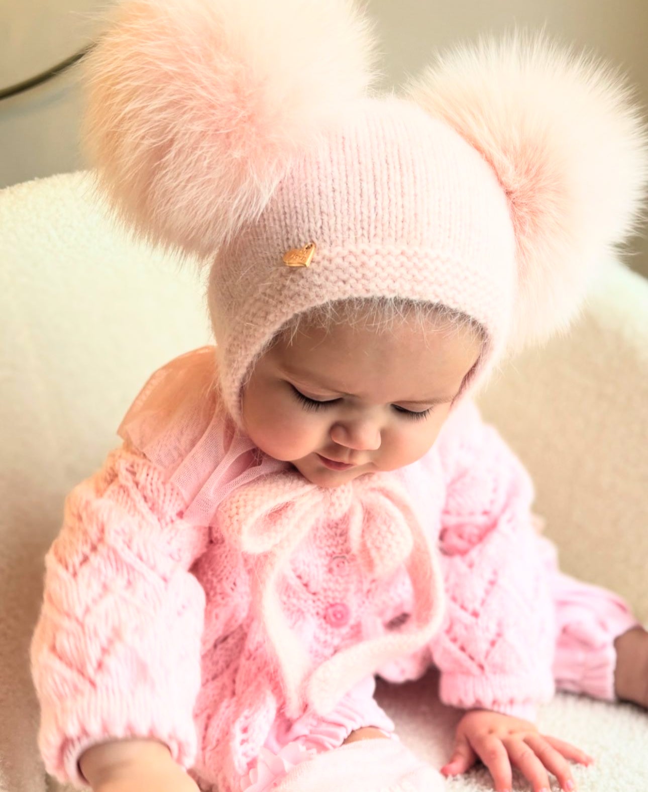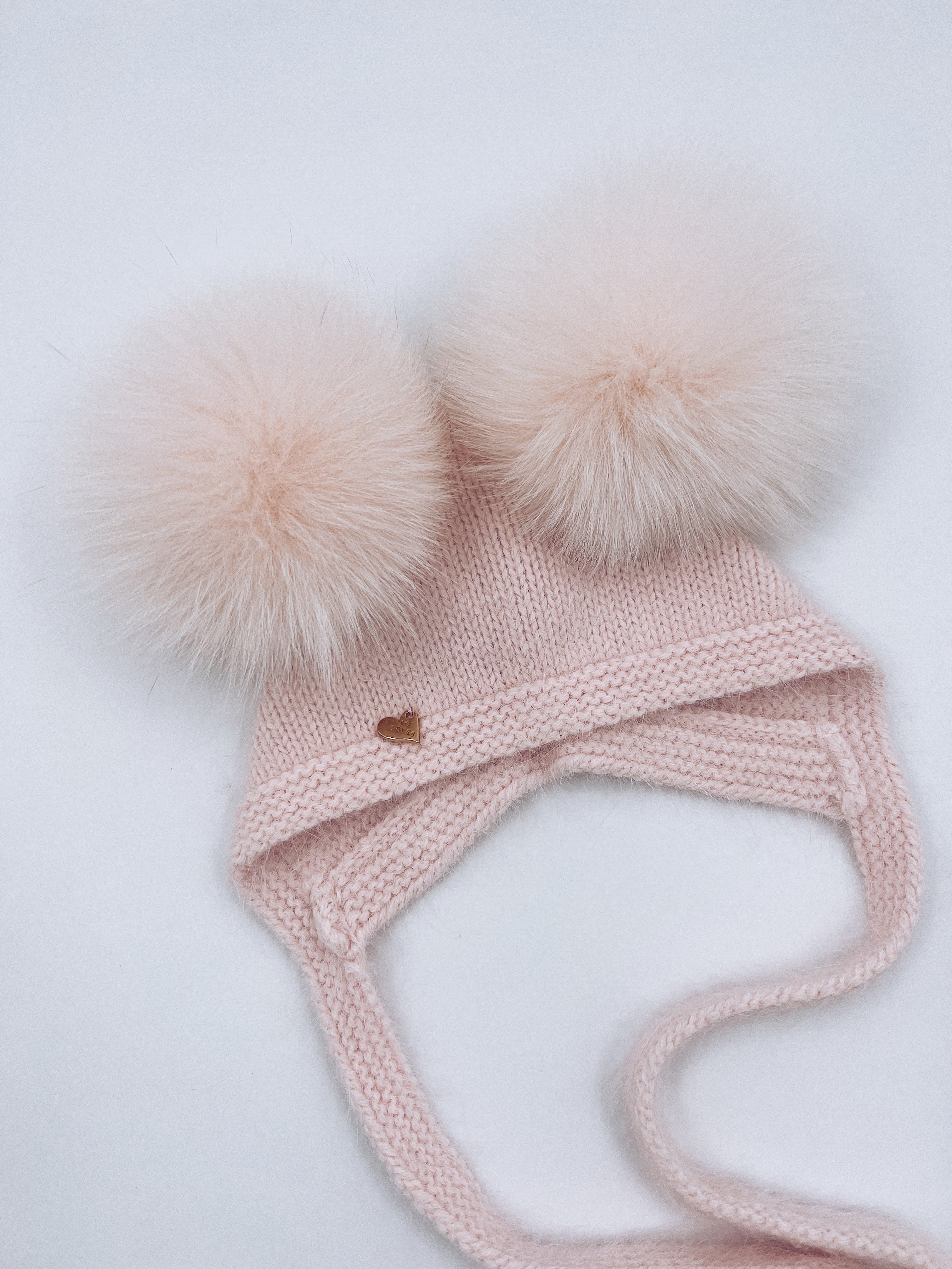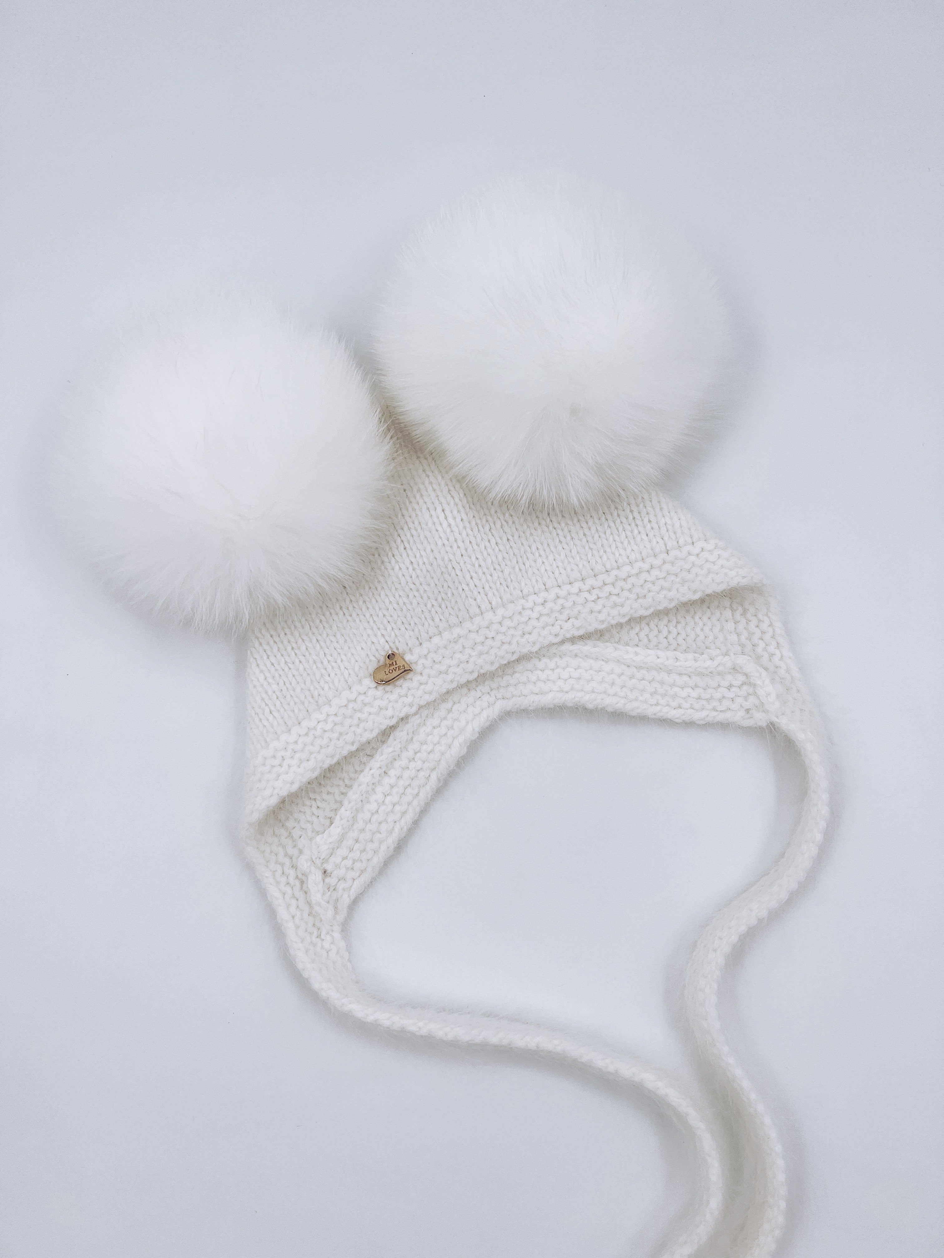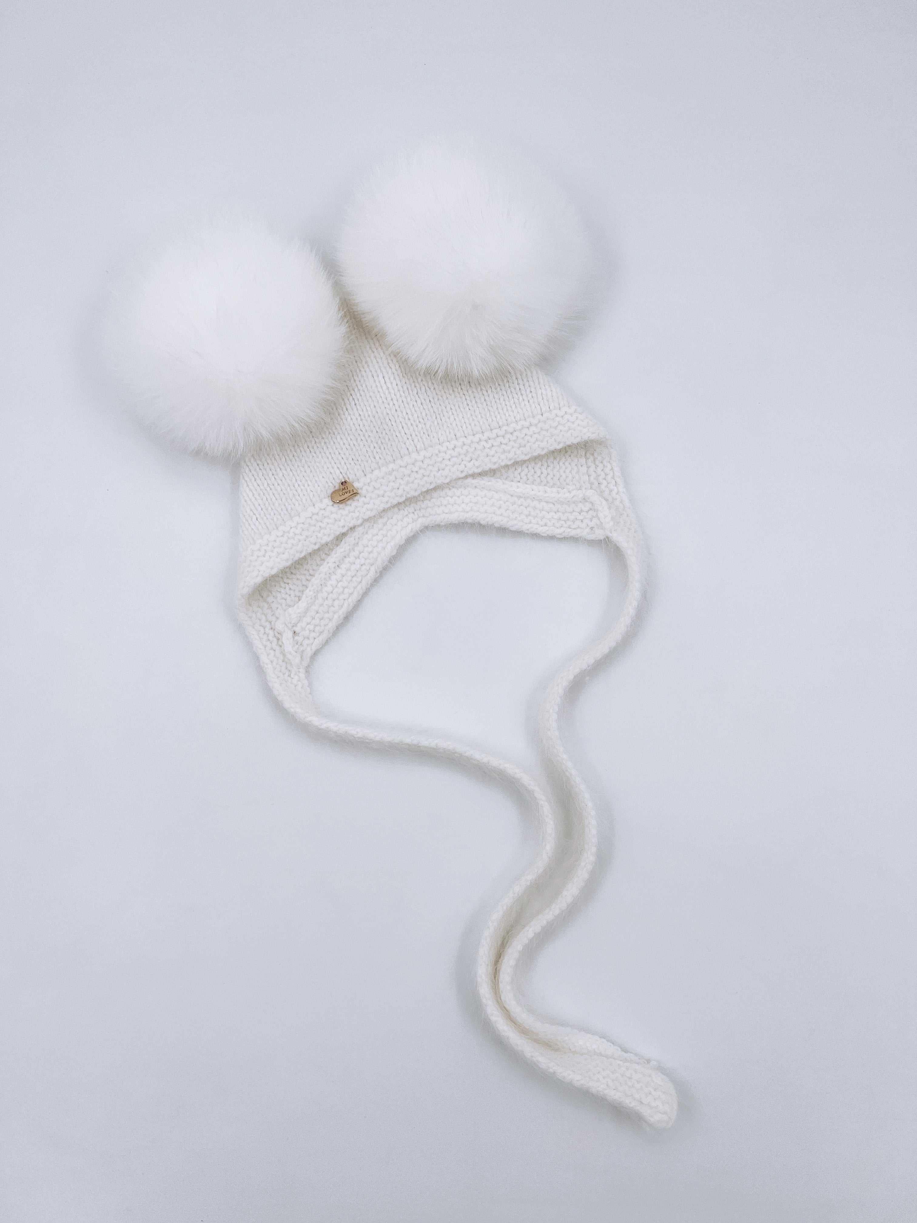 MI LOVES SIGNATURE Little Bear Angora Double pompom hat.Beautiful,Soft and warm angora yarn and lovely big round fox fur pompoms.