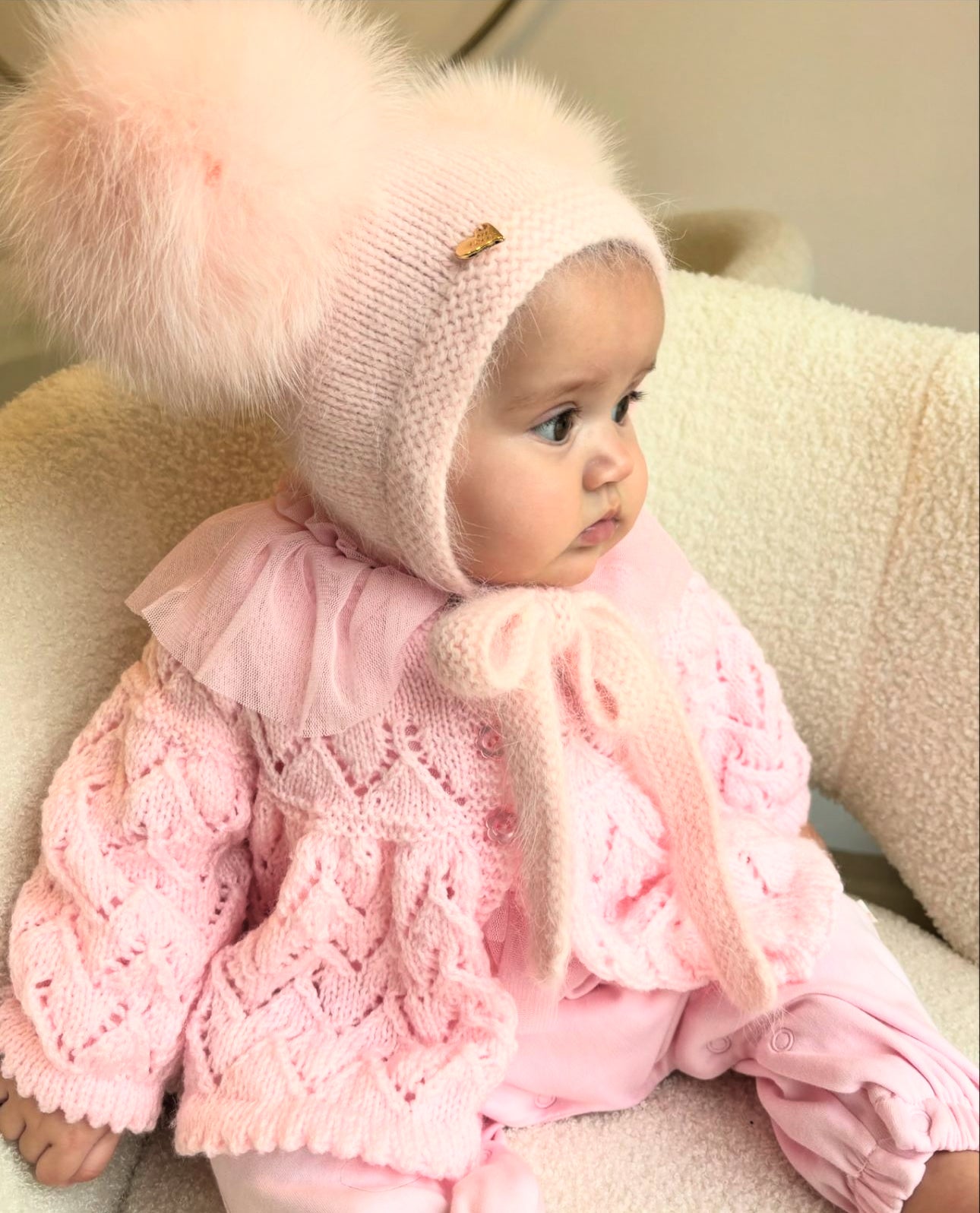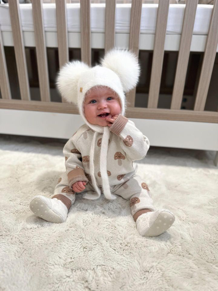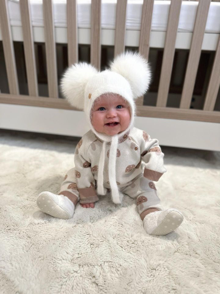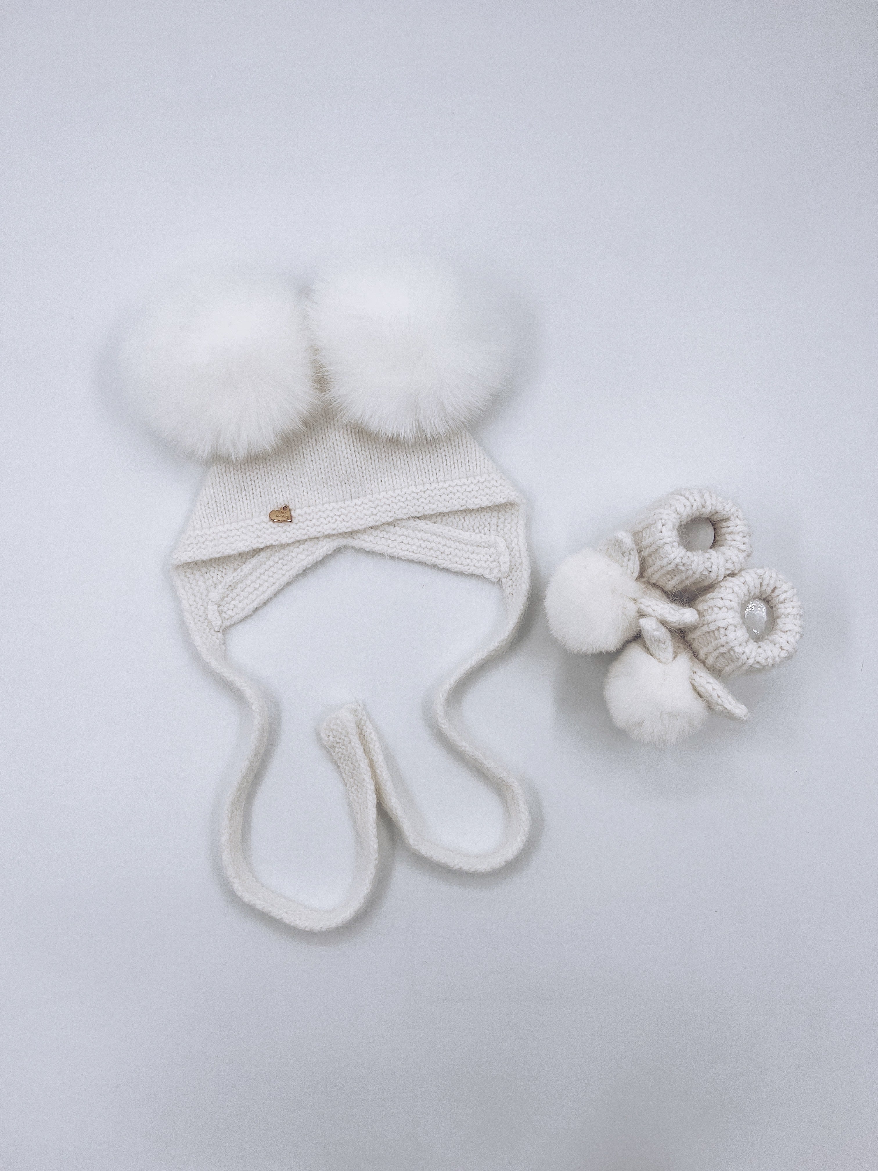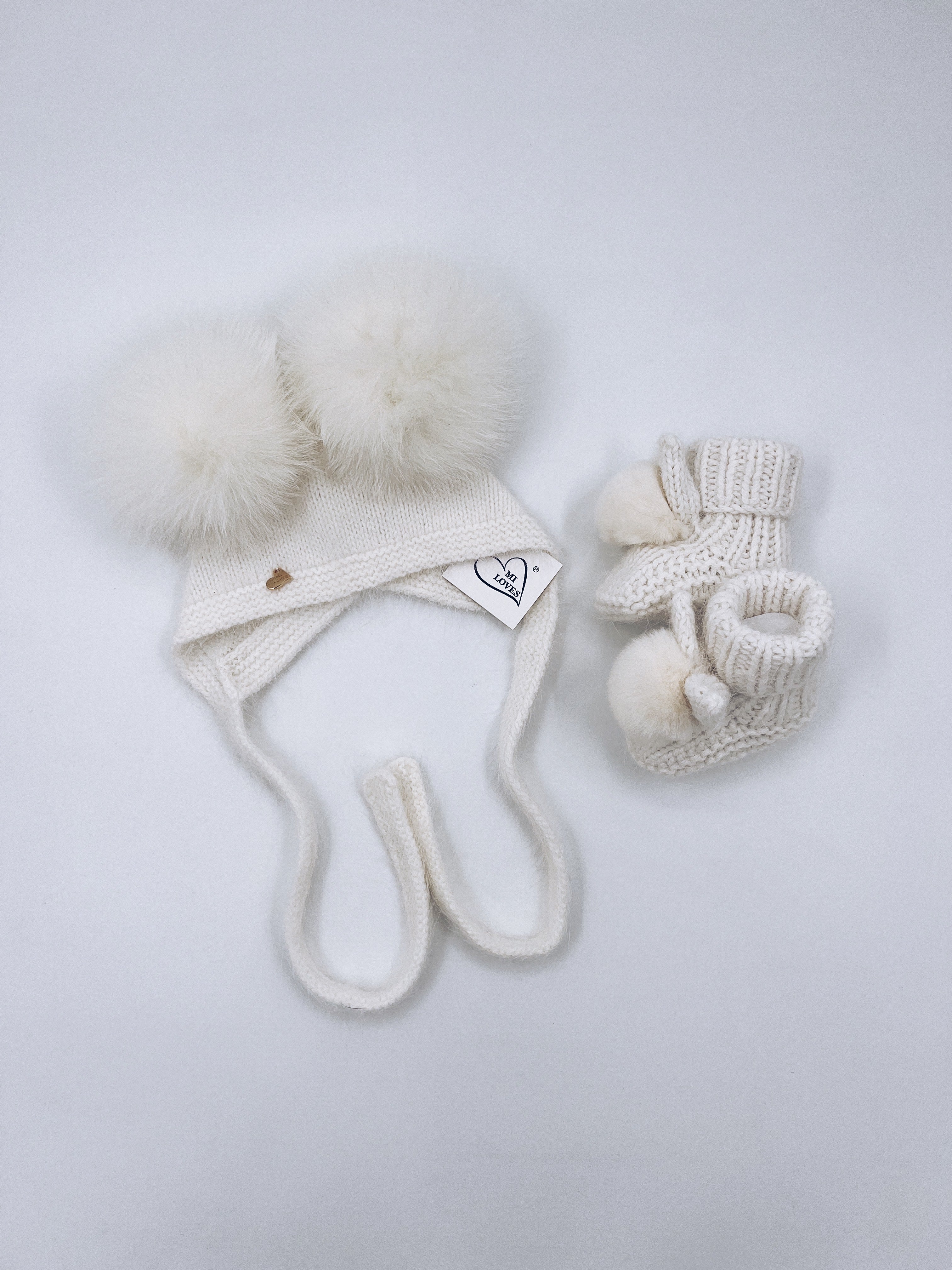 Matching knitted pompom booties (Sold Separately)also available on the website.