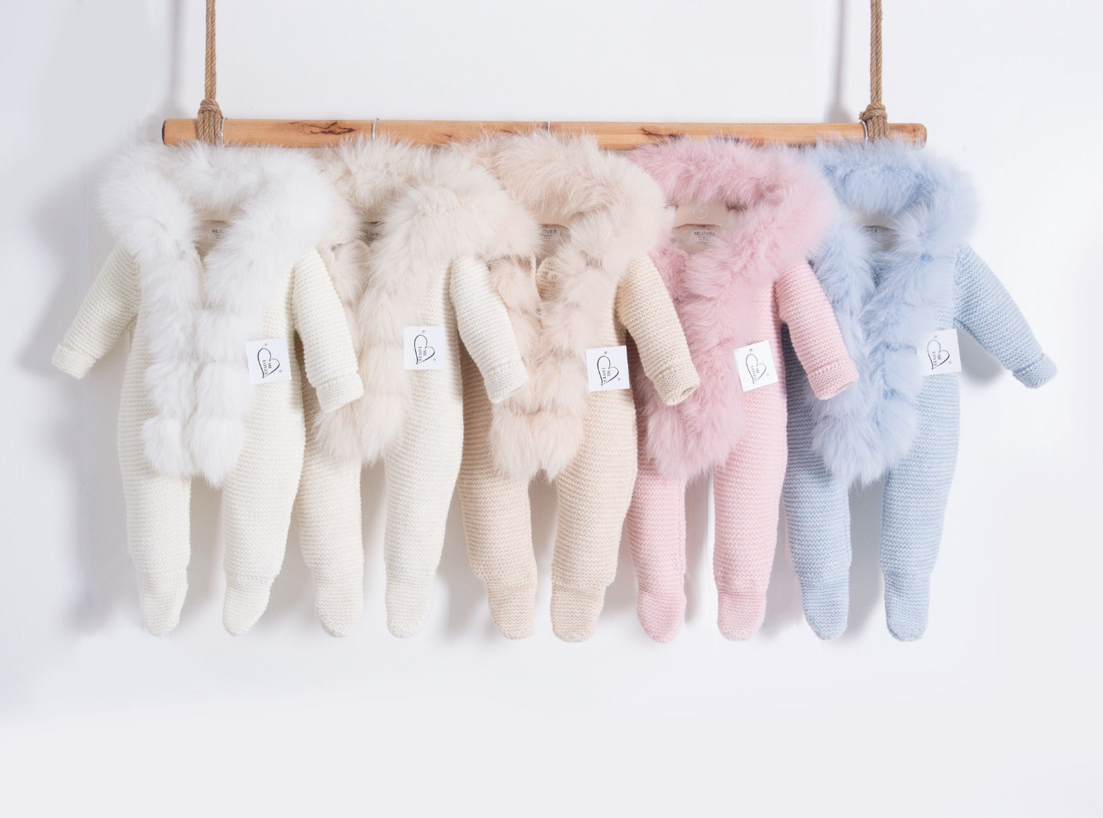 Pramsuit ONLY,matching pompom hat,Cardigan,Pompom booties and Leggings also available on the website (Sold Separately)