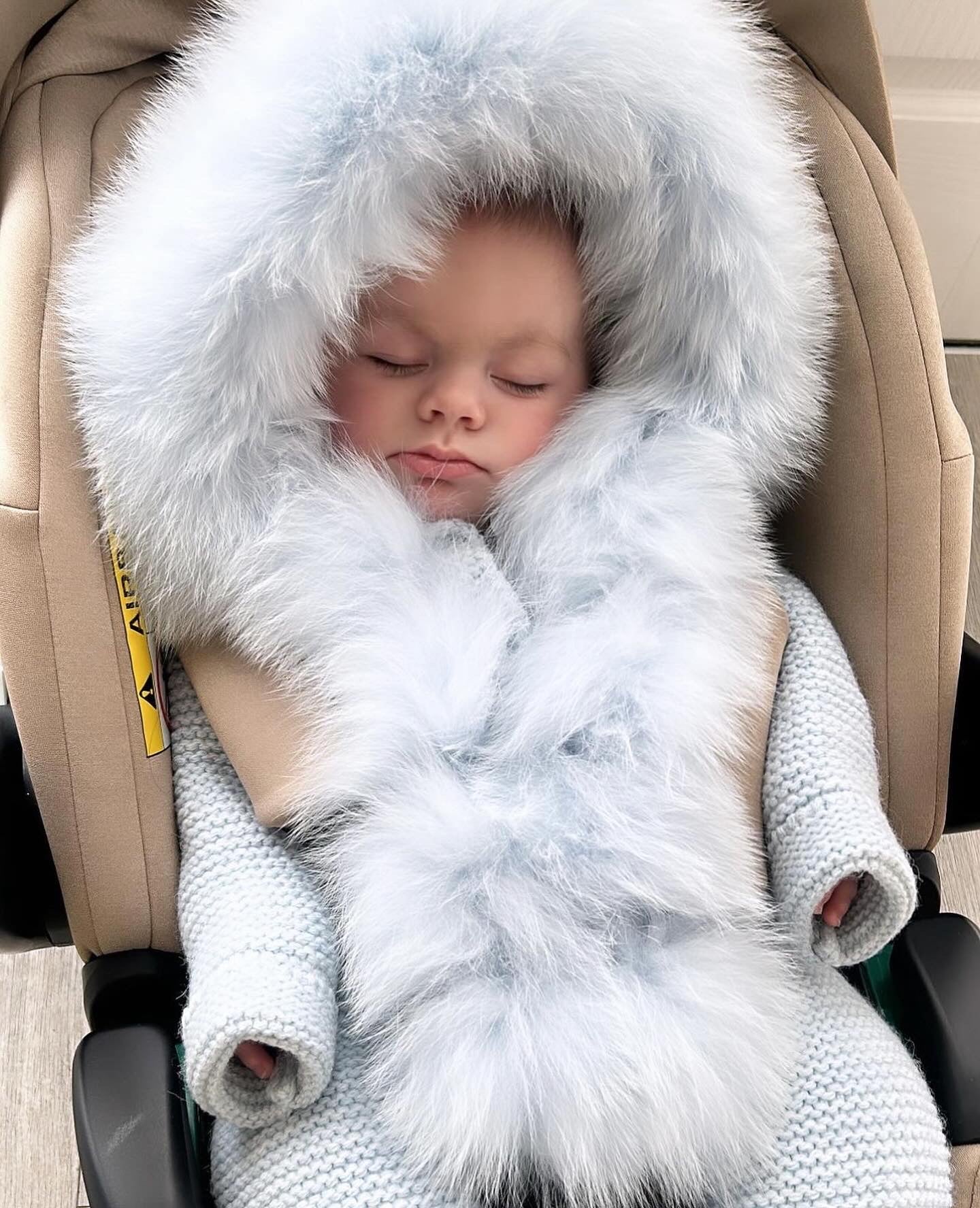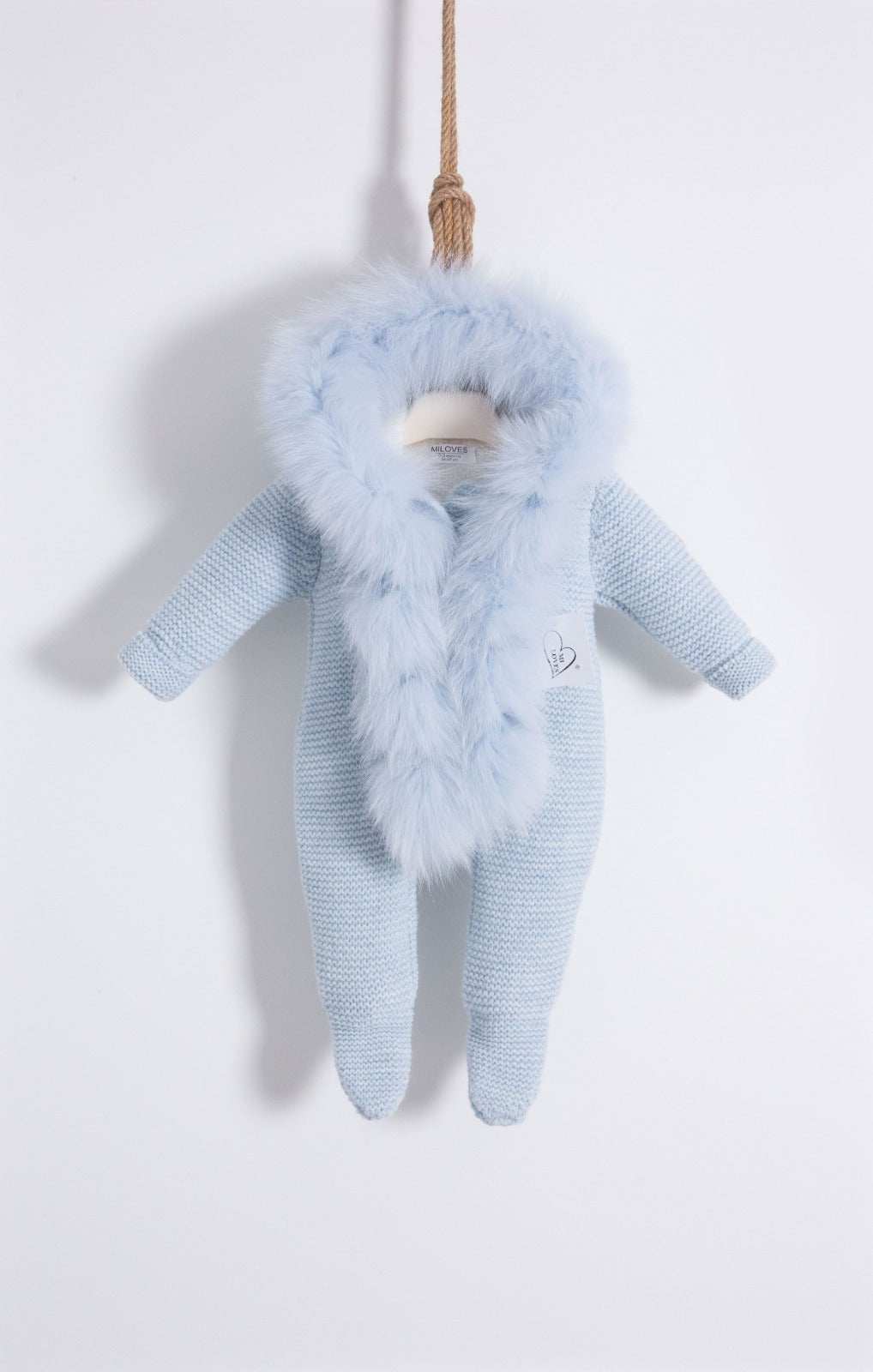 MI LOVES SIGNATURE Pale Blue Knitted Pramsuit with Luxurious Fox fur trim.