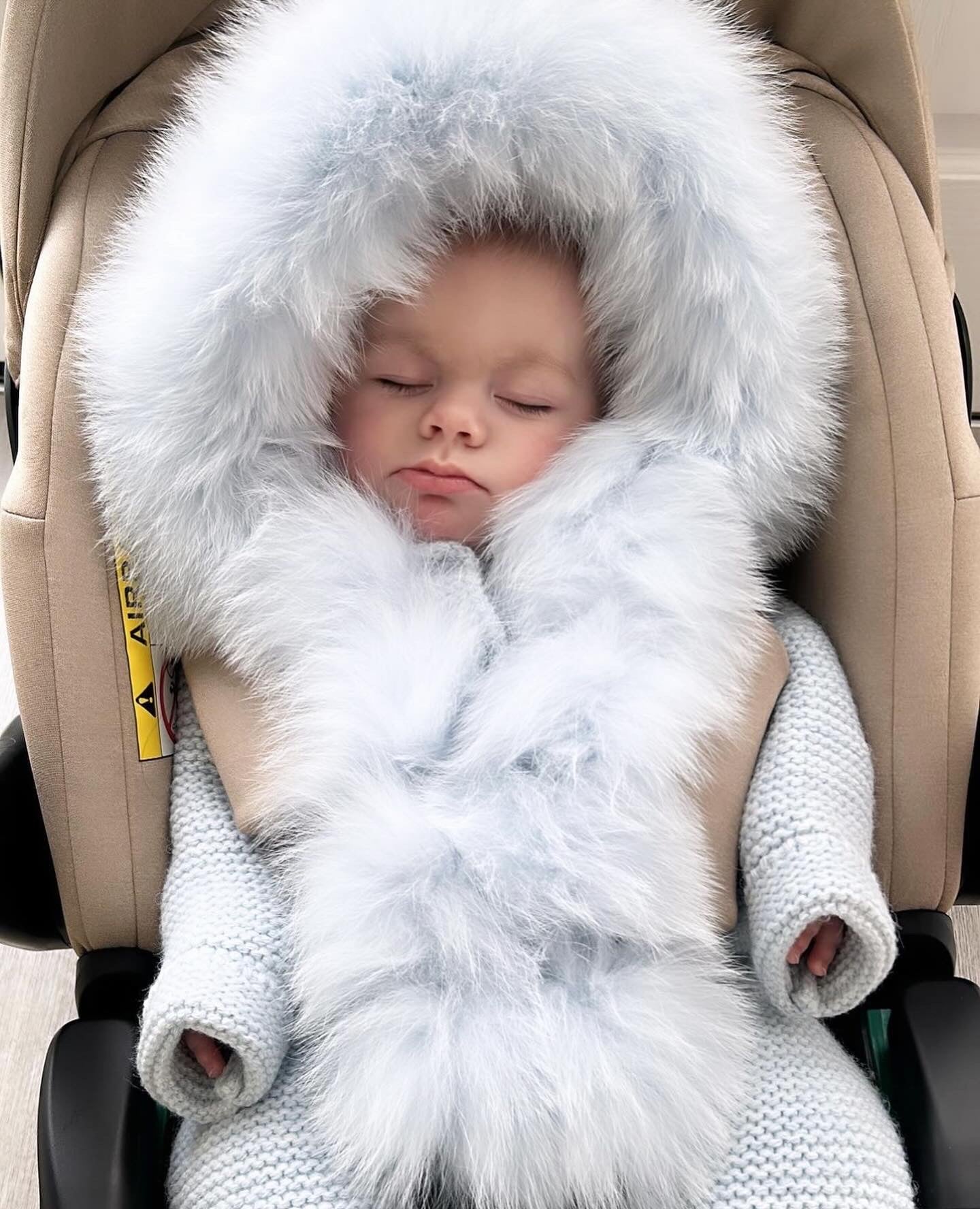 MI LOVES SIGNATURE Pale Blue Knitted Pramsuit with Luxurious Fox fur trim