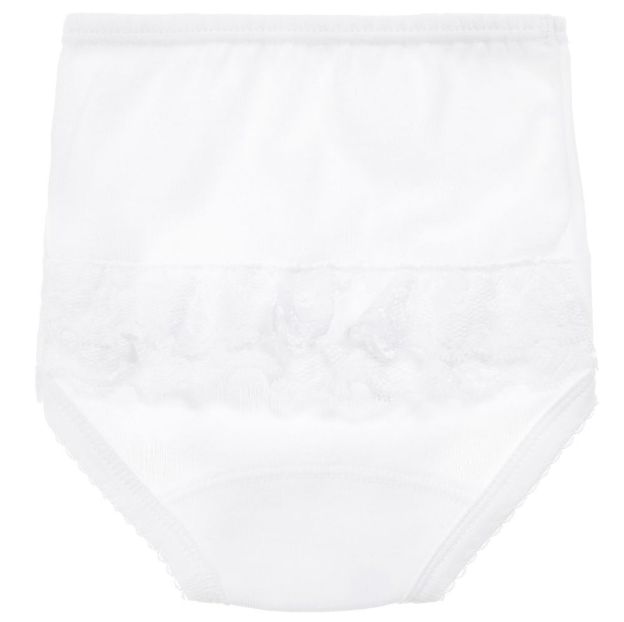 girls white frilly knickers from Babidu. Made in super soft cotton jersey, they have an elasticated high-waist and a sweet lace frill on the back.