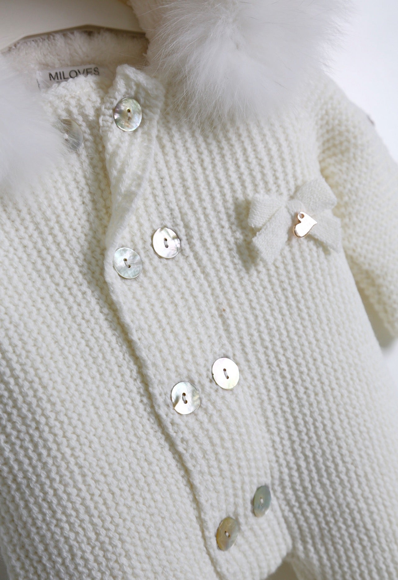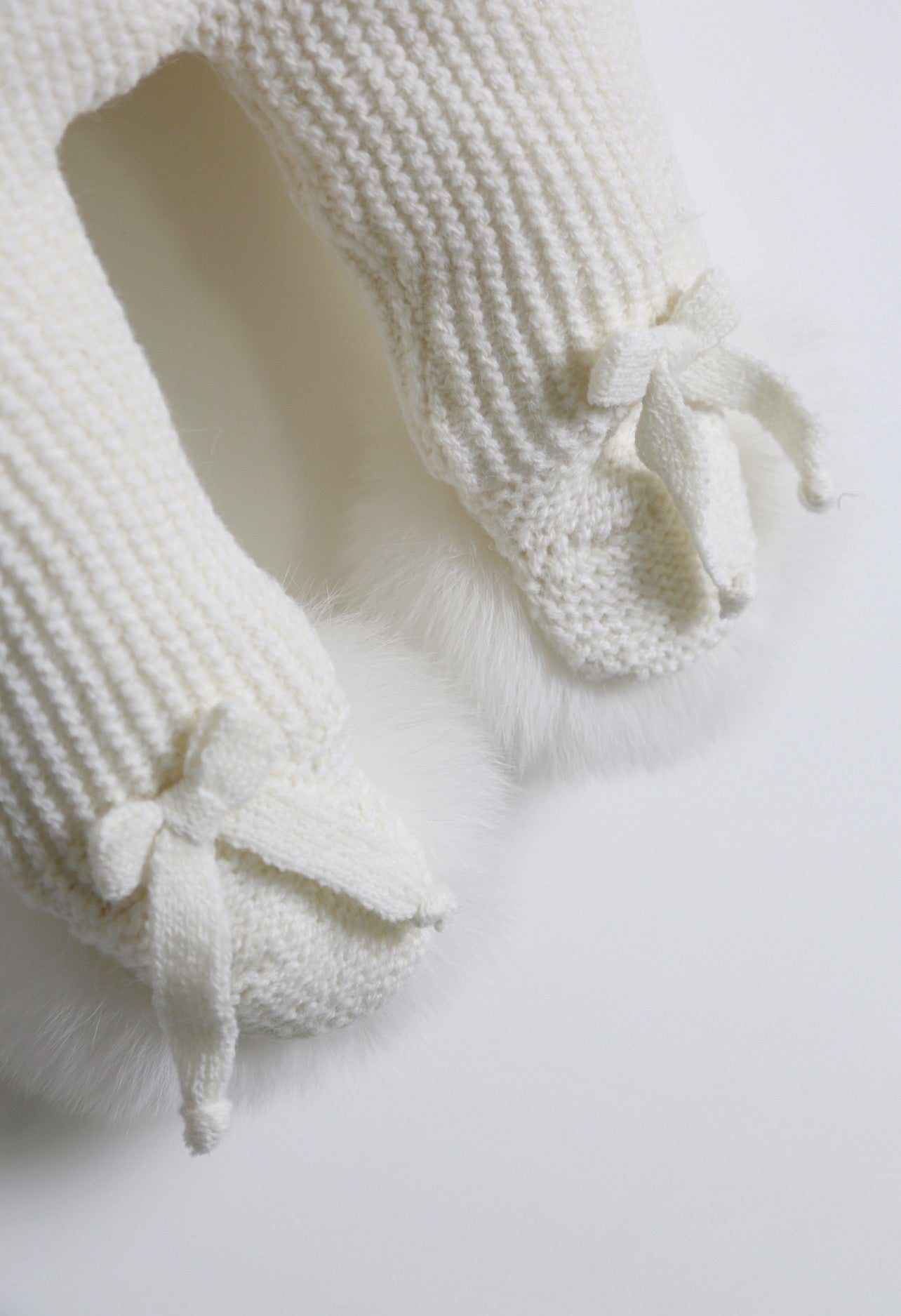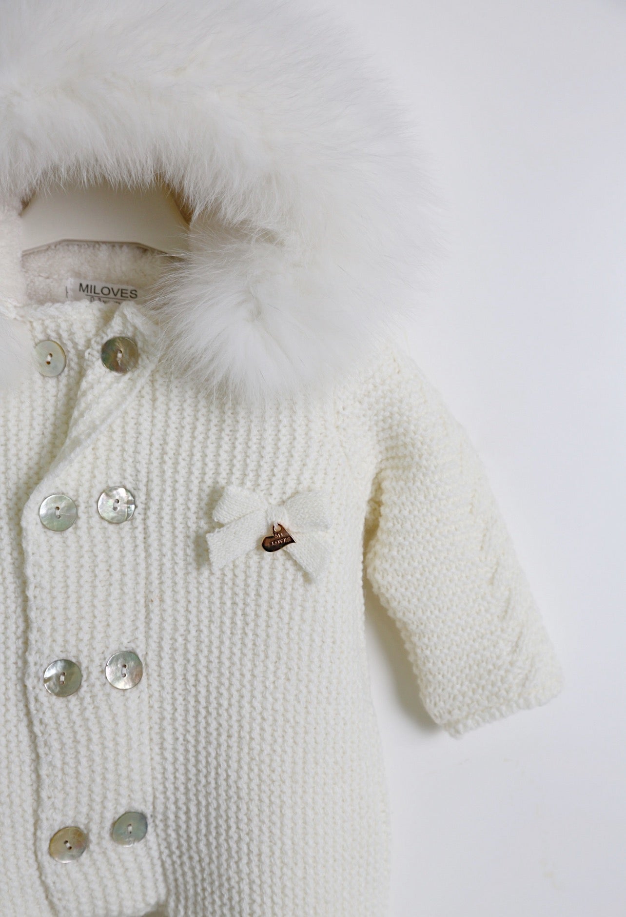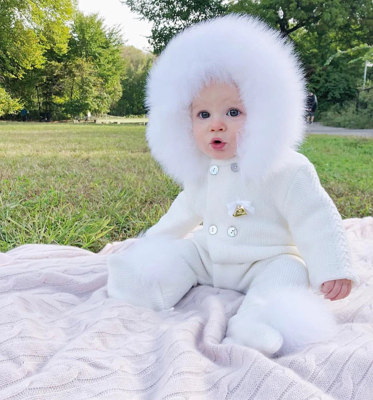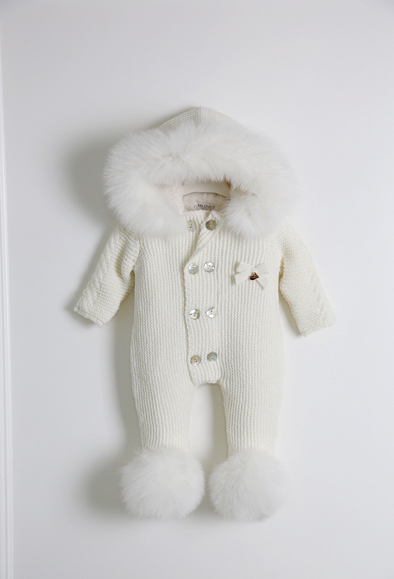 WHITE/IVORY MI LOVES SIGNATURE Fox fur trim/pompoms Baby ANGEL pramsuit.Beatiful and Luxurious Baby pramsuit featuring detachable Fox fur trim on the hood and detachable Fox fur pompoms on the feet .Mother of pearls buttons.Soft Plush Cotton lining.Beautiful Angel wings details on the back.
