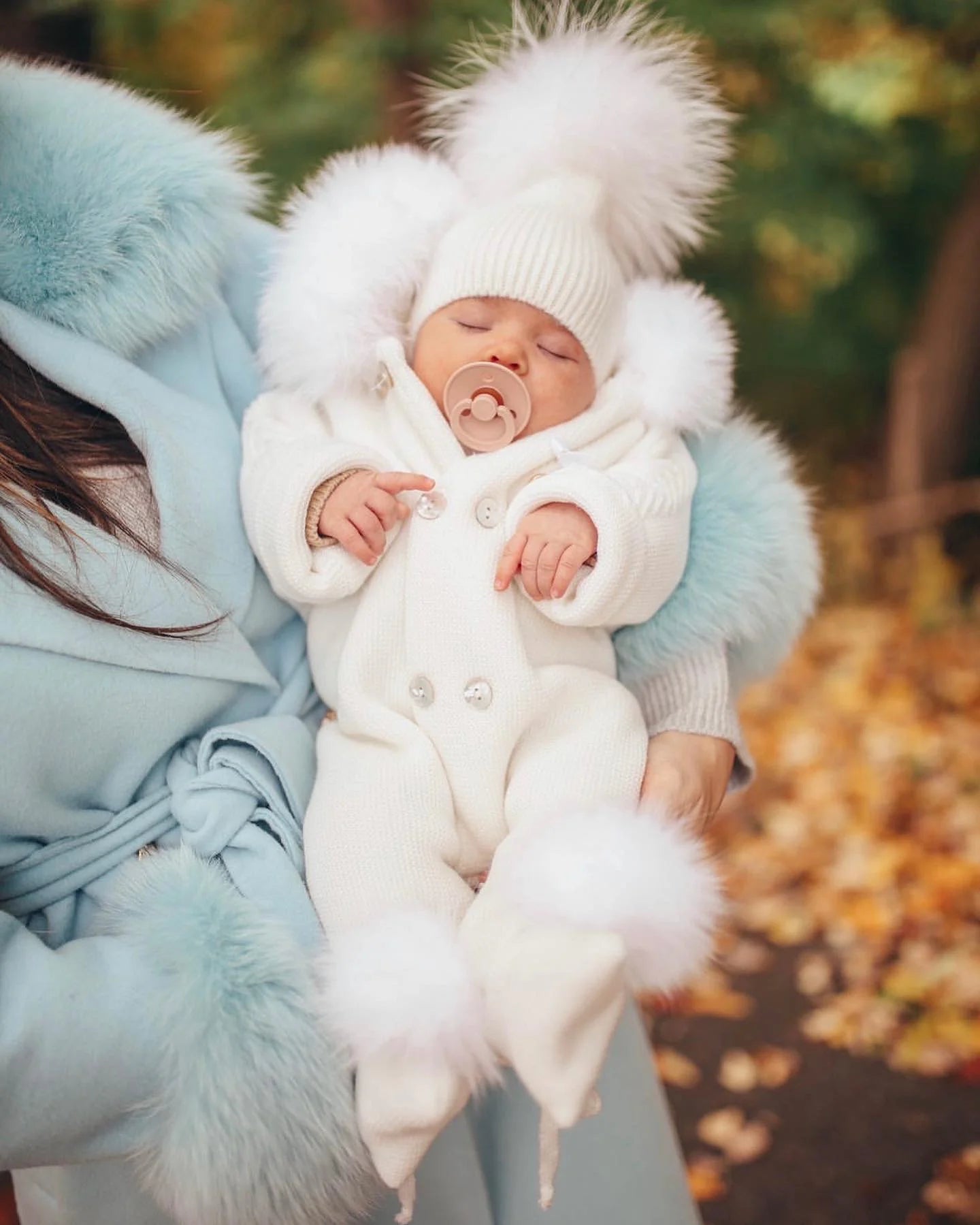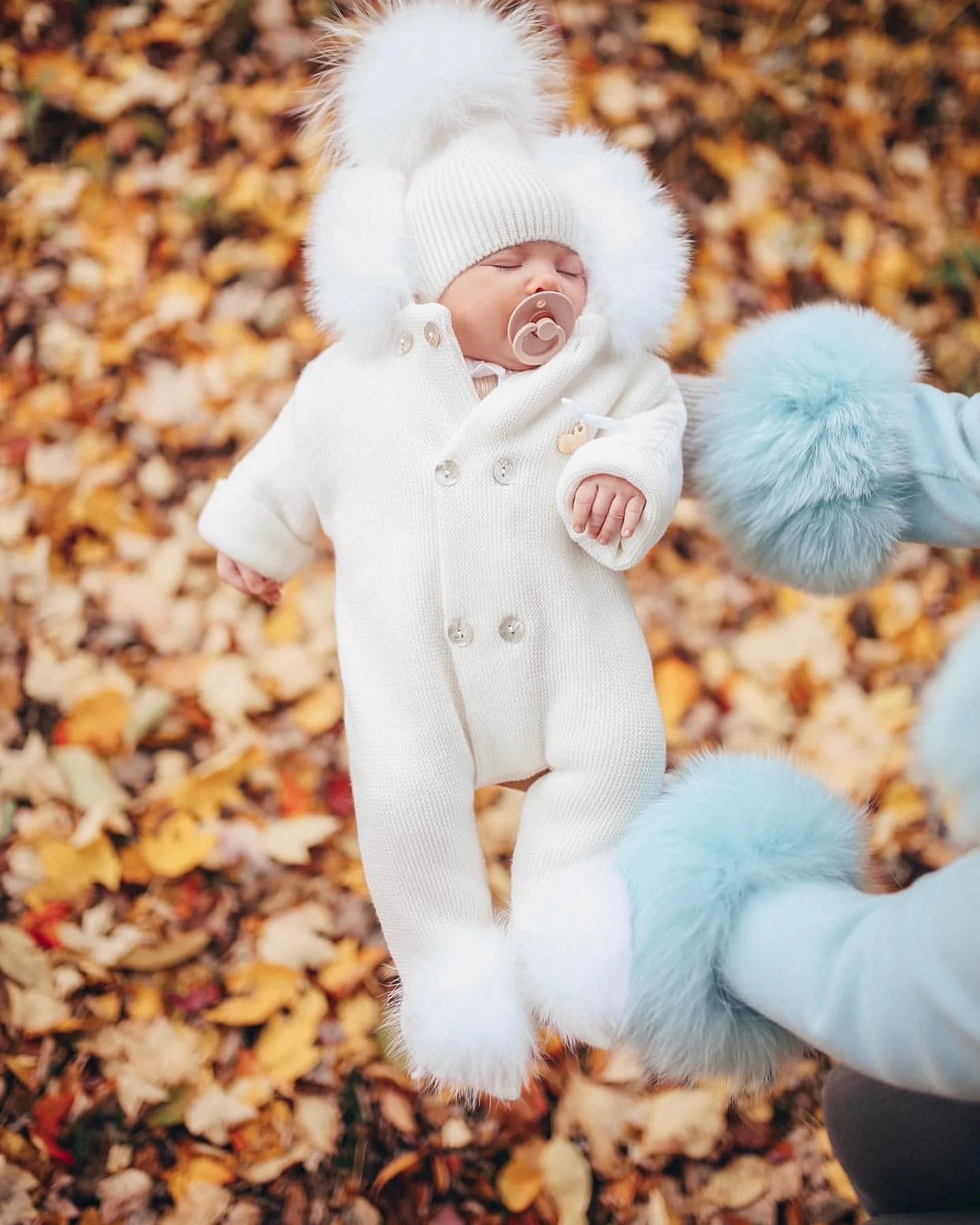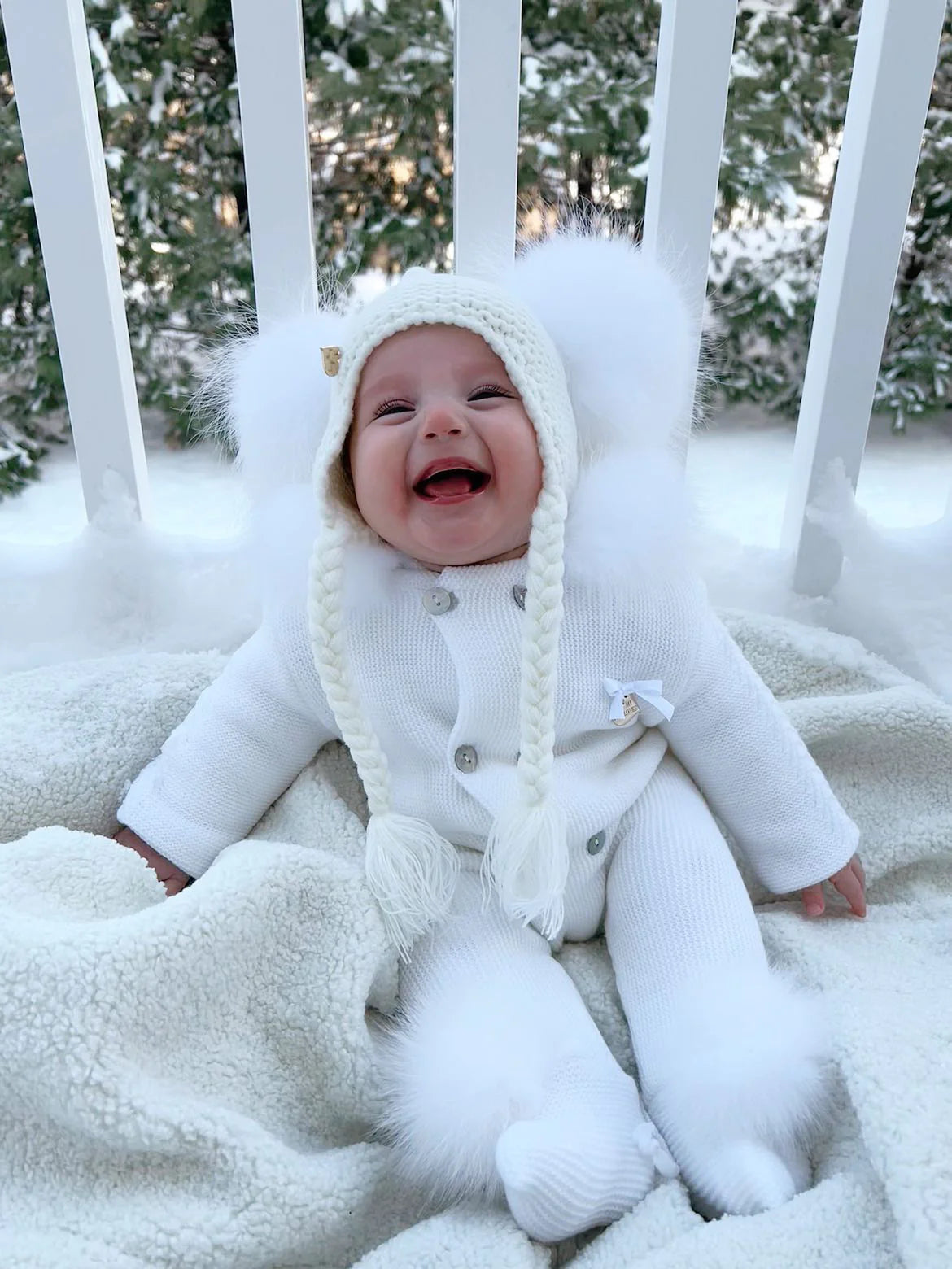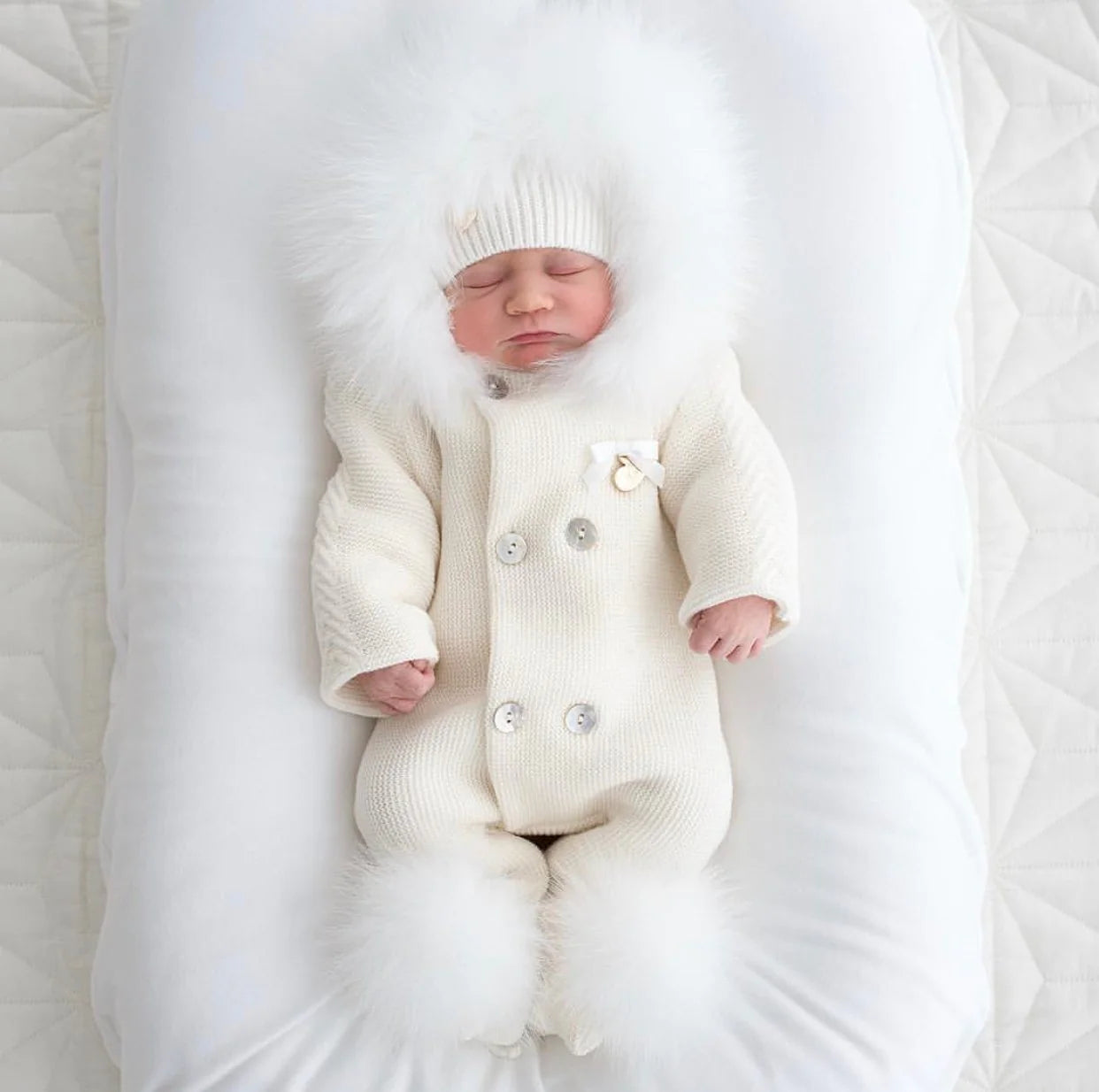 WHITE/IVORY MI LOVES SIGNATURE Fox fur trim/pompoms Baby ANGEL pramsuit.Beatiful and Luxurious Baby pramsuit featuring detachable Fox fur trim on the hood and detachable Fox fur pompoms on the feet .Mother of pearls buttons.Soft Plush Cotton lining.Beautiful Angel wings details on the back.