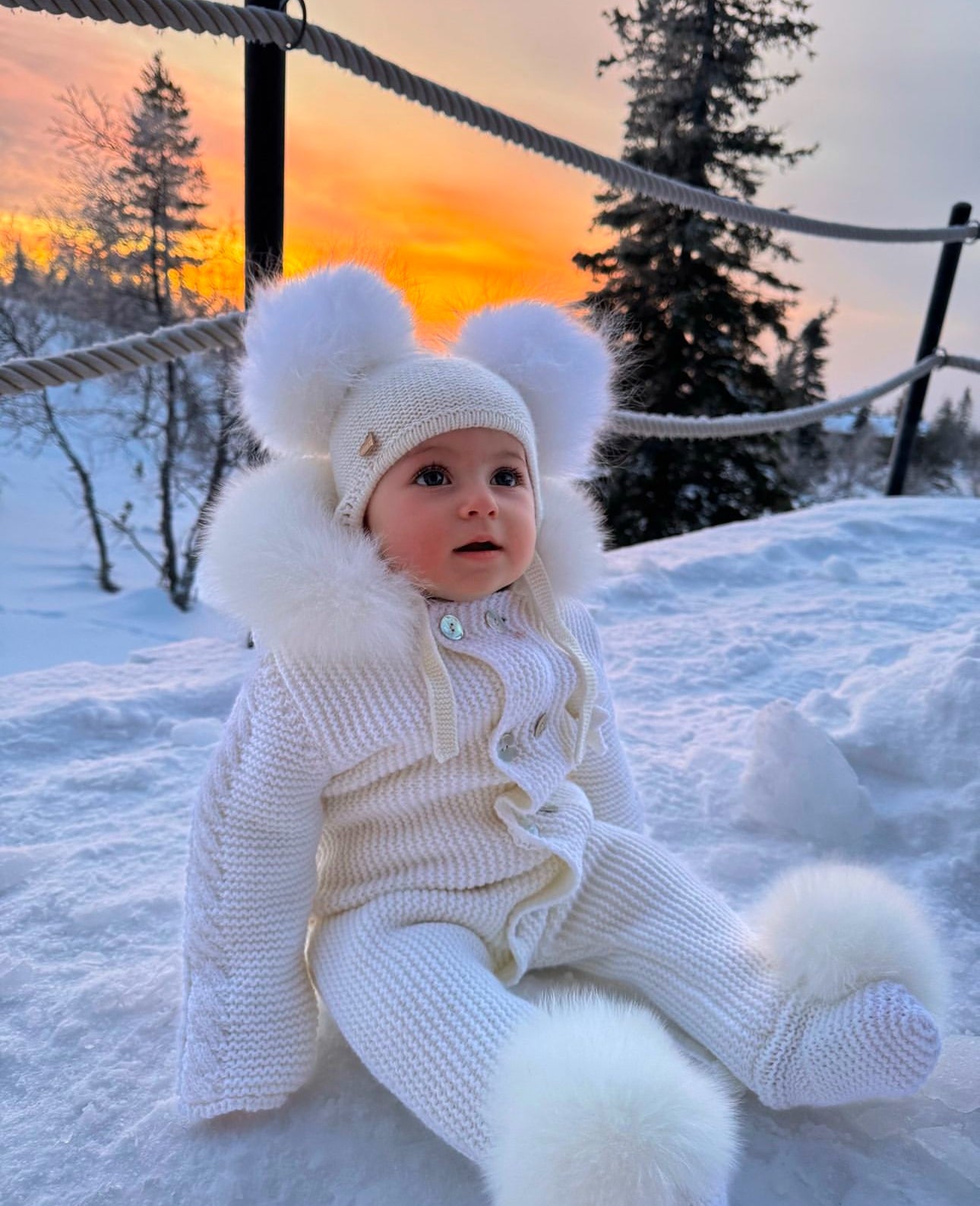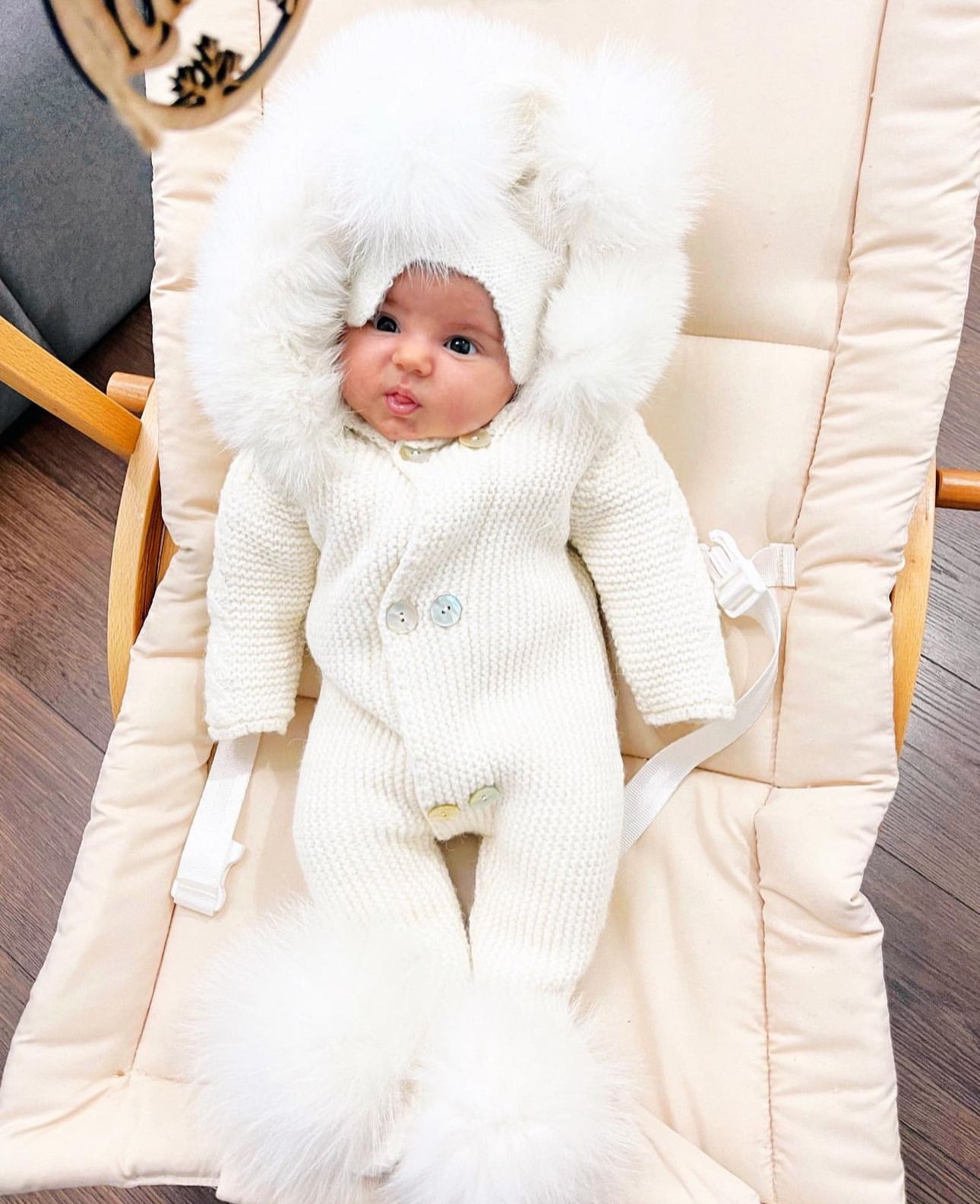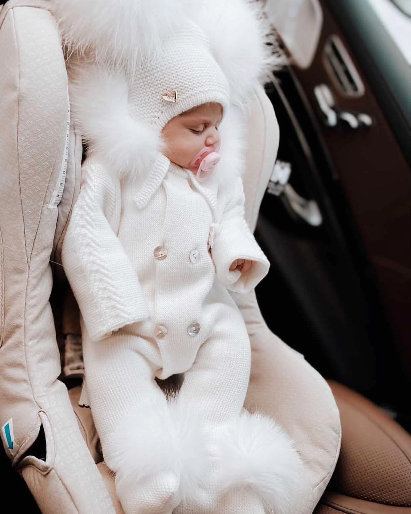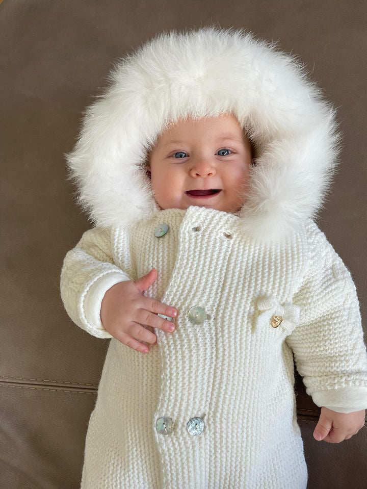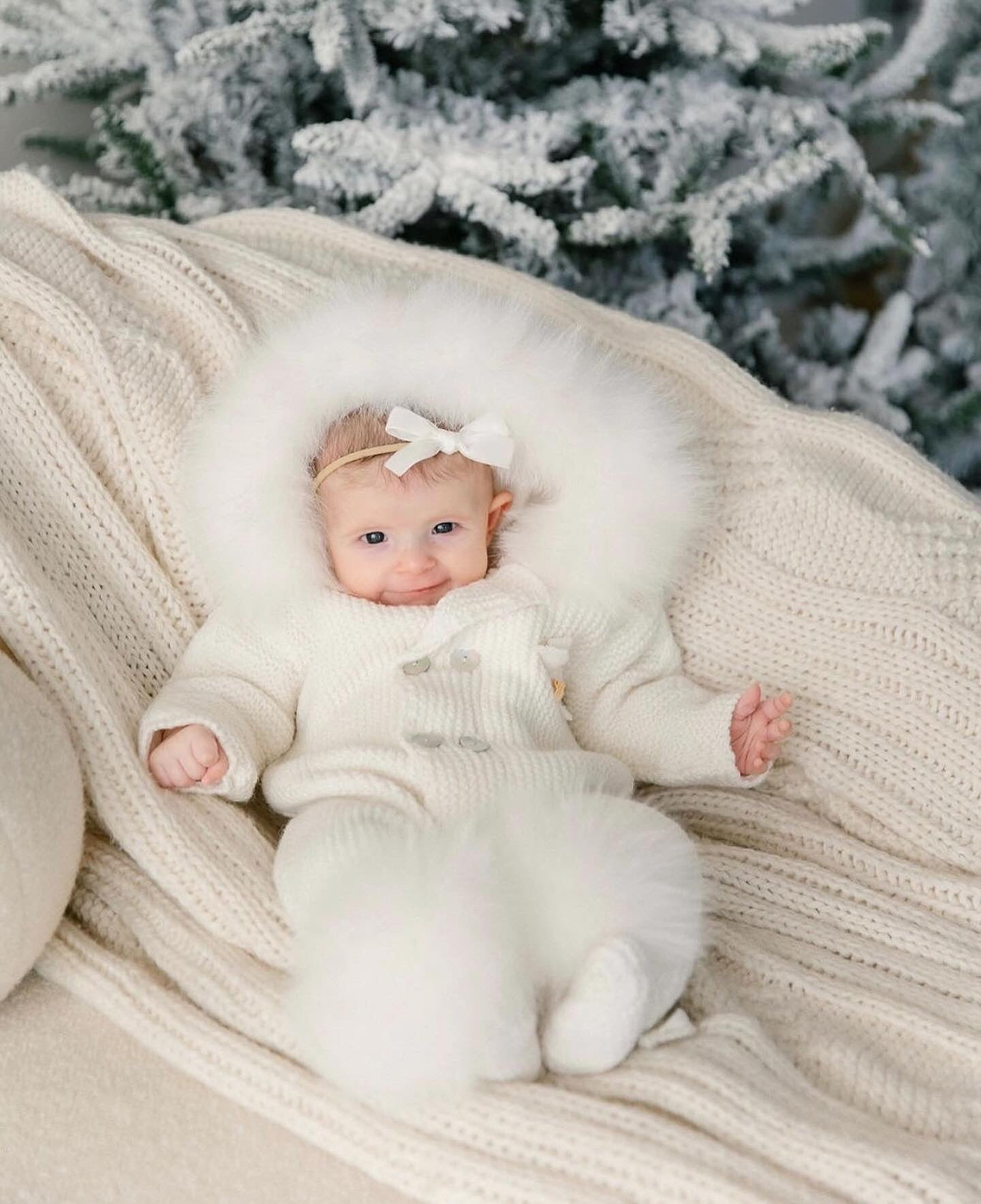 WHITE/IVORY MI LOVES SIGNATURE Fox fur trim/pompoms Baby ANGEL pramsuit.Beatiful and Luxurious Baby pramsuit featuring detachable Fox fur trim on the hood and detachable Fox fur pompoms on the feet .Mother of pearls buttons.Soft Plush Cotton lining.Beautiful Angel wings details on the back.