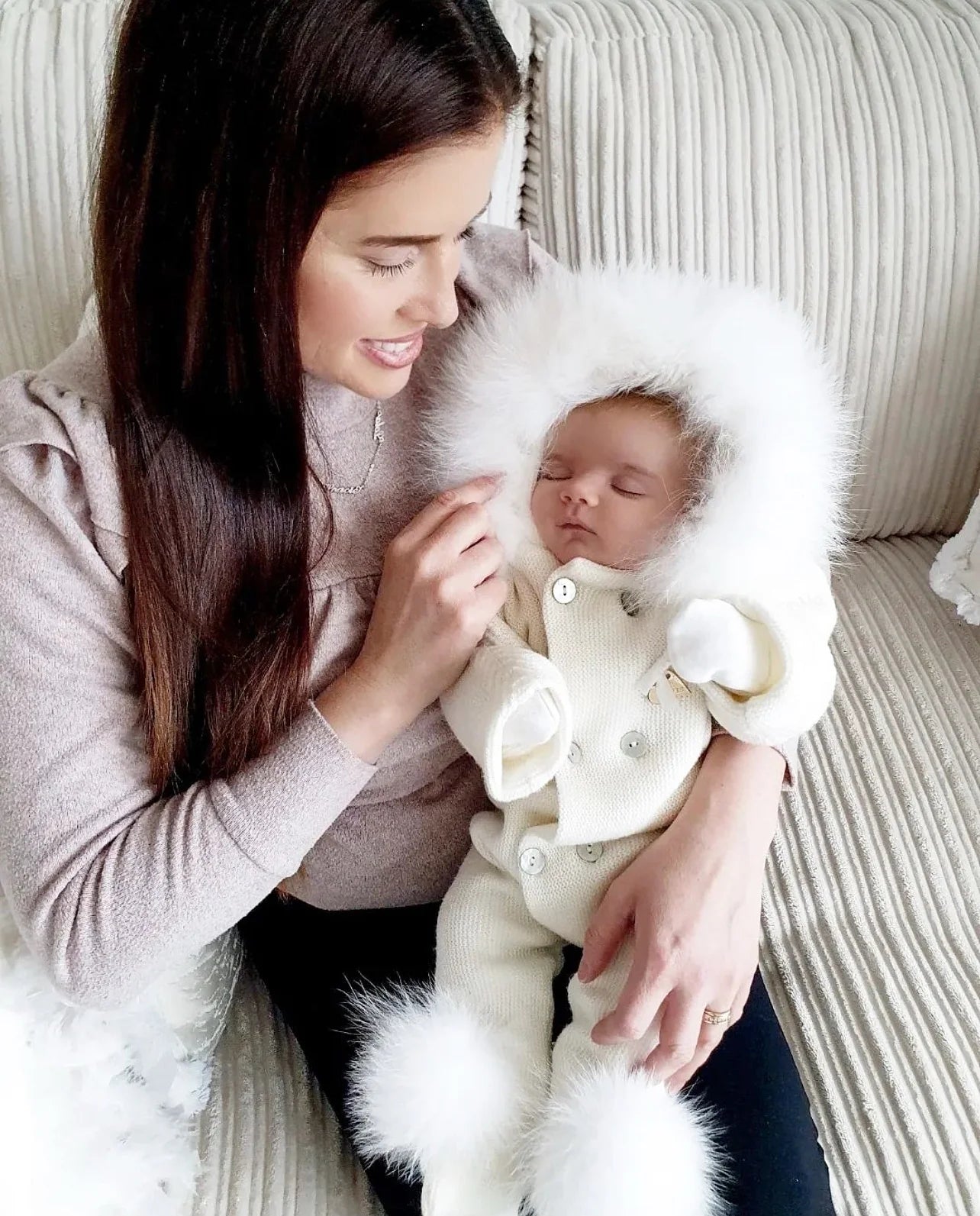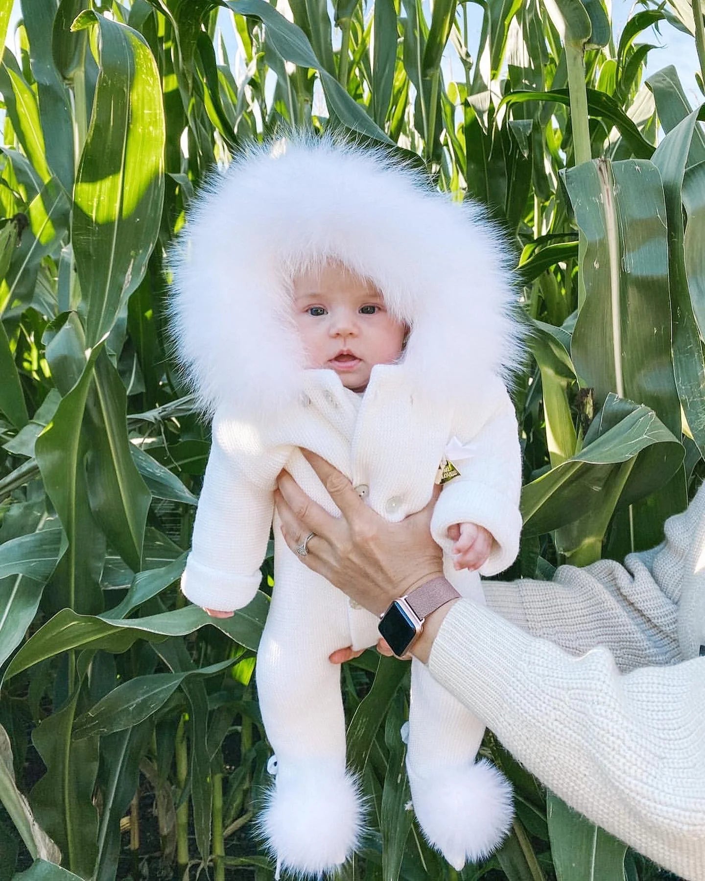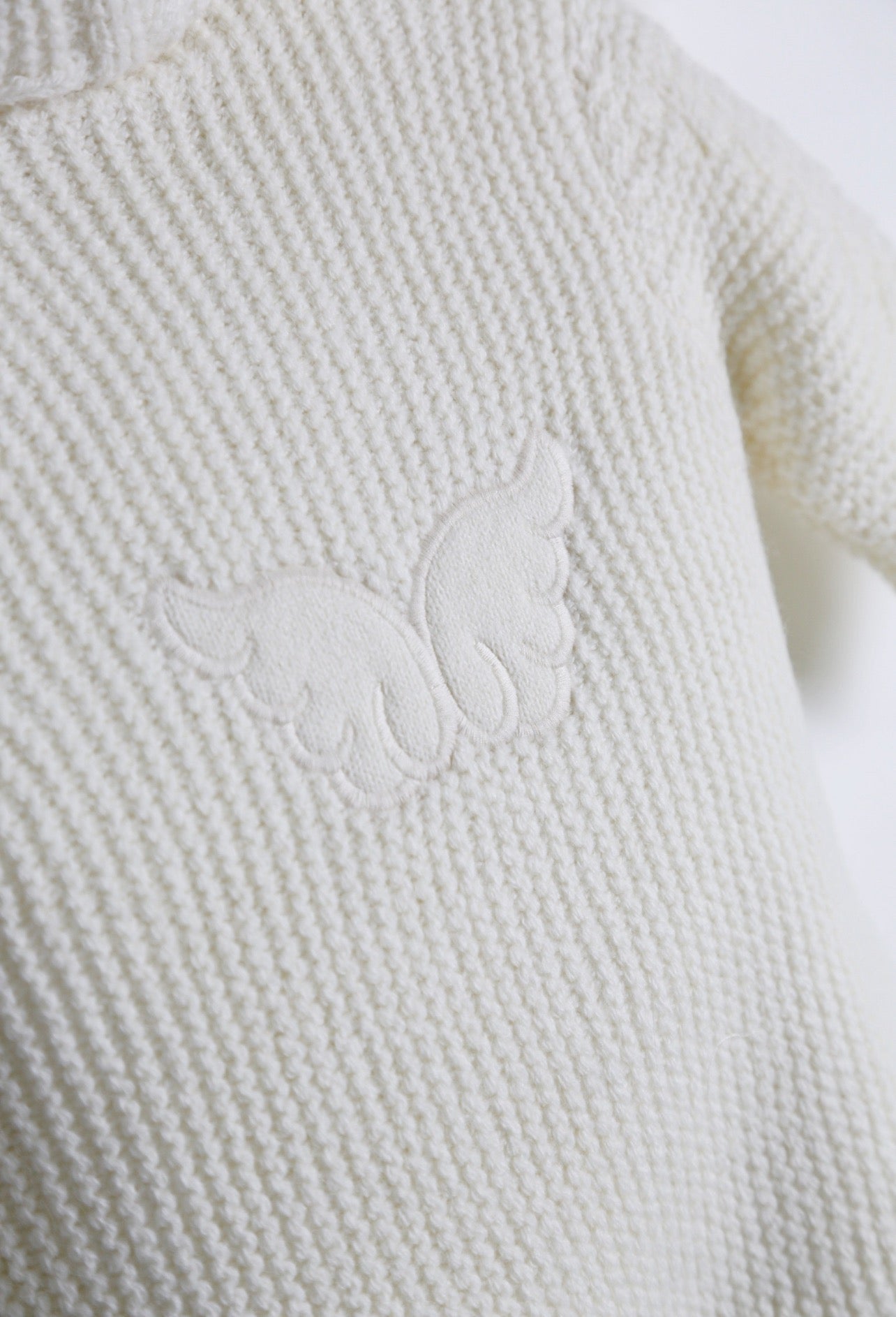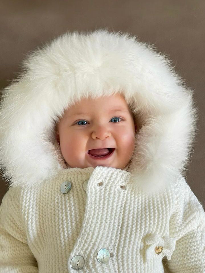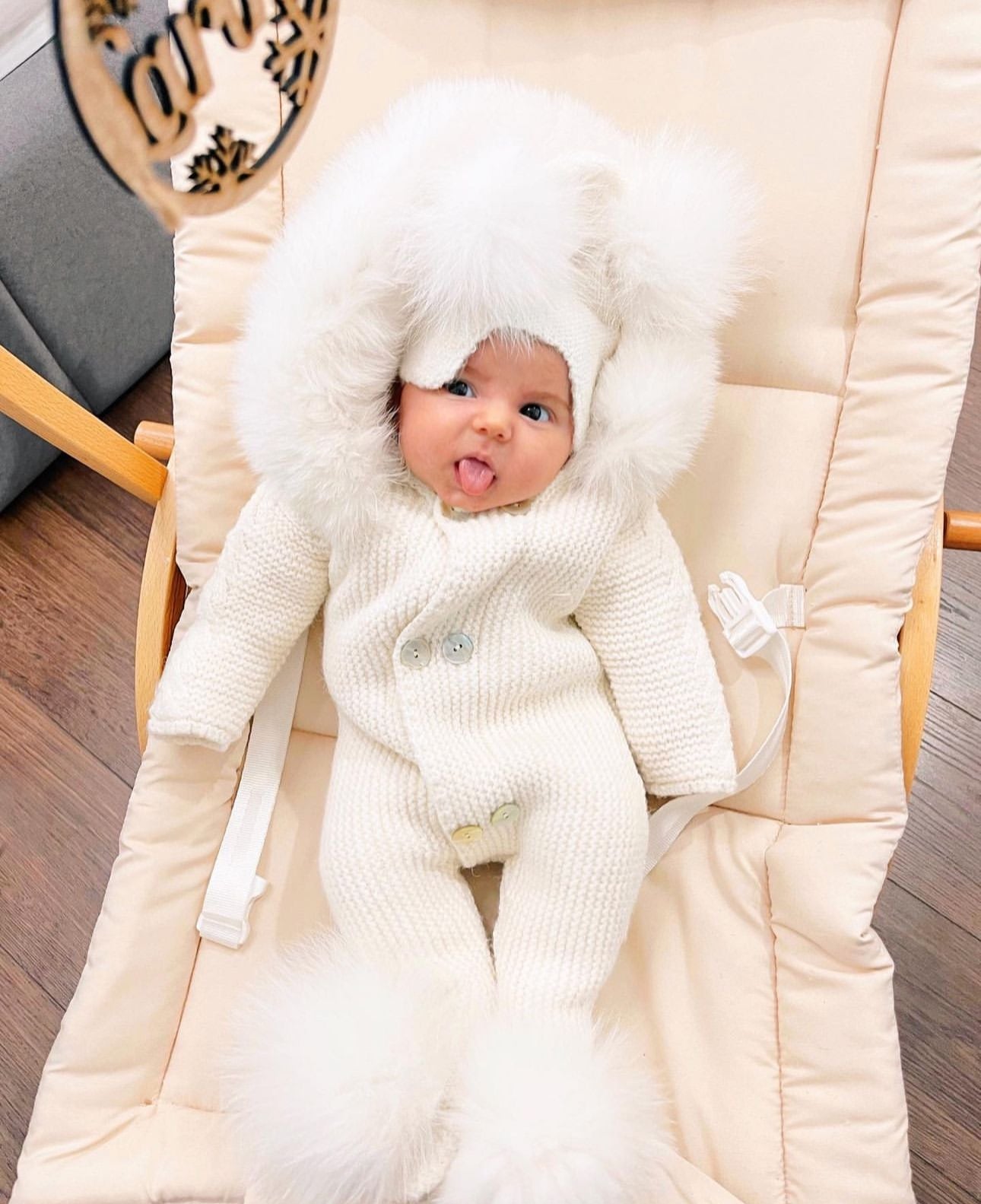 WHITE/IVORY MI LOVES SIGNATURE Fox fur trim/pompoms Baby ANGEL pramsuit.Beatiful and Luxurious Baby pramsuit featuring detachable Fox fur trim on the hood and detachable Fox fur pompoms on the feet .Mother of pearls buttons.Soft Plush Cotton lining.Beautiful Angel wings details on the back.