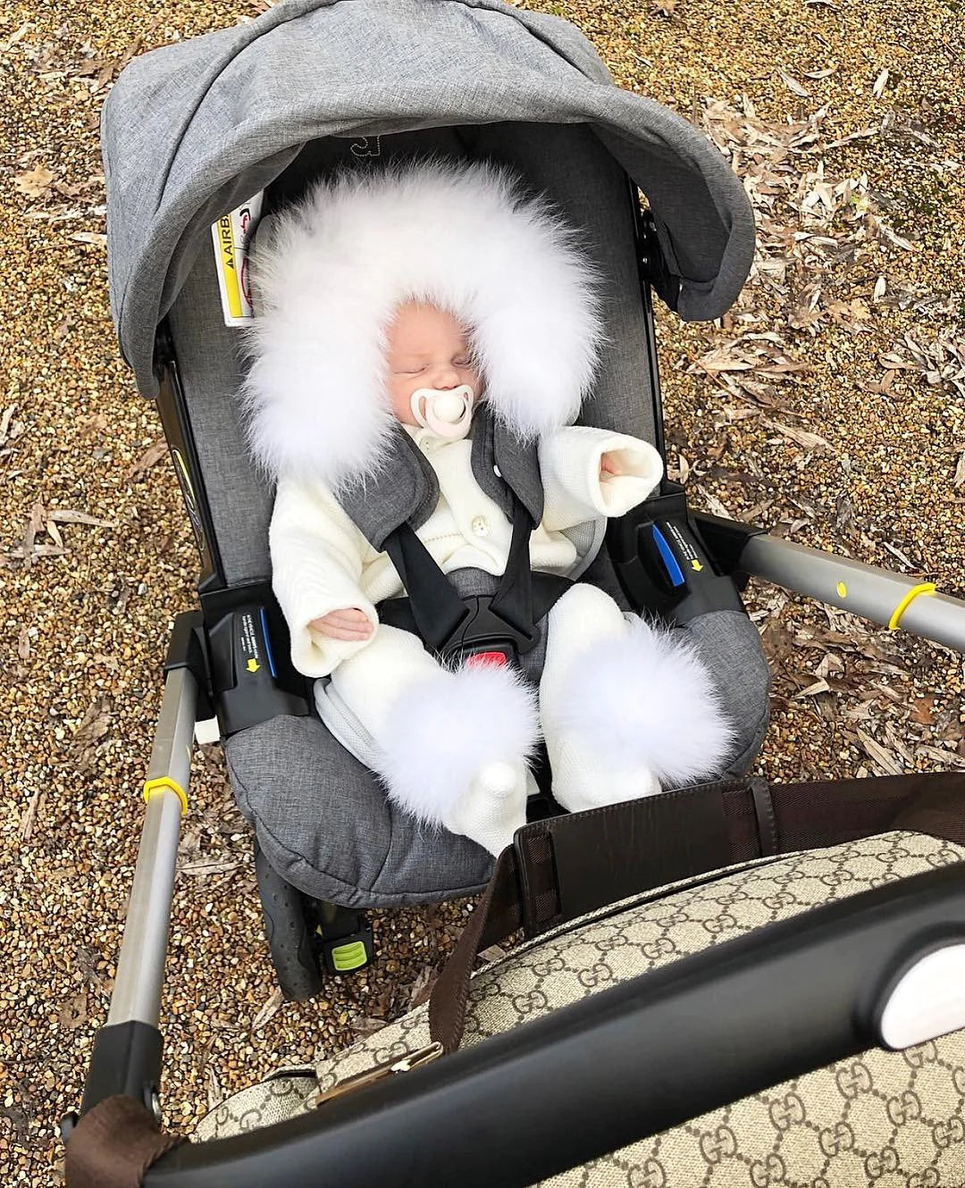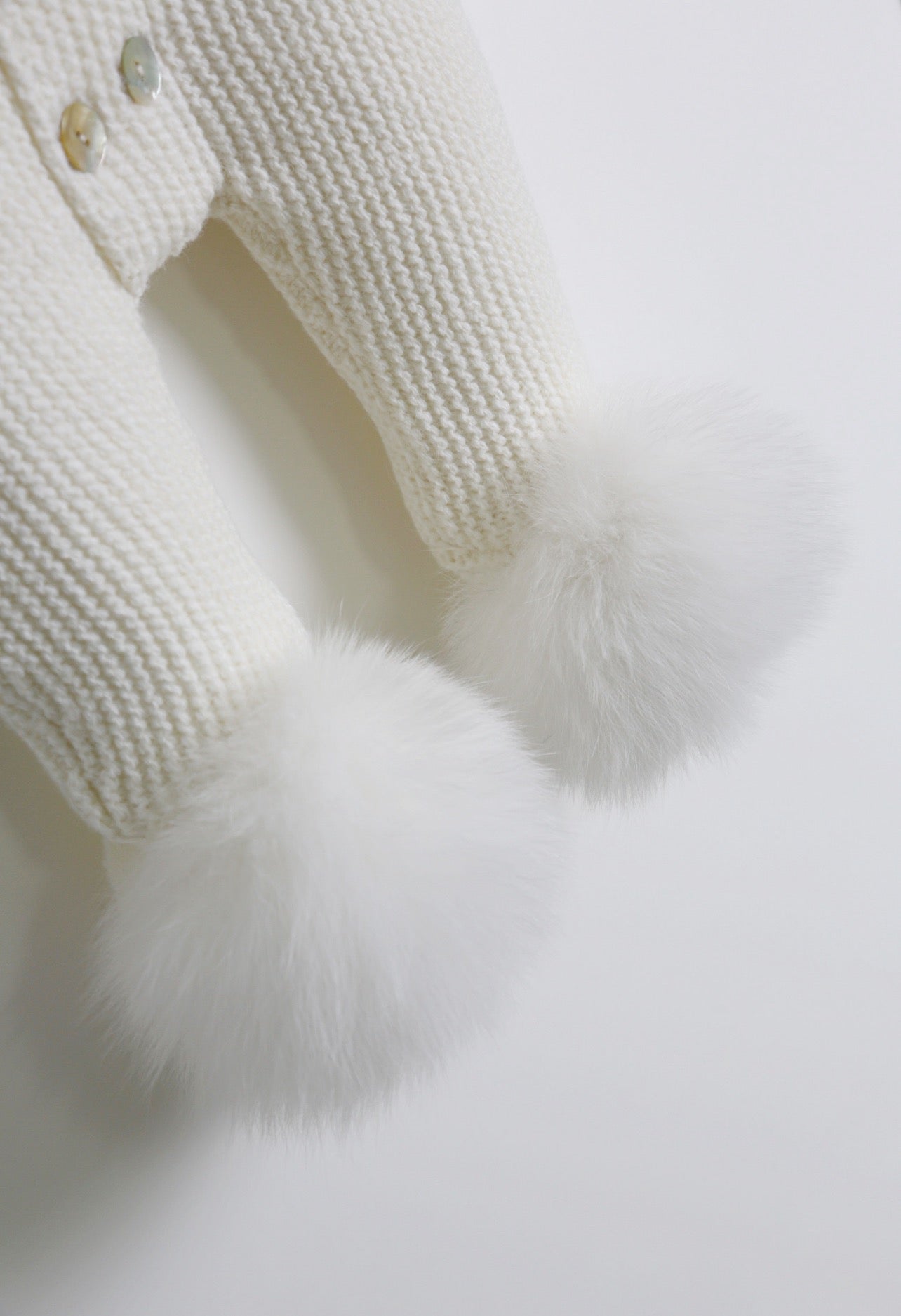 WHITE/IVORY MI LOVES SIGNATURE Fox fur trim/pompoms Baby ANGEL pramsuit. C