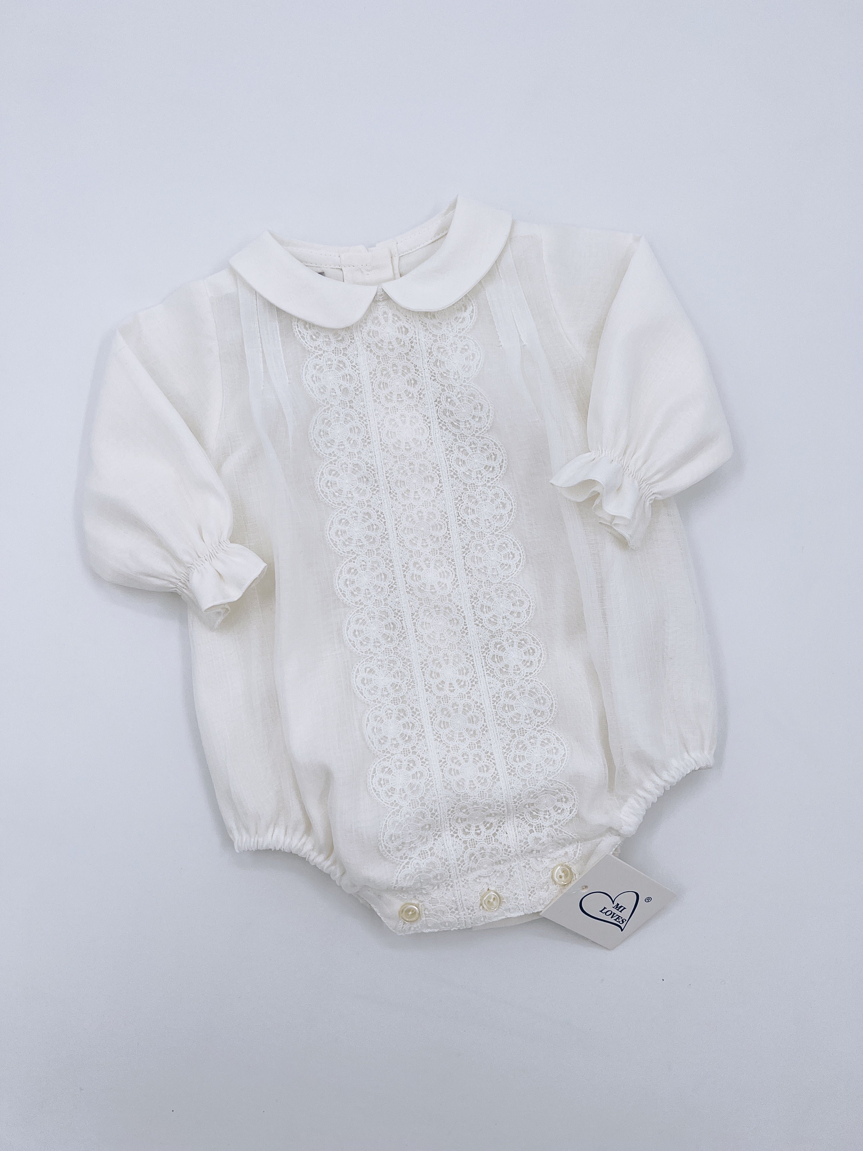 Beautiful Ivory Unisex Romper with lace details on the front.
