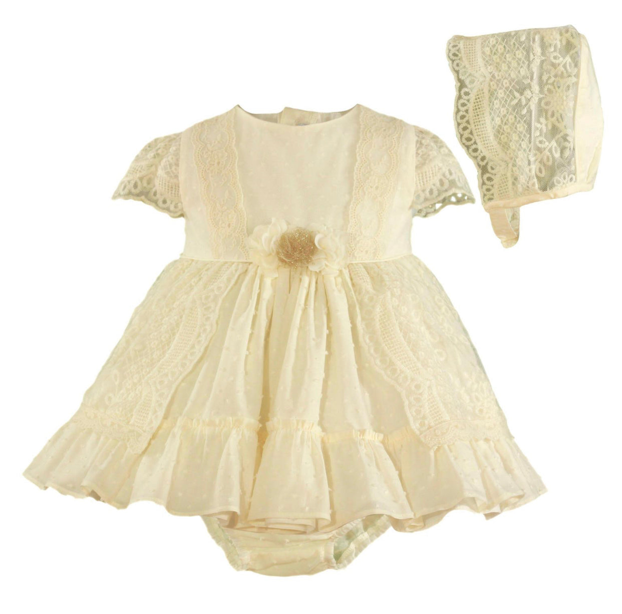 MI LOVES Beautiful Ivory Dress/Bonnet/Bloomers 3 piece set with Lace details.