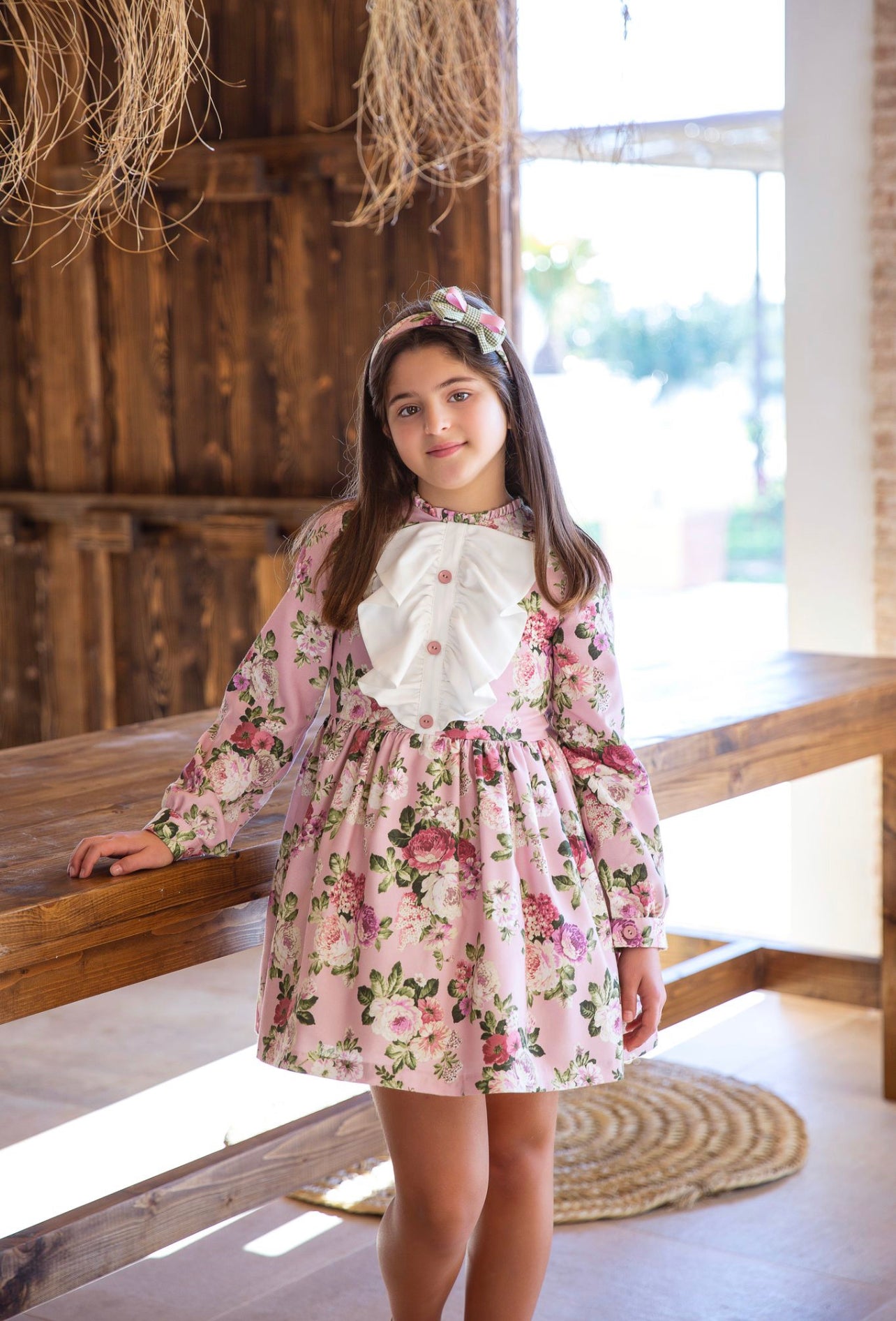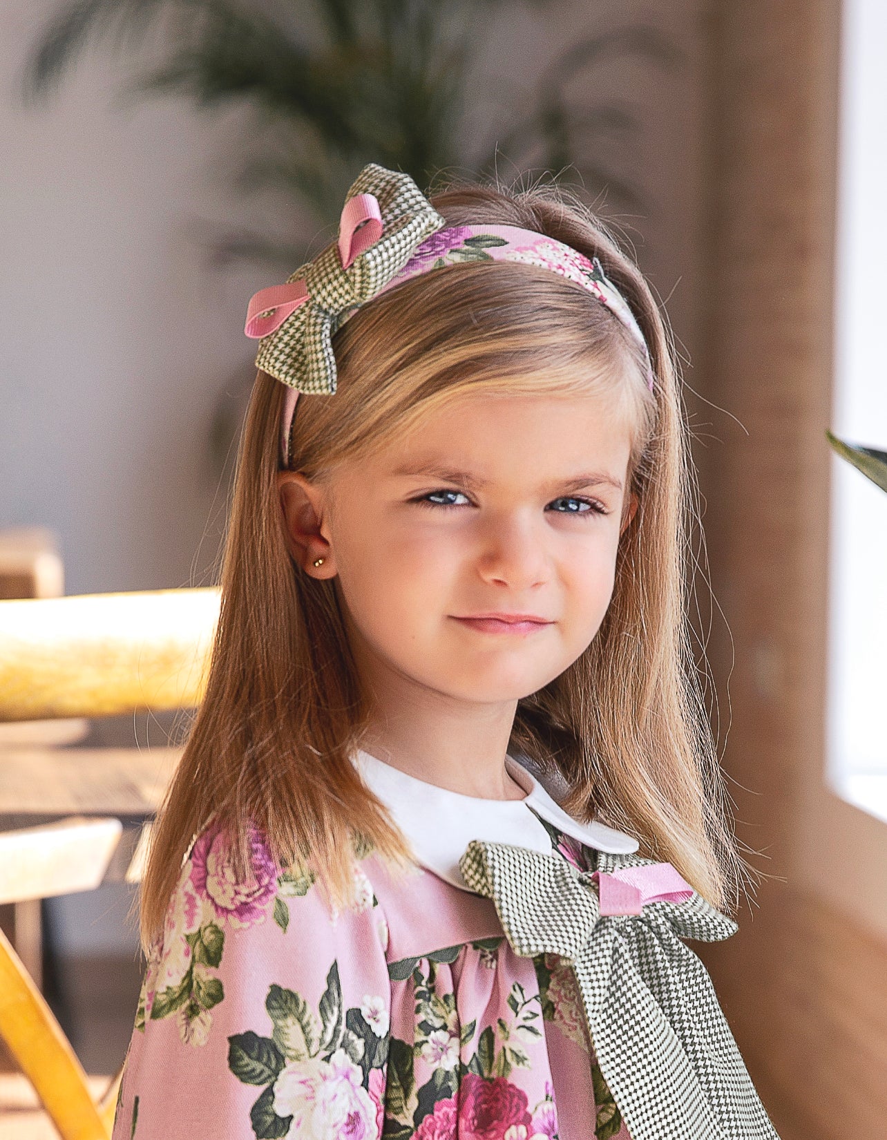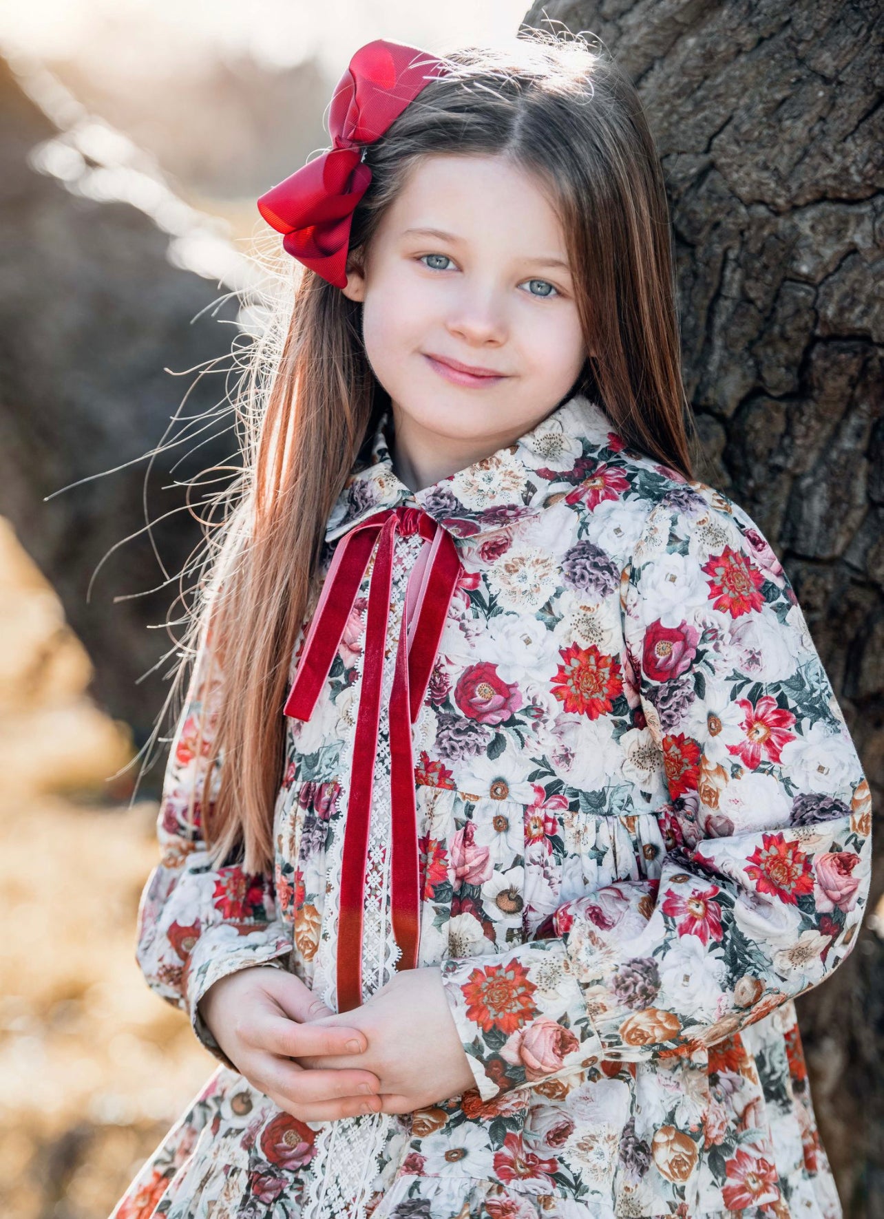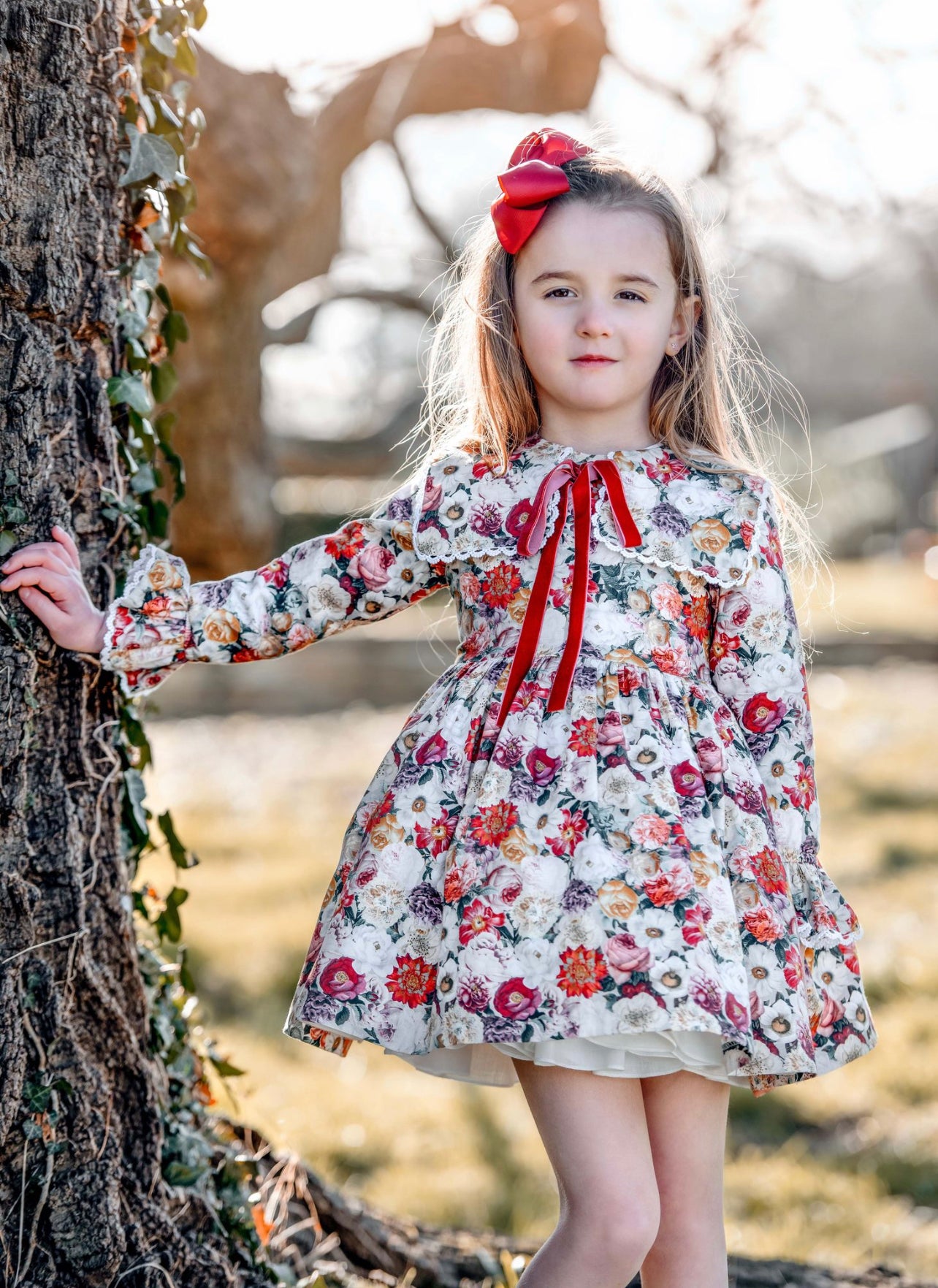 Beautiful Floral print Dress with Velvet burgundy bow details.