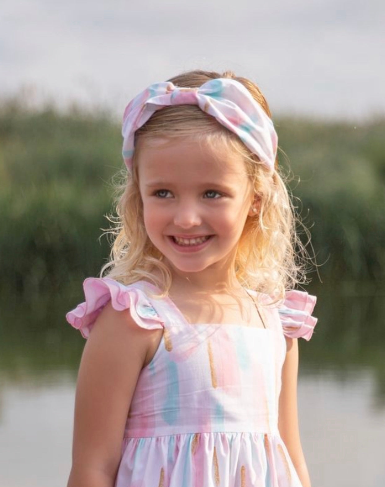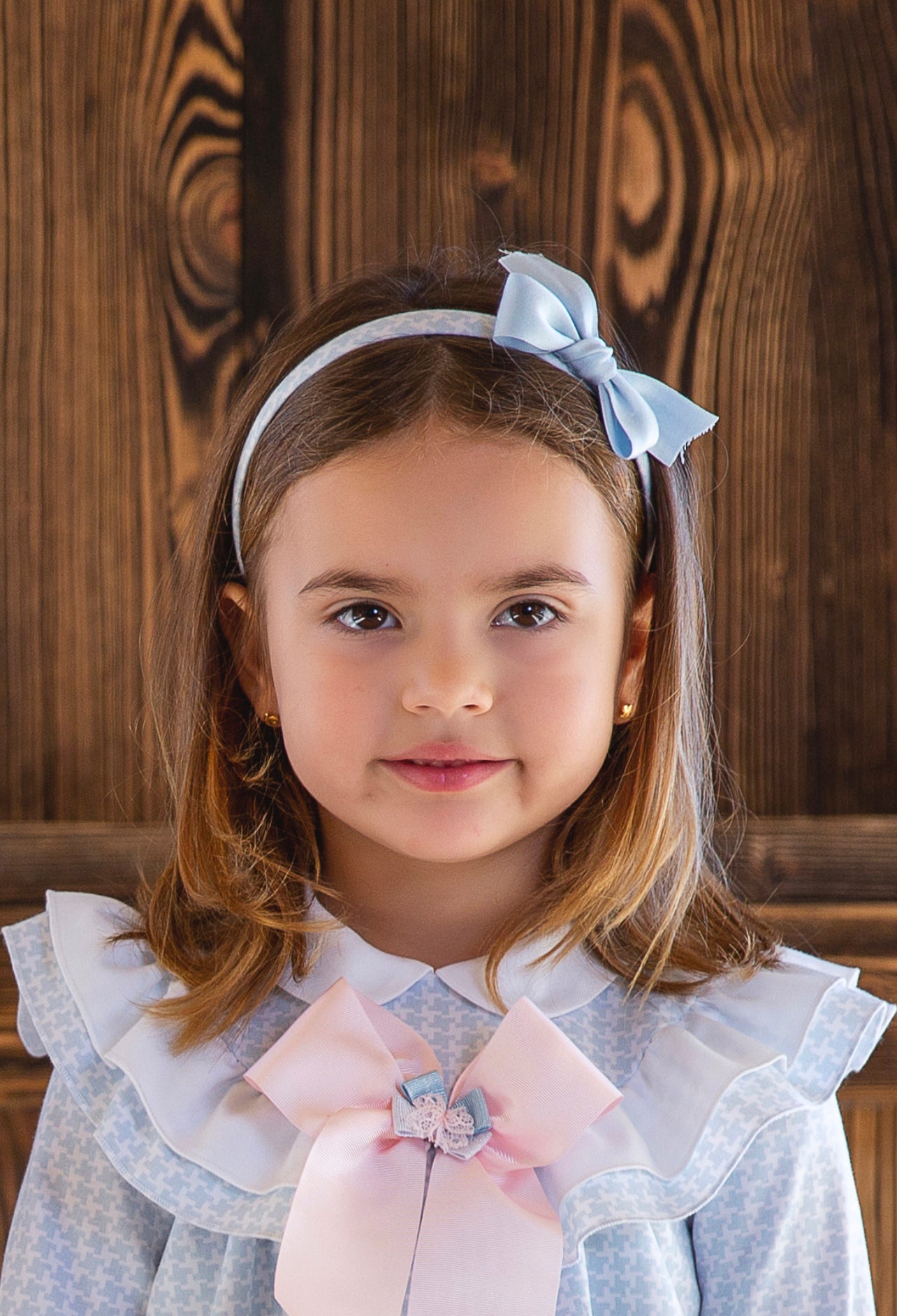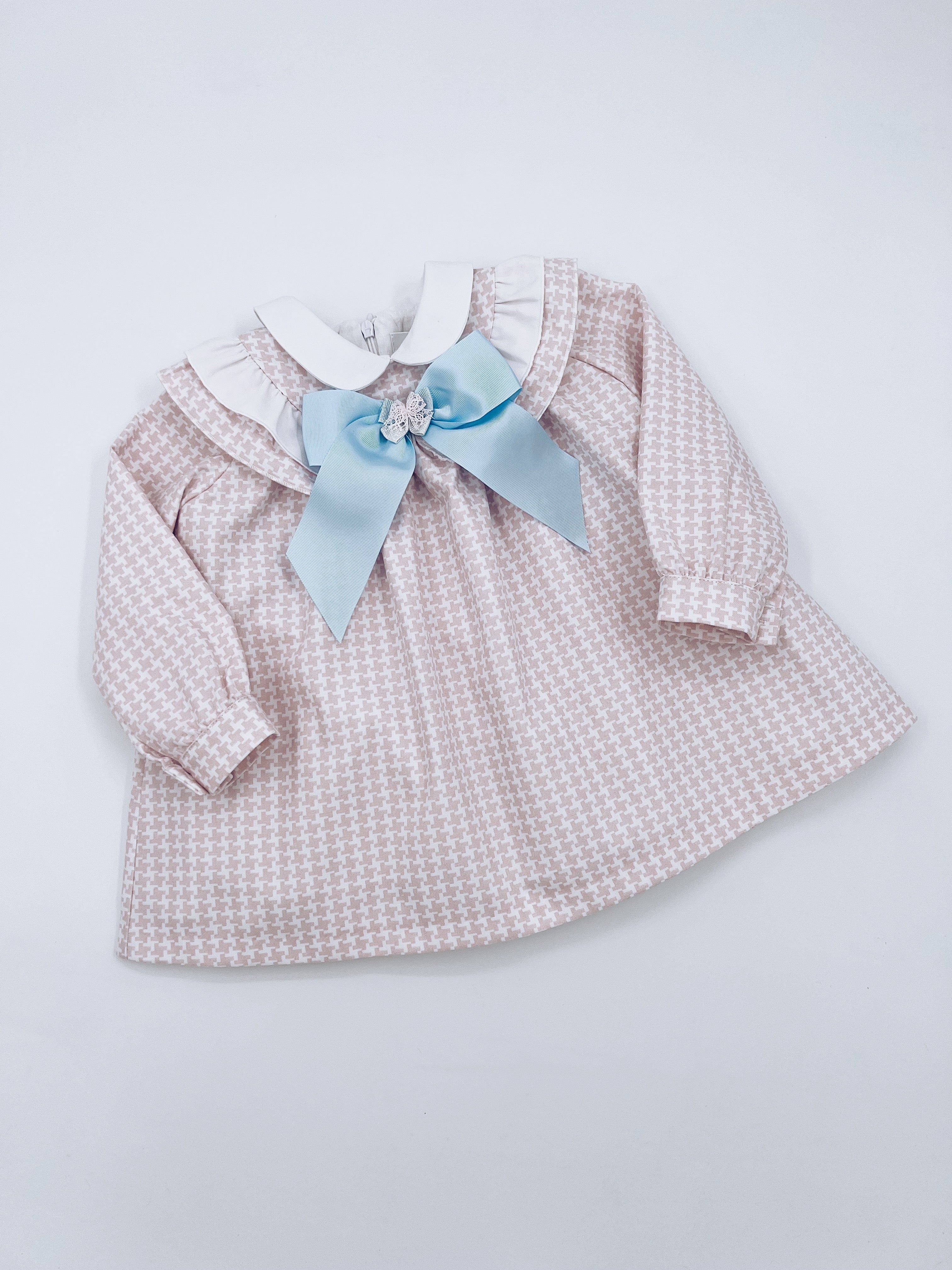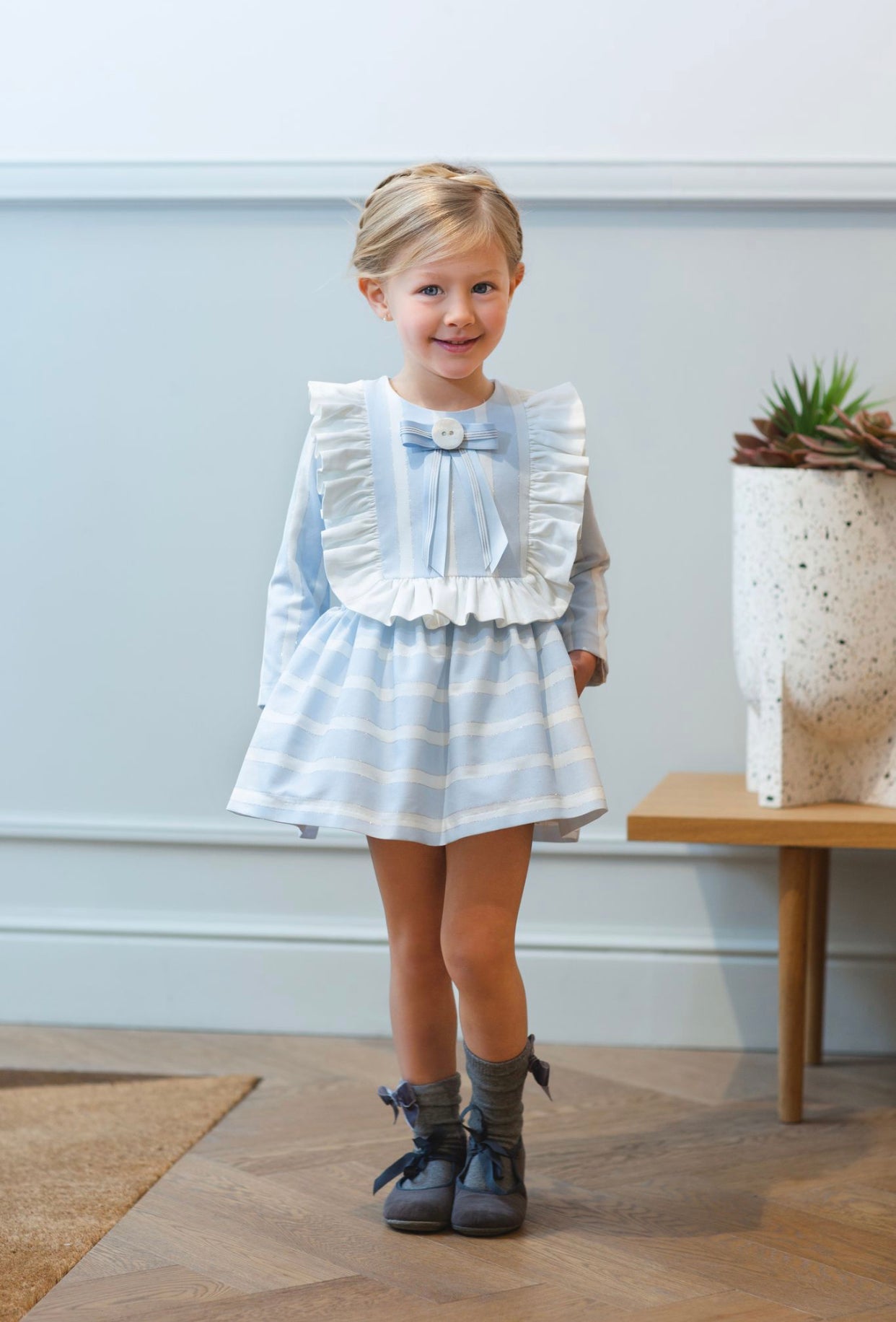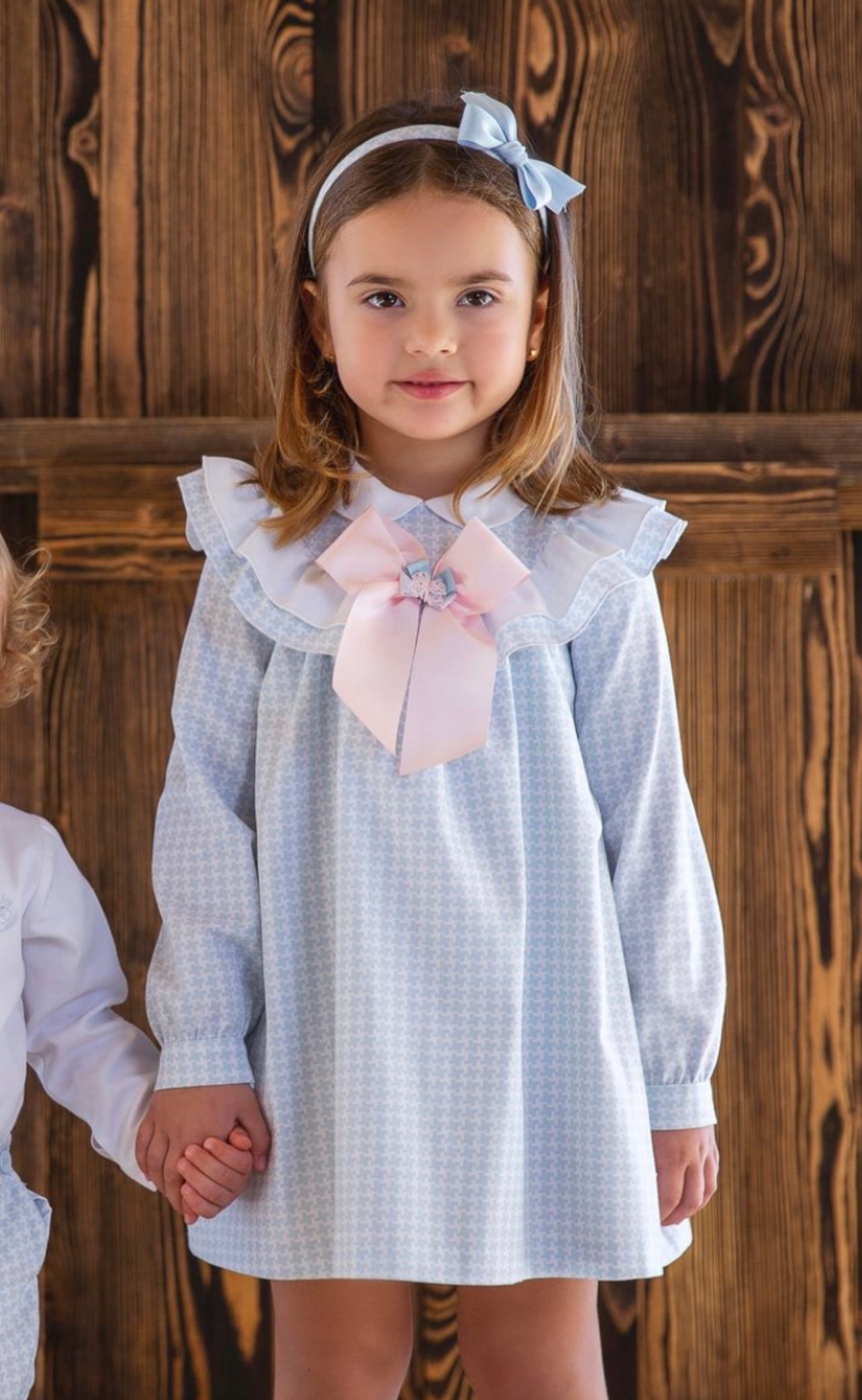 Beautiful Blue Dress with Frill and Pink Bow Details.