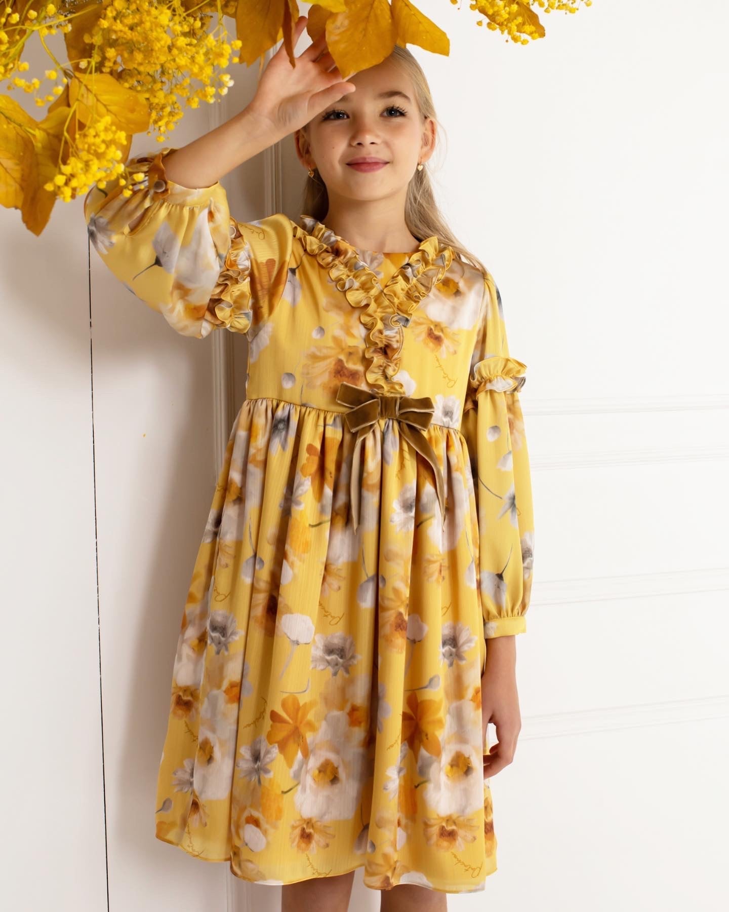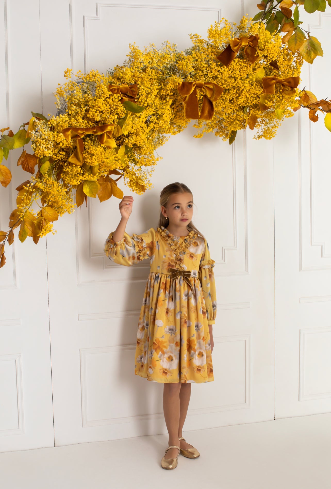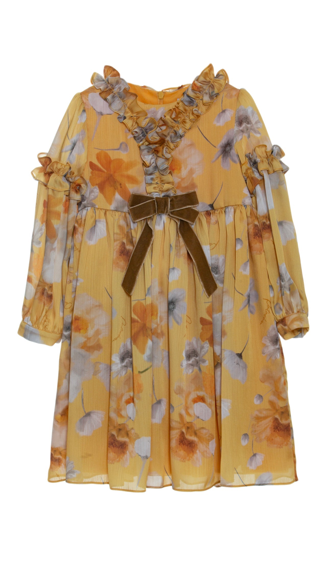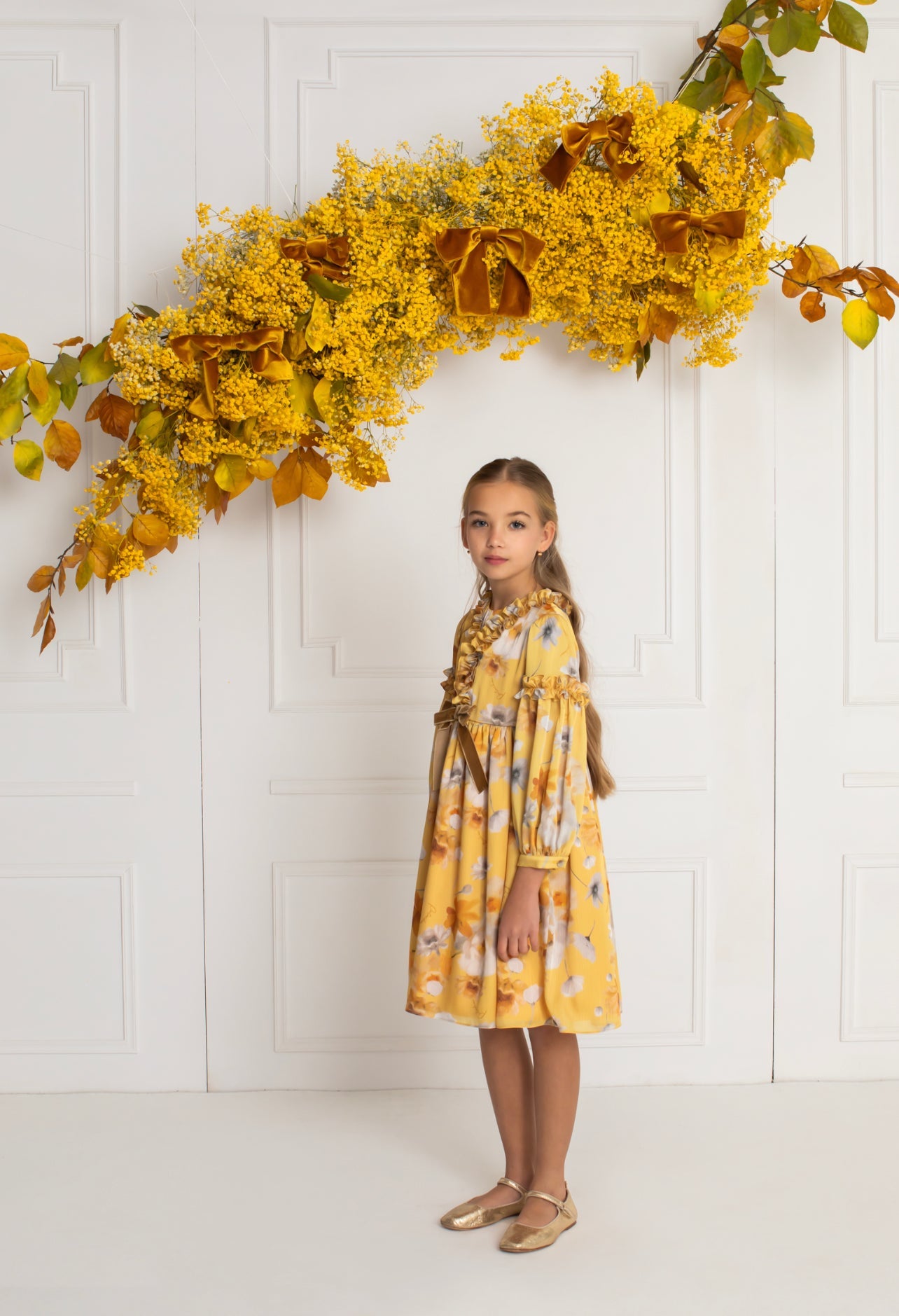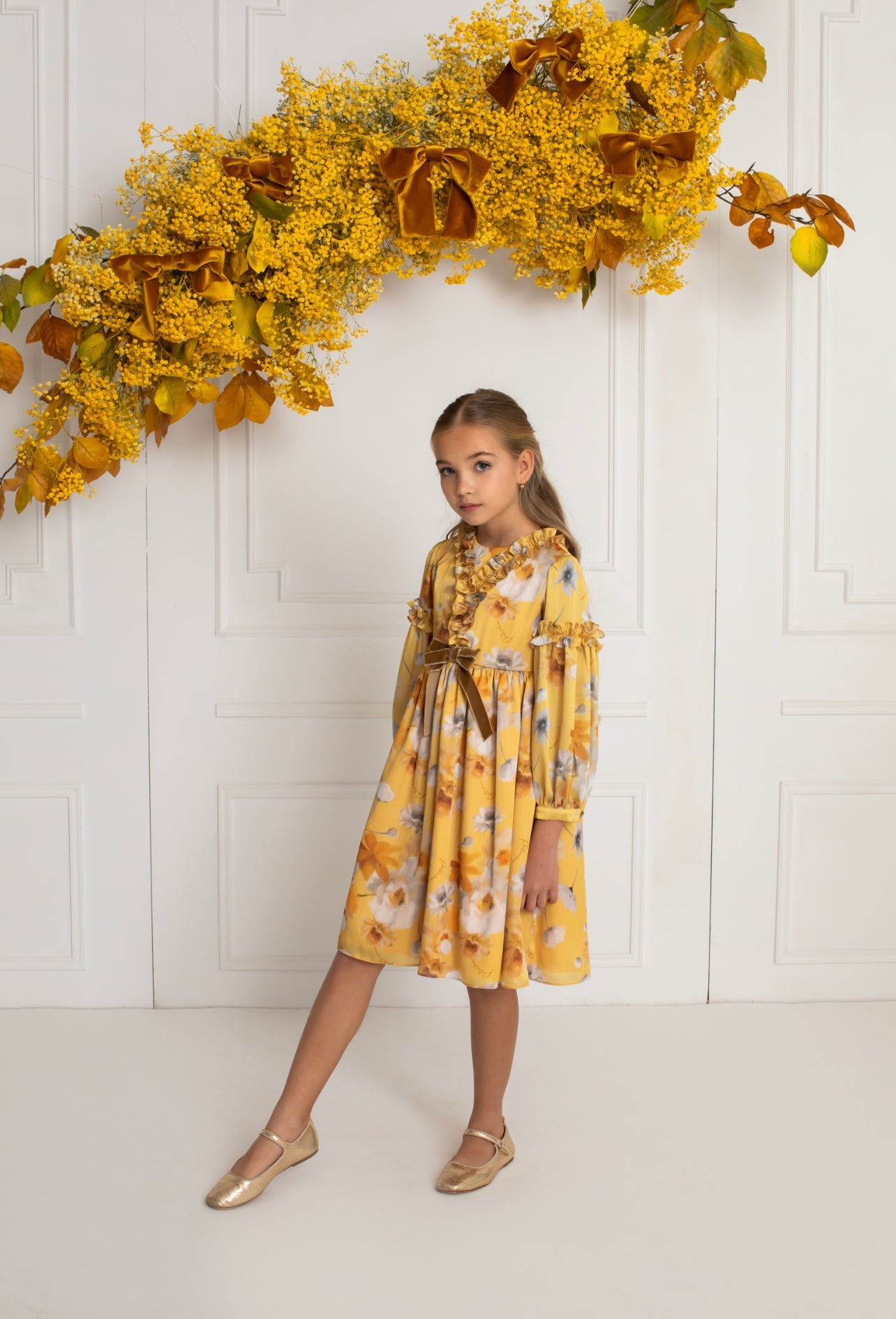 Beautiful Deep Yellow floral print chiffon dress with ruffle and Bow details.Beautiful,Classic and Feminine design that doesn't go out of style.