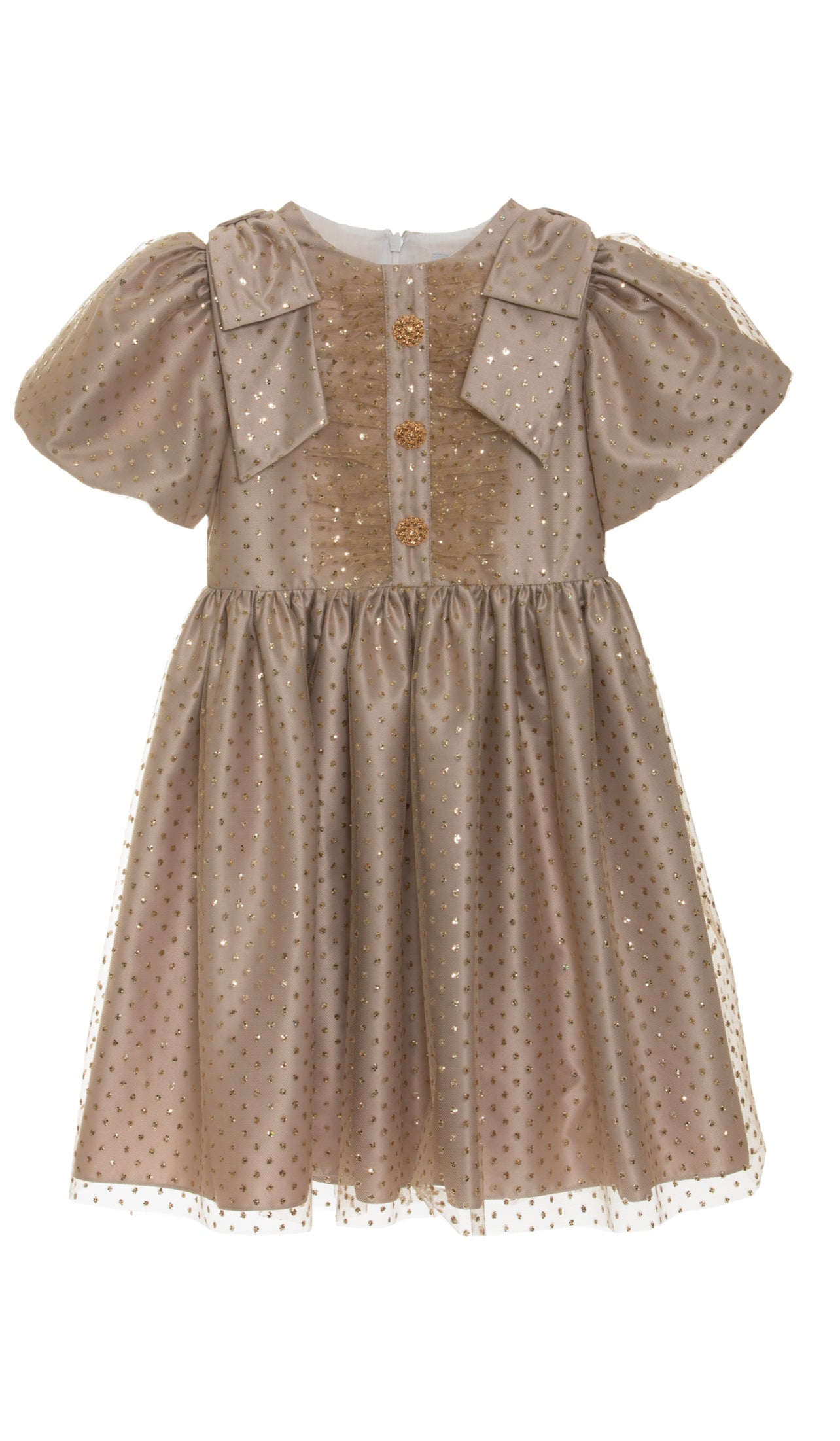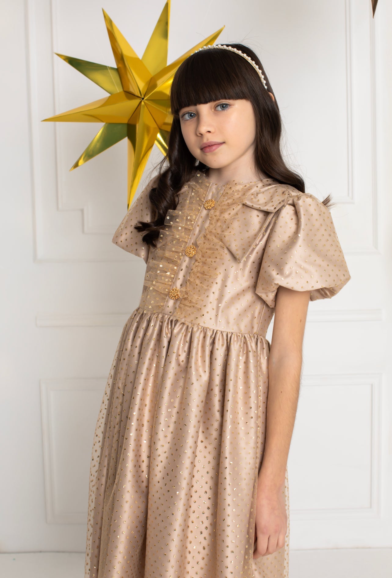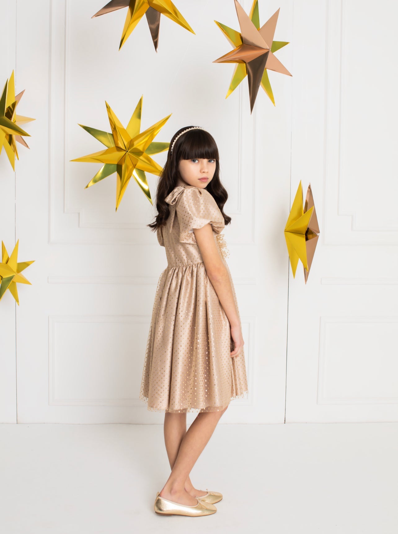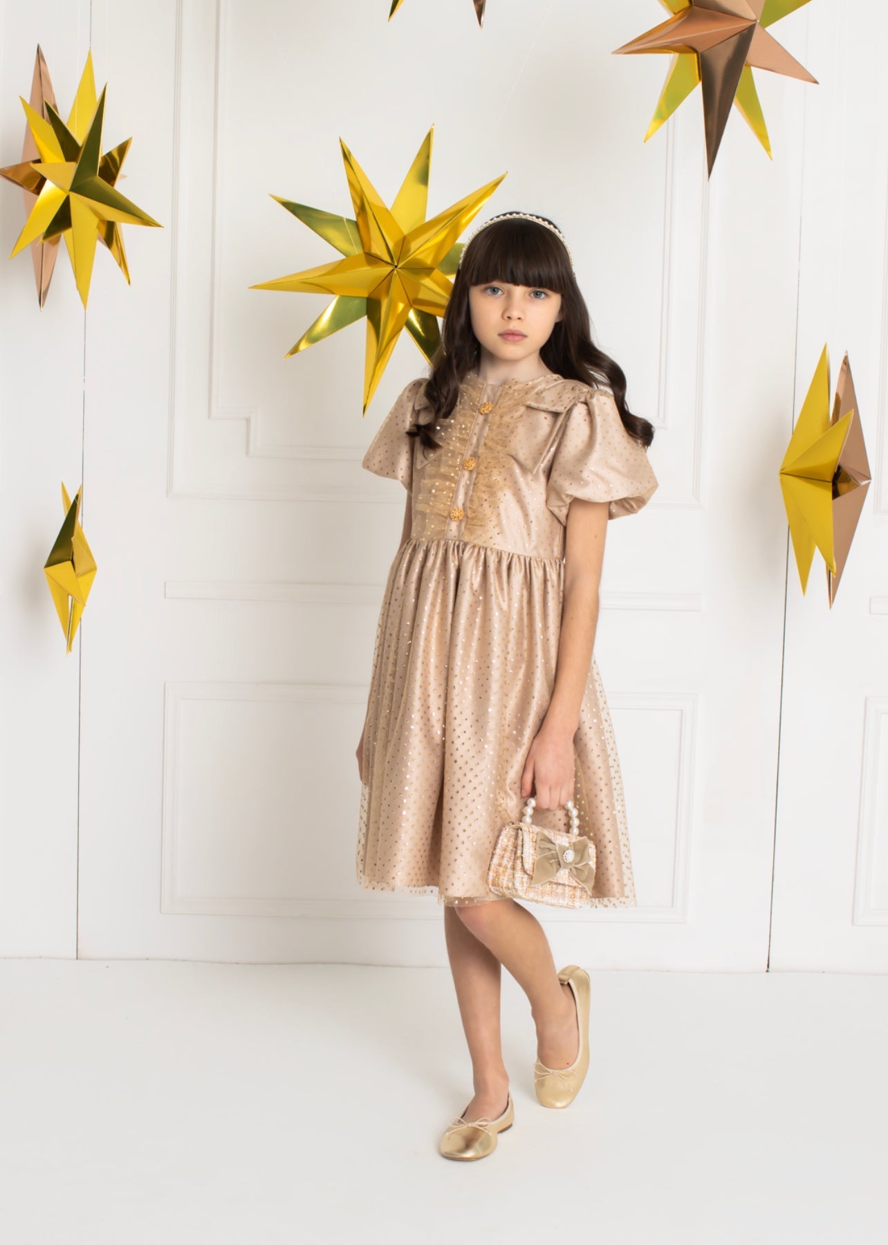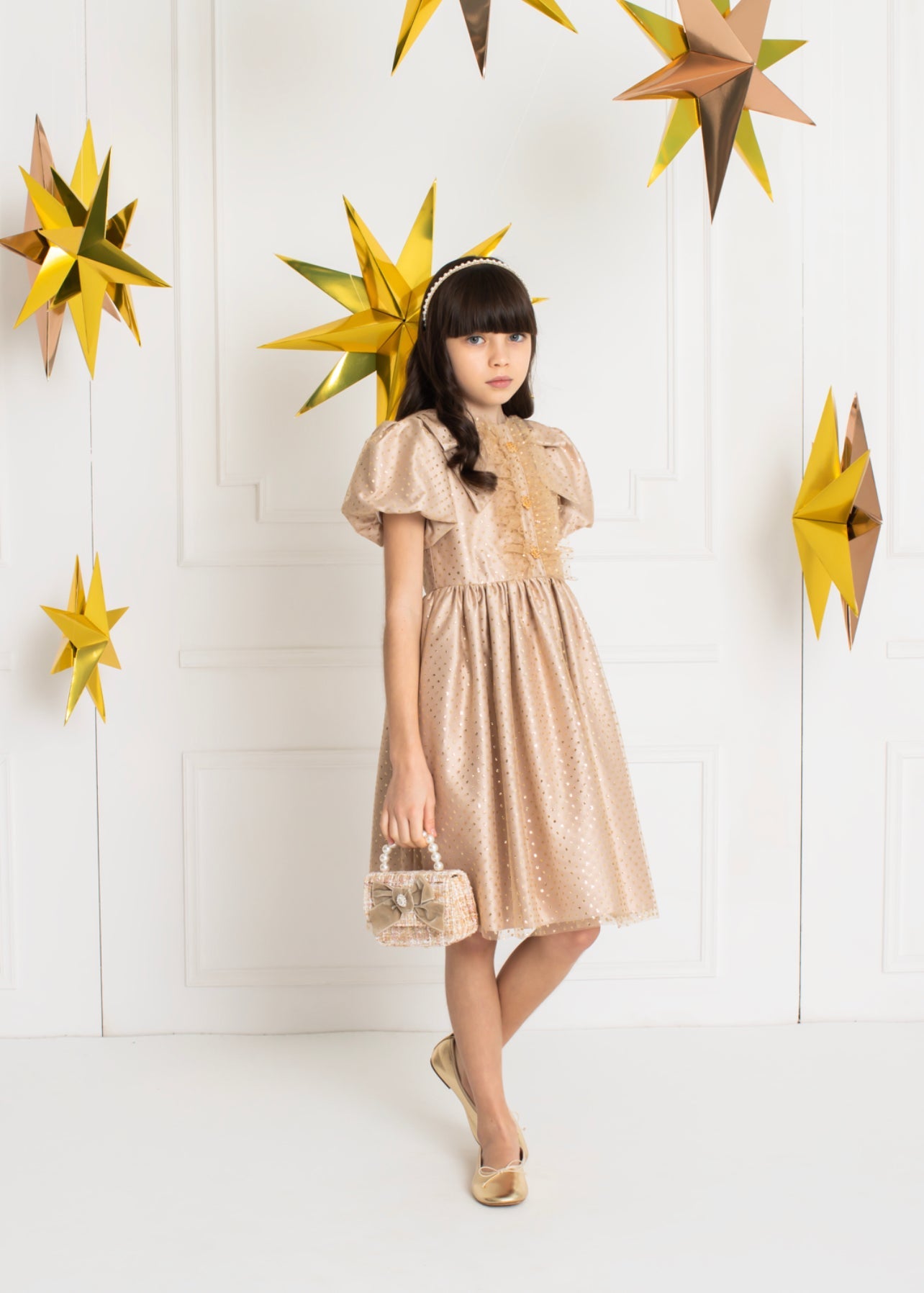 Beautiful Gold polkadot dress with ruffle and shoulder Bow details.Beautiful,Classic and Feminine design that doesn't go out of style.