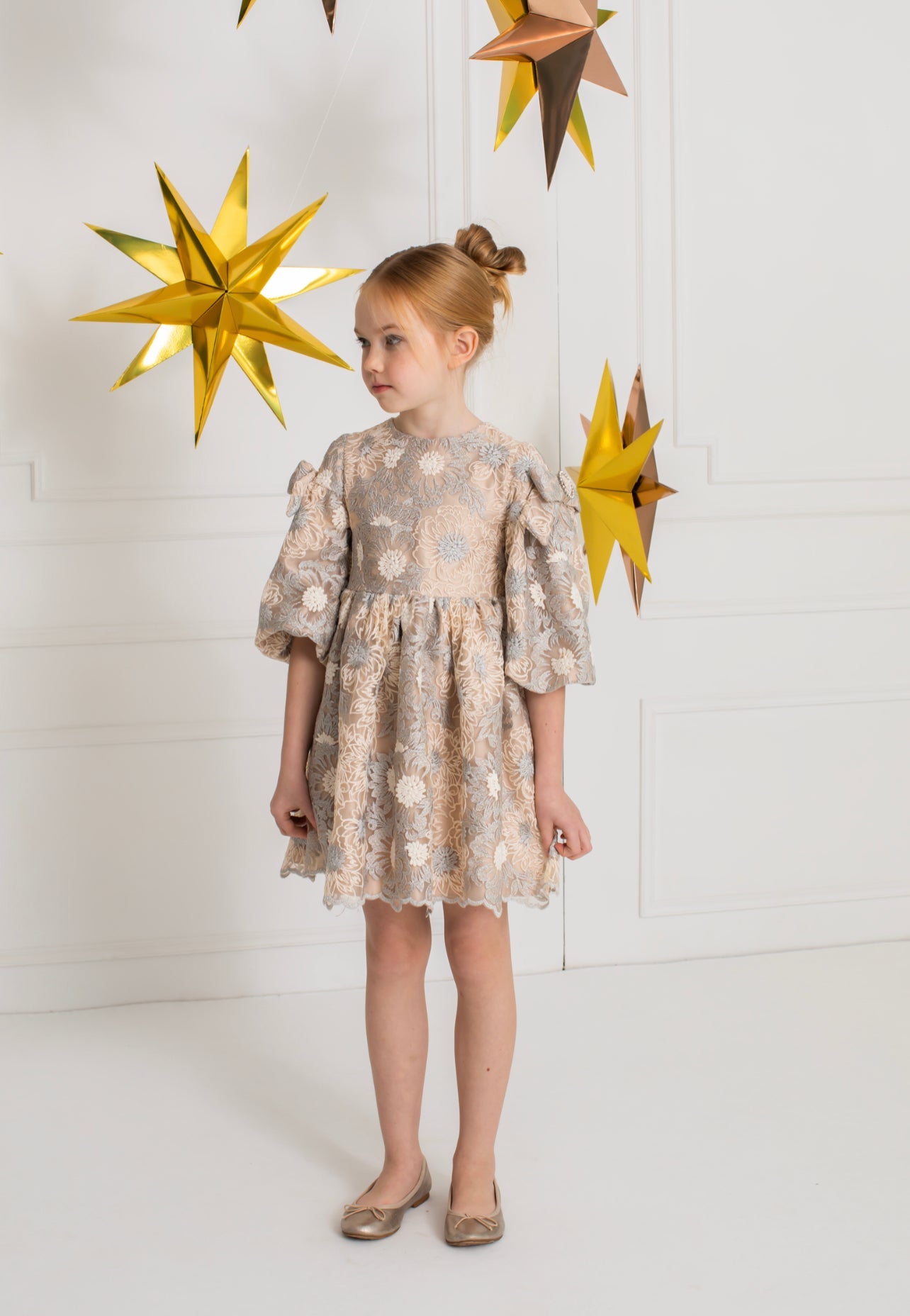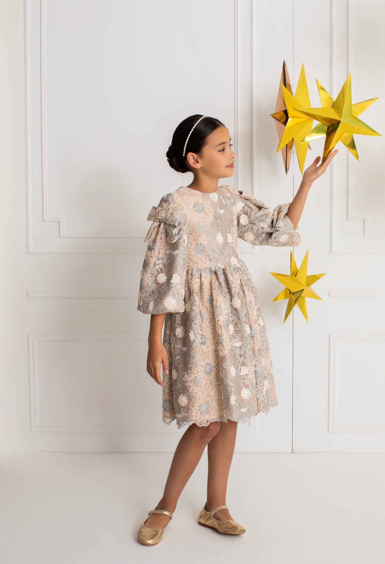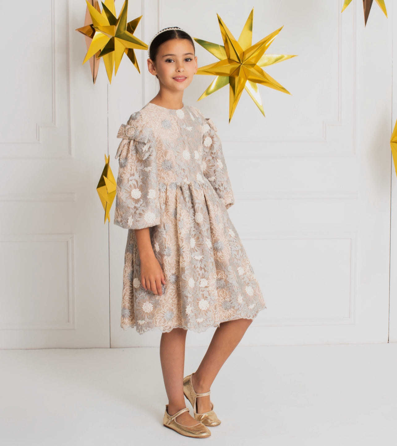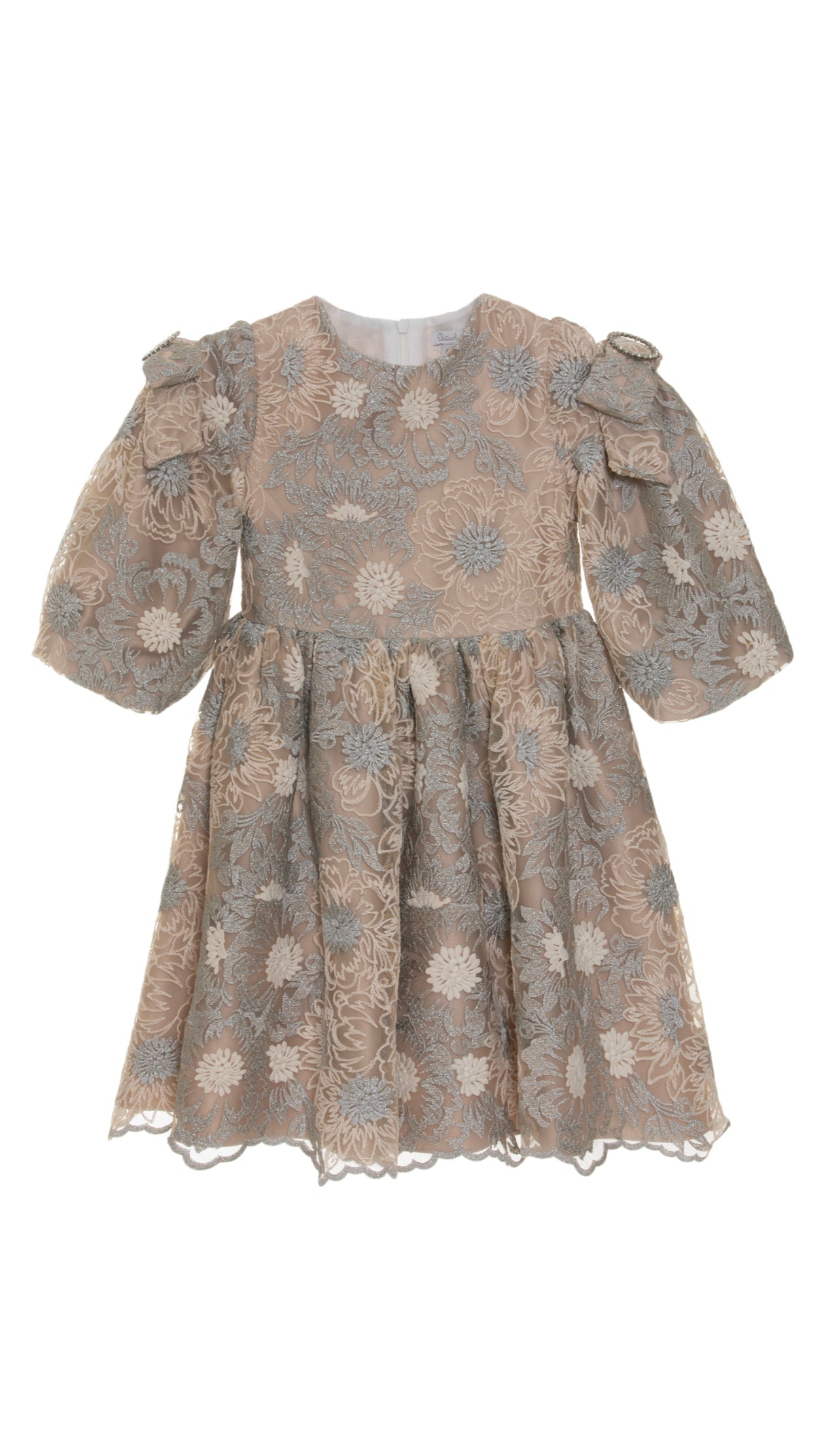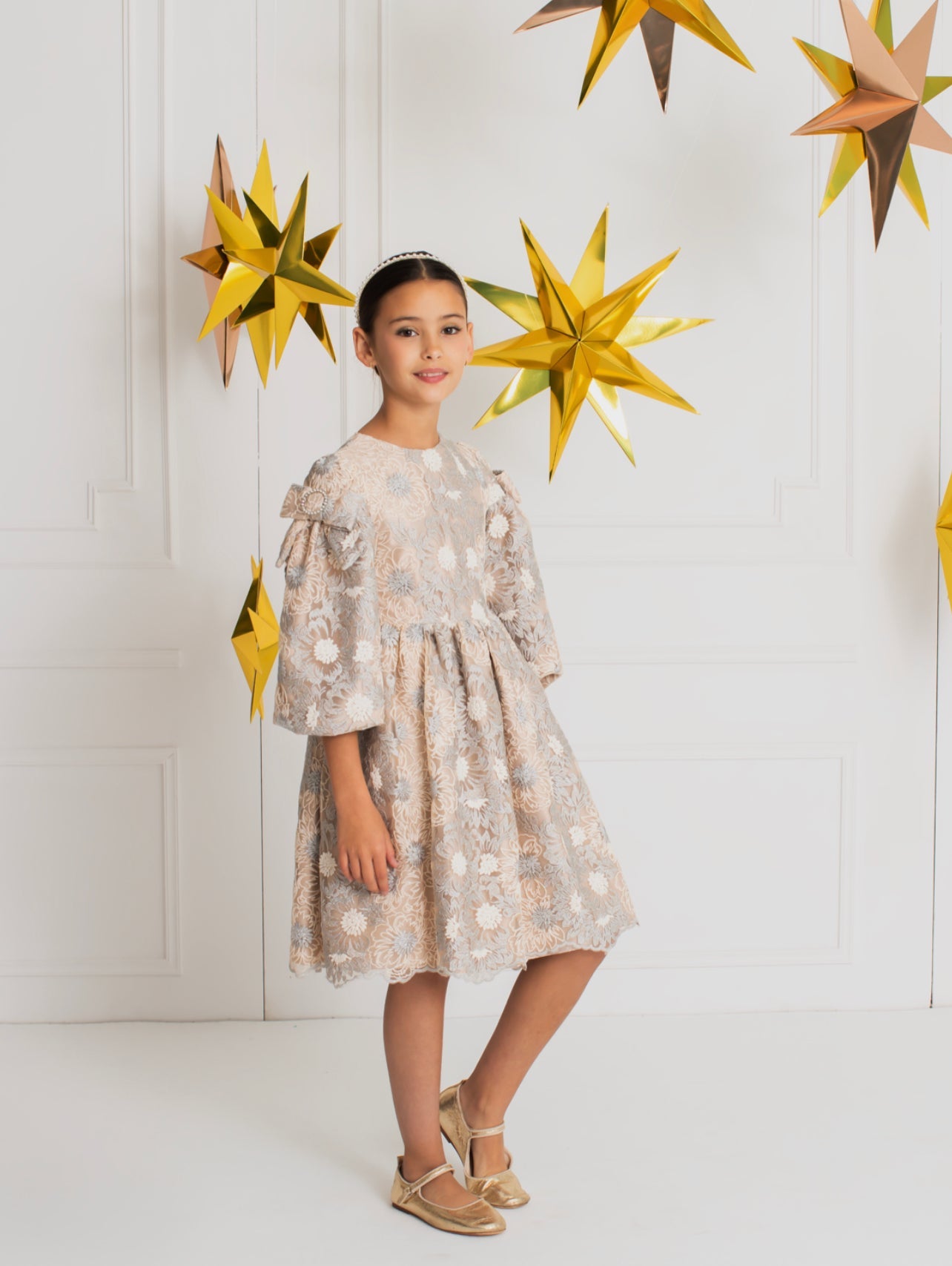 Beautiful Satin dress with delicate embroidered tulle details.Beautiful,Classic and Feminine design perfect for any special occasion.