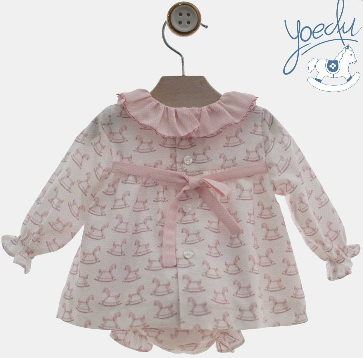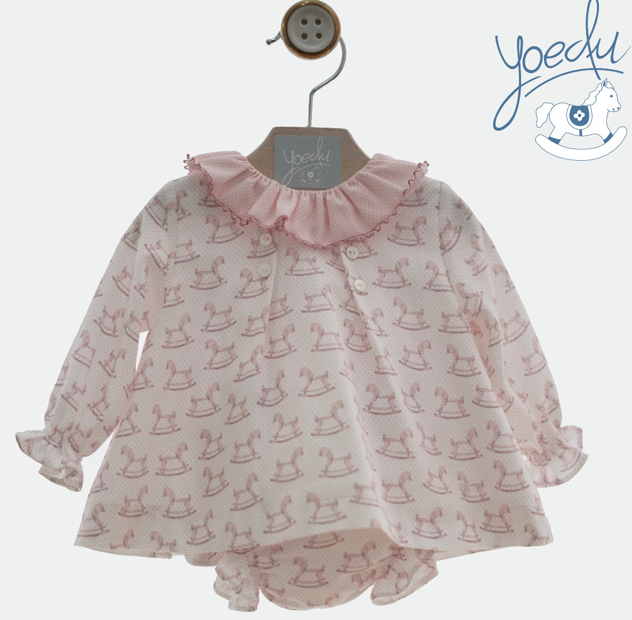 Beautiful Dress/Bloomers/Bonnet 3 piece set with rocking horse print